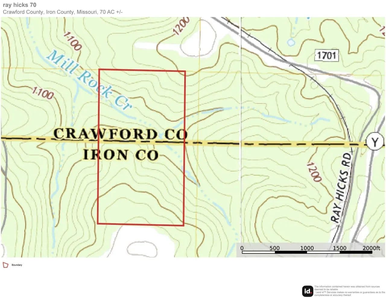 70 acres in Crawford and Iron County! This parcel has Mill Rock Creek going through it and a new access road. There are also multiple food plots to attract Deer and Turkey. Trails throughout for ATV riding and there is also a utility easement already in place. The property adjoins Mark Twin National Forest on TWO sides in case you need more to explore. The property has rolling hills and decent timber throughout and is minutes from Viburnum for gas and groceries. Property is also not from the Huzzah, Meramec, and Courtois waterways for fishing. Come take a look today!