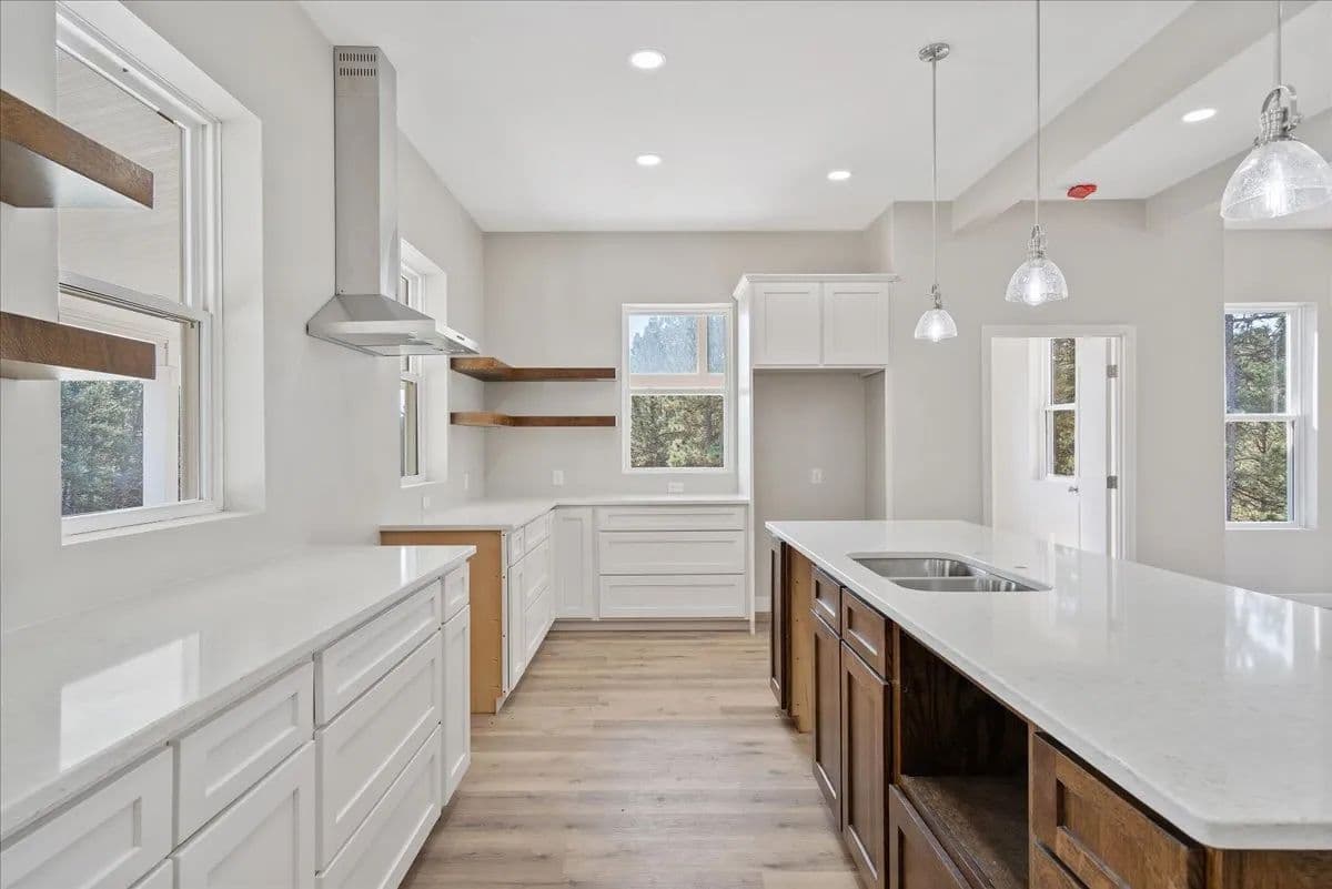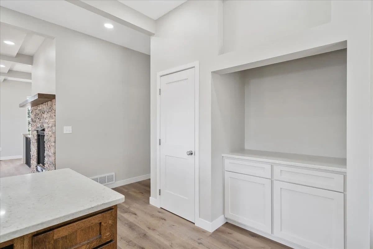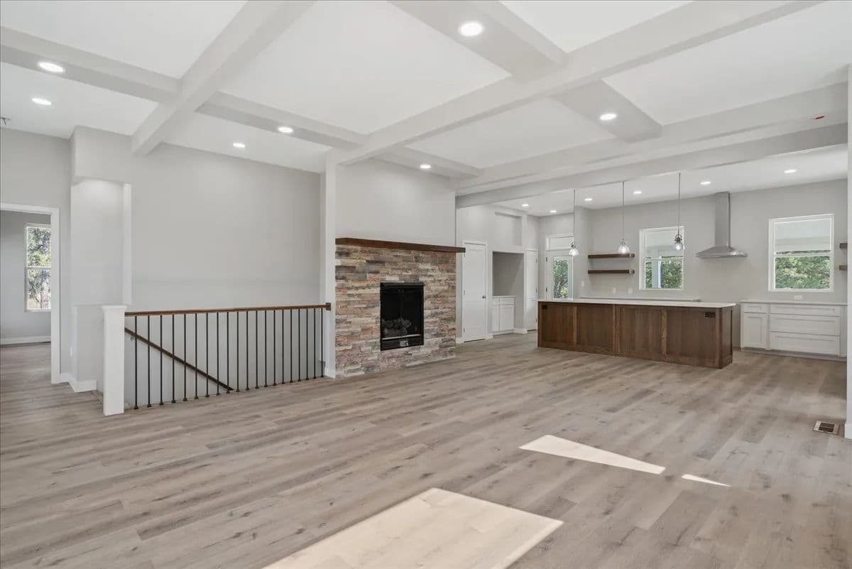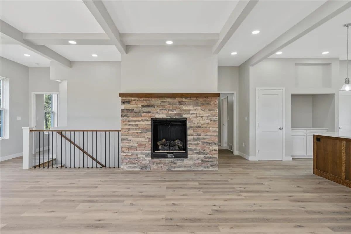 Living Spaces: Enter through the inviting wrap-around Trex deck into a sophisticated interior that exudes warmth and style. A charming coffee bar greets you to the right, perfect for morning routines or evening relaxation. The gourmet kitchen awaits to the left, adorned with custom white cabinetry, a gas stovetop oven, and an oversized fridge space. The centerpiece of this culinary haven is a stunning oak island bar with quartersawn oak trim, granite countertops, and pendant lighting. This space is perfect for culinary creations, casual dining, and entertaining guests. The open-concept kitchen flows seamlessly into an upstairs living room featuring coffered ceilings, an abundance of windows that flood the space with natural light, and a striking stone wall with a gas fireplace, creating an ambiance of warmth and elegance.