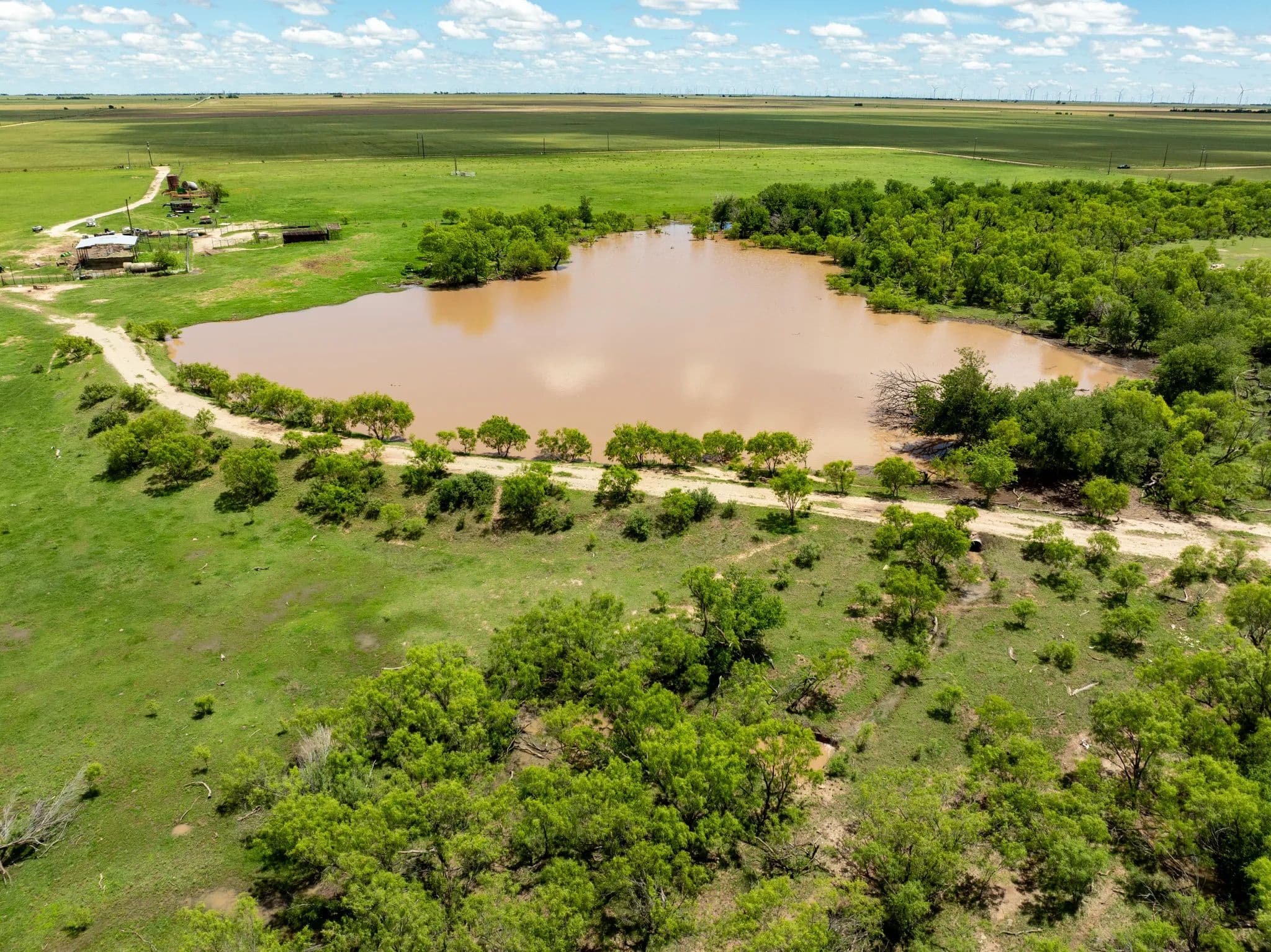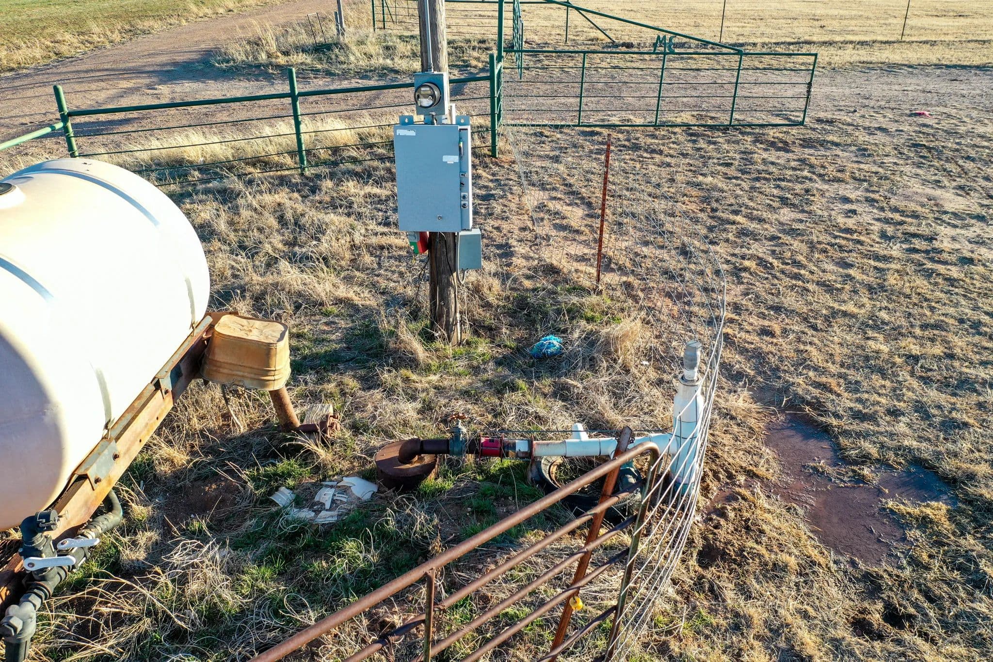 There are 4 water wells in total that can be used with the pivot to water the 40 acres. There is one well that is setup to be used for irrigating ~18 acres of grass with pods.