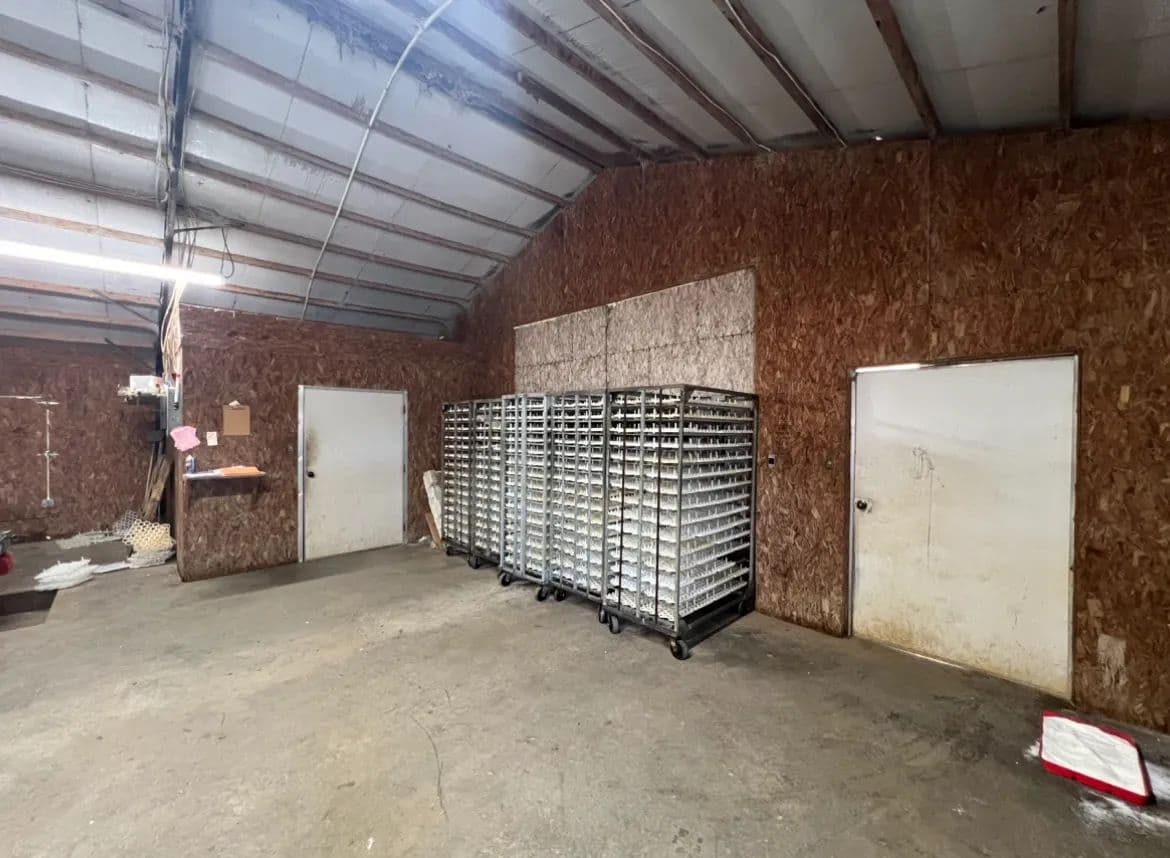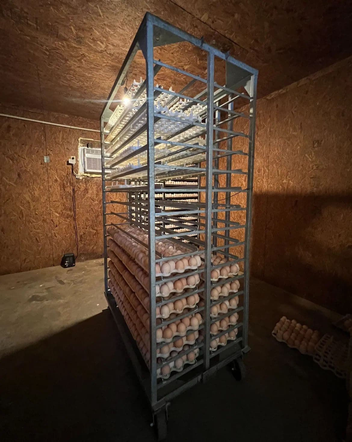 * A large temperature-controlled egg room with cooling units supports daily operations.