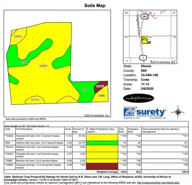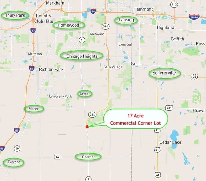 This 17 acre corner lot is located just north of the Village of Beecher in Crete Township along Illinois 394 at Dixie Highway (US 1). The property has a PI index of 109.6 and is mostly Ozaukee silt loam and Ashkum silty clay loam.