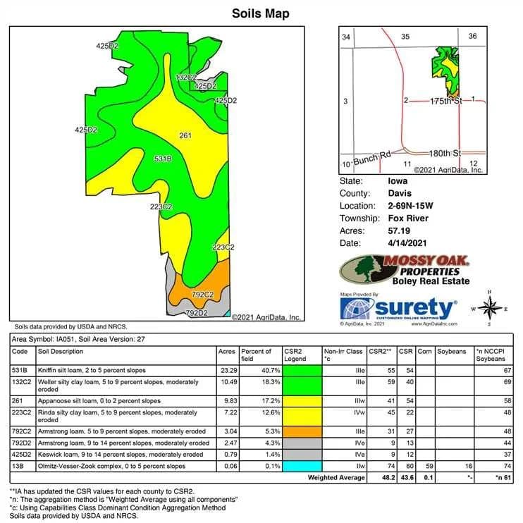 65 +/- Acre Farm for Sale in Davis County, Iowa. This property is located between Unionville, IA and Drakesville, IA right off a hard surface road. There are approximately 57 FSA indicated tillable acres with an average CSR value of 43.6 and average CSR2 value of 48.2! The 2021 crop year is open and will be available up until around June 1 and can be negotiated with current owners. The farm is being sold as one tract but is currently owned by two family members.