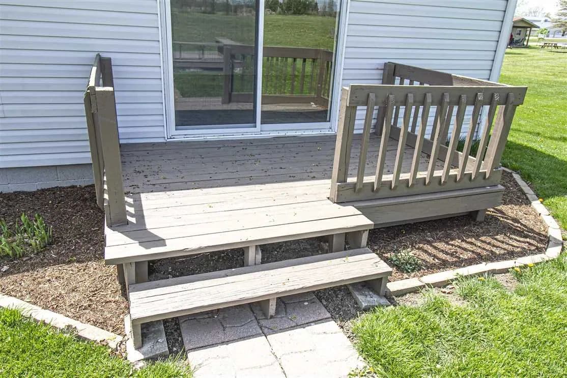 - Deck, concrete patio, and wooden sitting area for entertaining