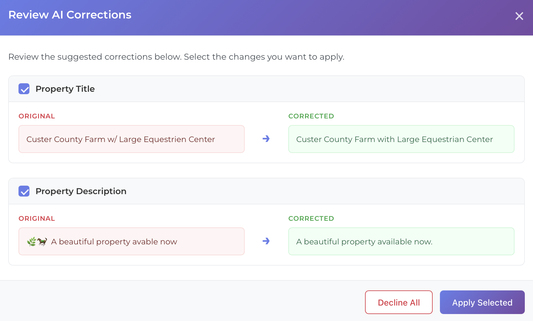 The Land Broker Co-op has launched Review with AI, a new built-in tool powered by our Land AI Agent that automatically reviews and improves your property listings before they go live. With a single click, the feature scans your Property Title and Property Description to correct spelling mistakes, grammar errors, punctuation issues, and common typos. It also identifies and removes special characters—such as emojis—that can interfere with properly syndicating listings across our site network. The result is cleaner, more professional listing content that saves time, reduces manual edits, and helps ensure your listings display consistently everywhere they appear.