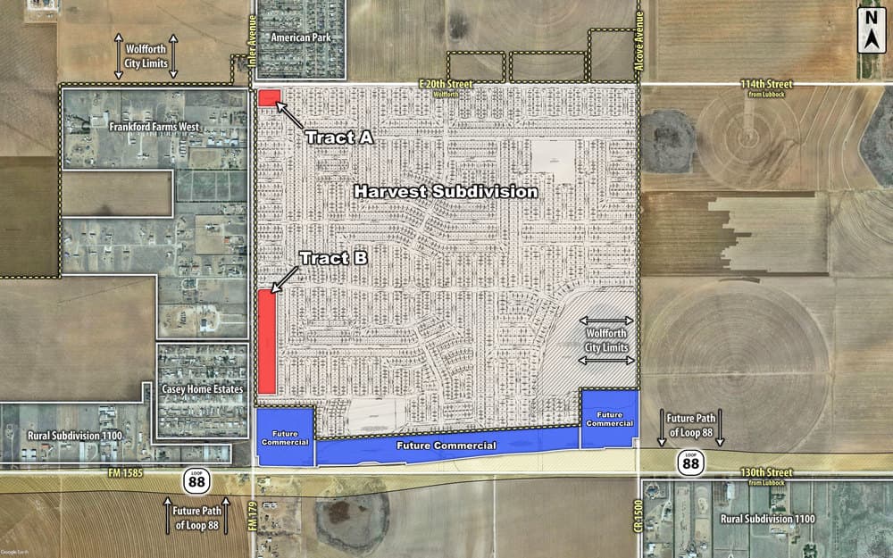 Large development tracts in Betenbough’s latest residential subdivision, Harvest. Harvest offers quality and affordable new homes in Frenship ISD. This 500 acre and 2,500 homesite subdivision will bring themed community parks and gathering spaces, making Harvest one of the best neighborhoods for families looking for community in Lubbock. Coldwell Banker Commercial is pleased to offer 11 acres for commercial development in Wolfforth’s newest subdivision. All utilities have been brought to site and commercial development is ready.