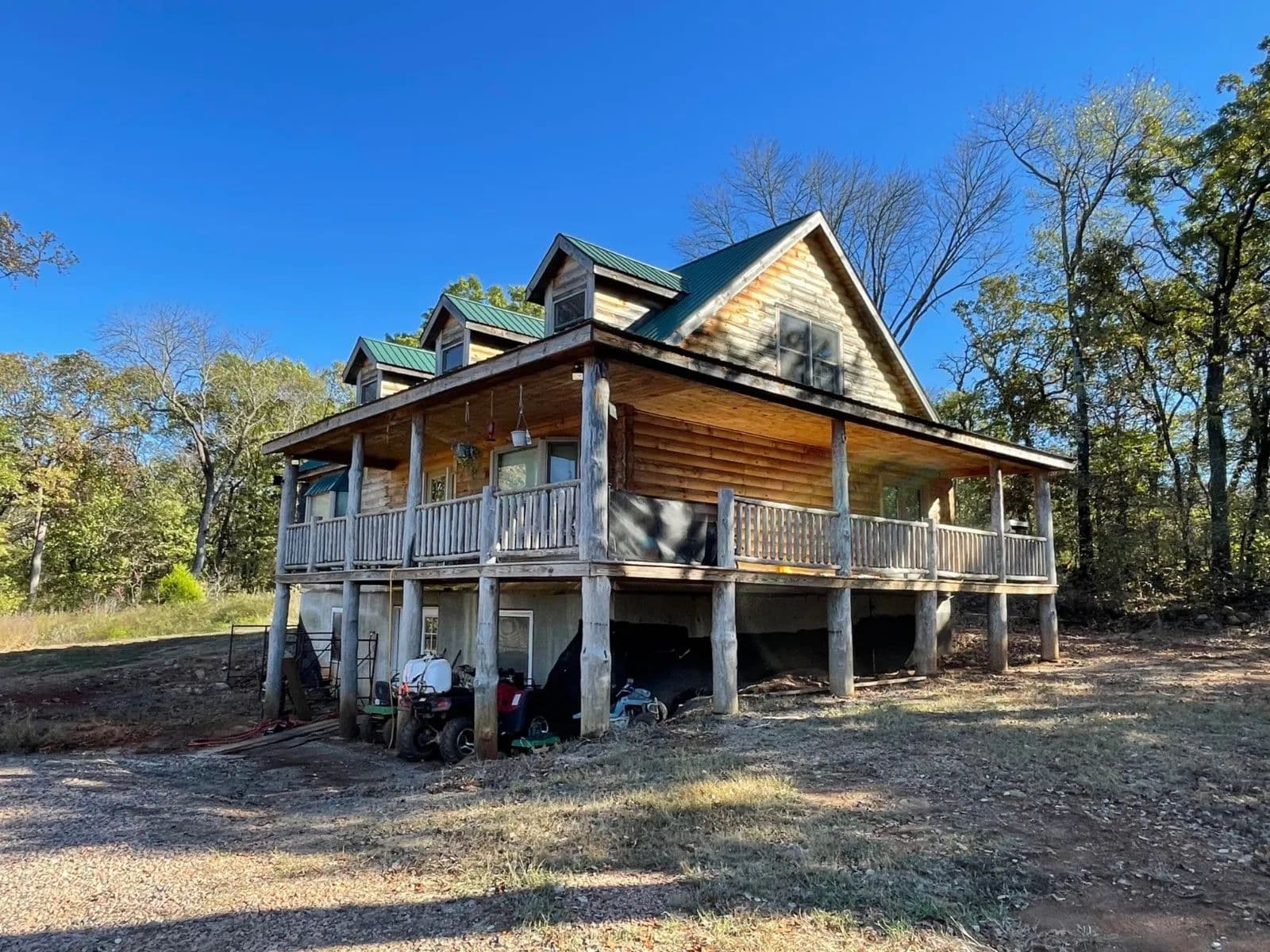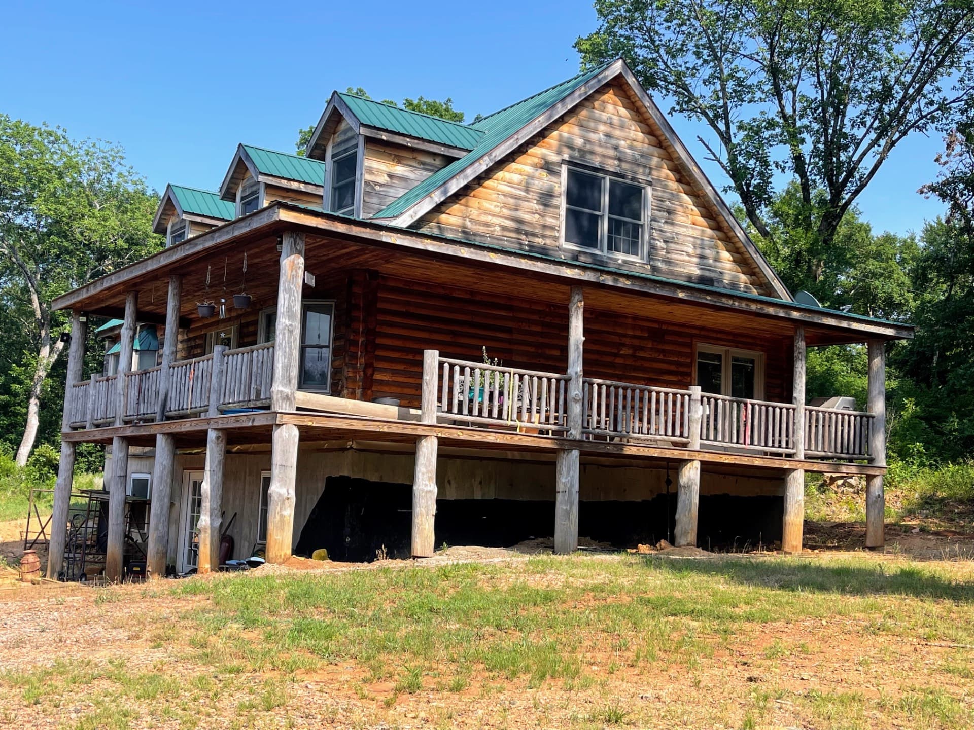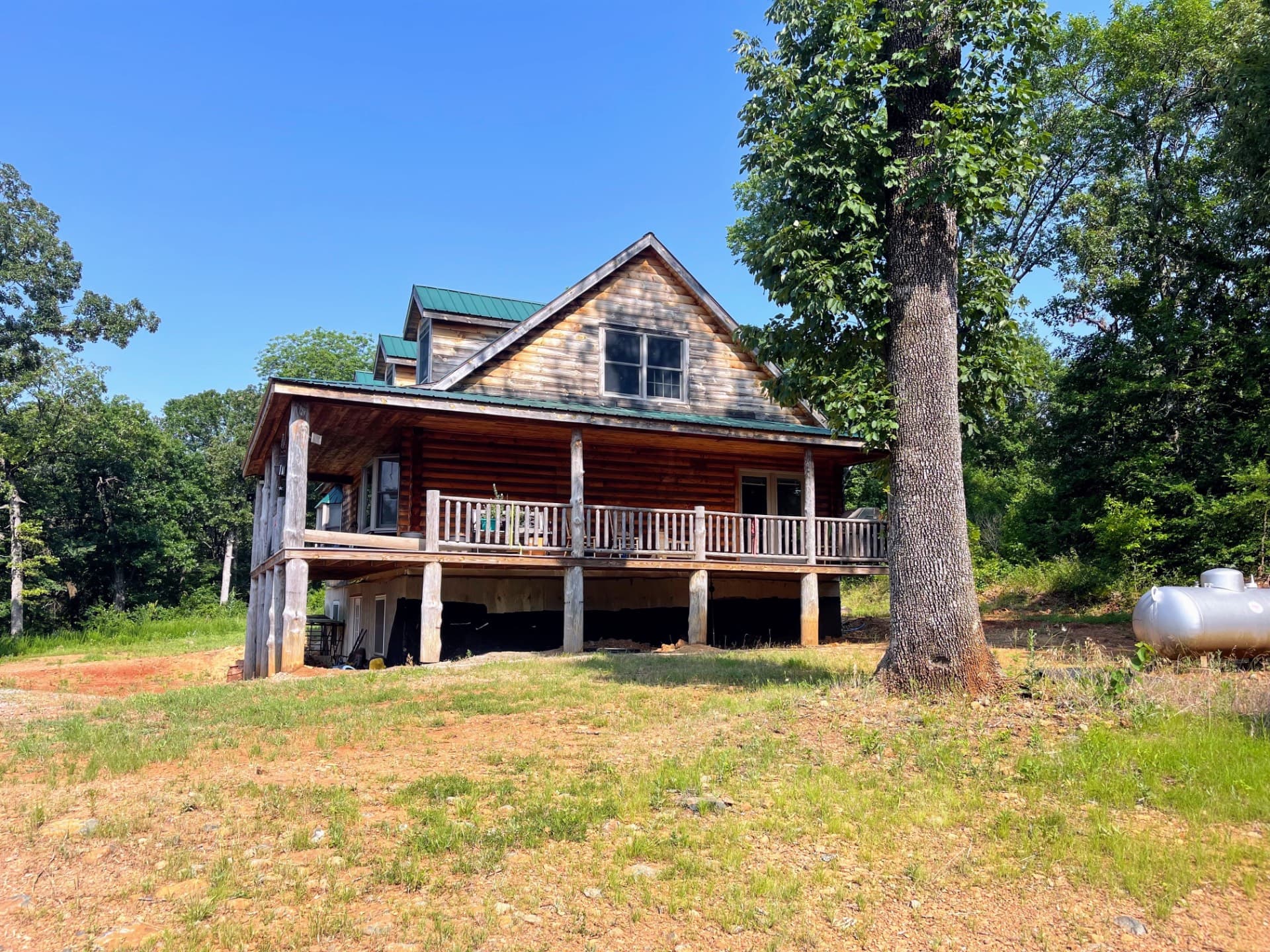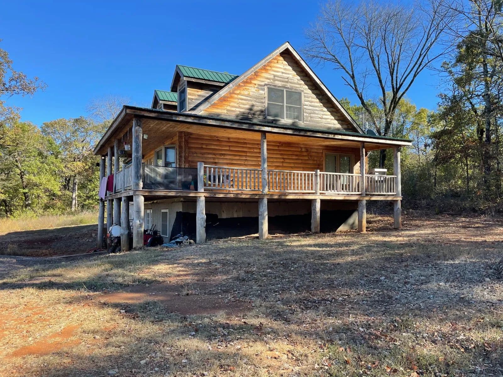 Beautiful Log Cabin on 67.77 wooded acres. Very peaceful and private with a long driveway. This is a custom built E-Log home that is currently about 85% finished. There are two bedrooms and a bathroom on the top floor that is only framed in. The home will need added insulation. A walk out basement is on the ground floor that has a poured concrete foundation. A stairway takes you up to the main floor where you will find a Living Room, open Kitchen, Dining Room, Bathroom with Laundry and the Master Bedroom with a master bath. French doors in the dining room lead you out to the wrap around covered porch for amazing views of the trees and pond with a little clearing of some overgrown brush. The counter tops in the open concept kitchen are Corian with GE appliances that stay, there is even a trash compactor. The laundry room is off from the kitchen with a bathroom in it also. Log homes are hard to come by because of the cost to build. This is a true log home! The outside will need to be treated and resealed. There is a lot of opportunity to finish this beautiful home and have a really nice place. The woods that surround hold many deer and wildlife and would make excellent hunting. The trees are mature and tall and Rock Creek runs through the property. It is Partially fenced with an automatic gate at the entrance. With some building material that was purchased but never used being left for the new owner, This home is ready to finish out your way!
