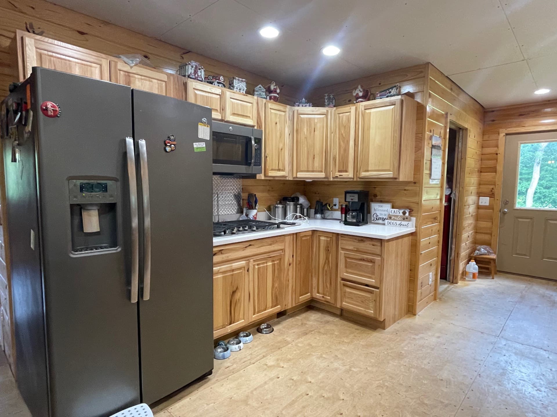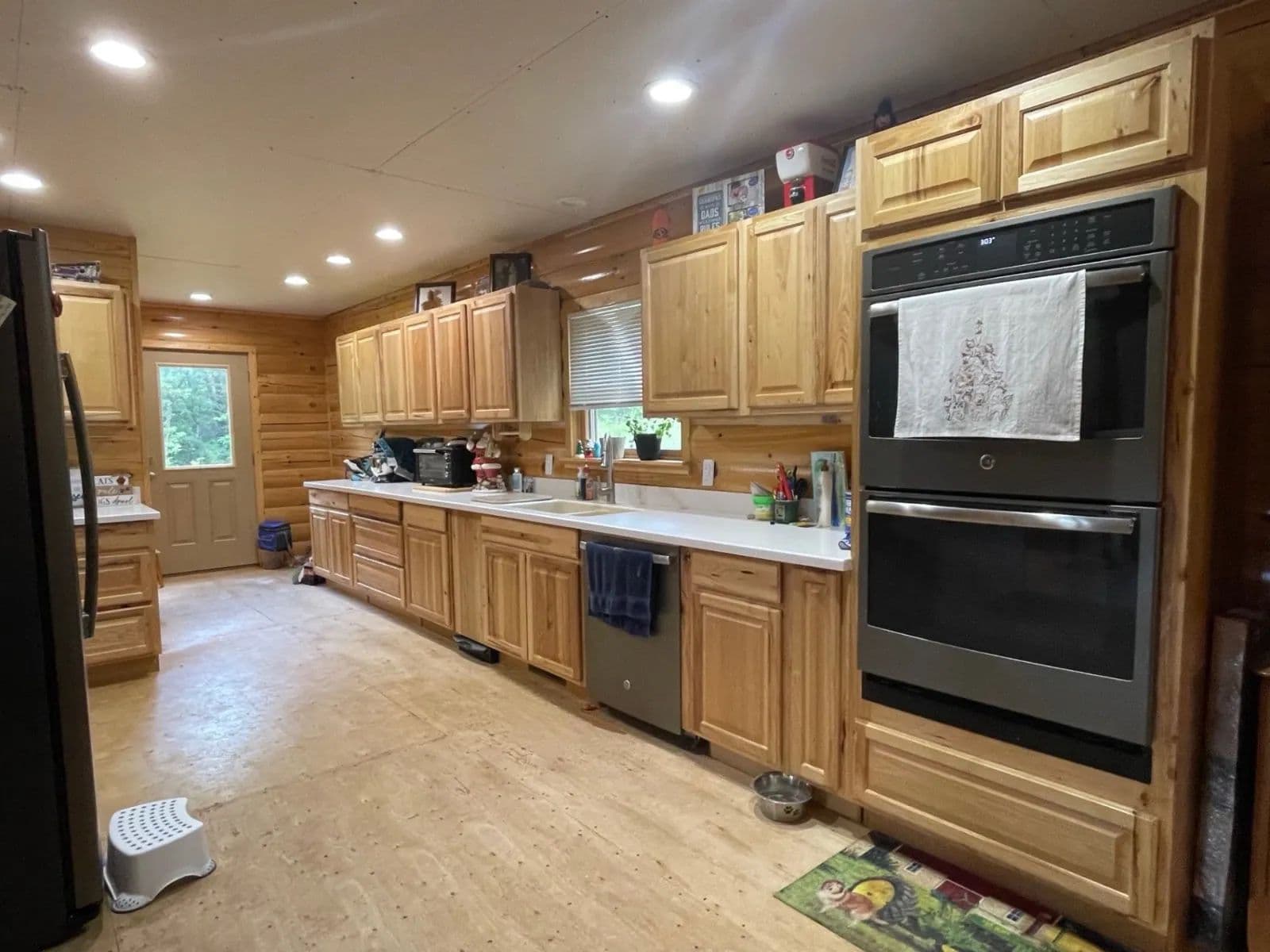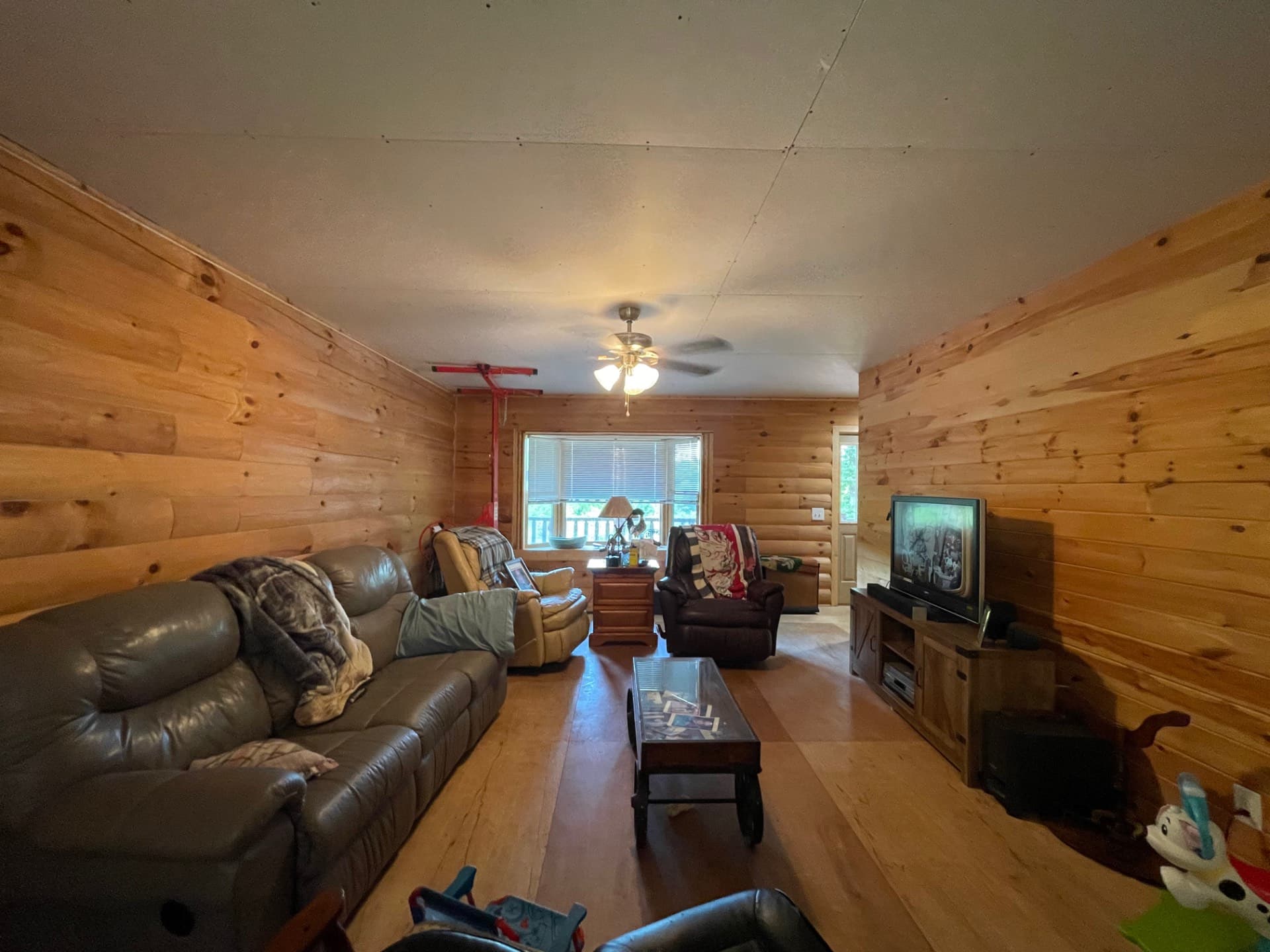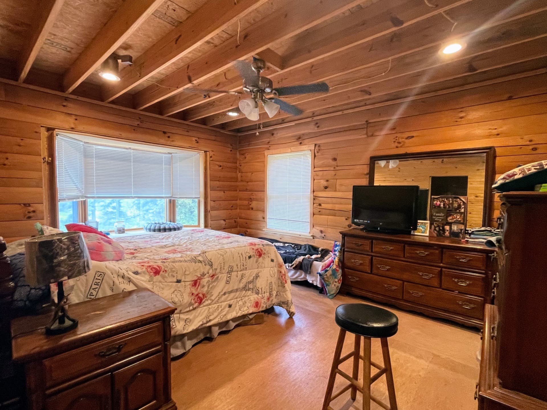 Beautiful Log Cabin on 67.77 wooded acres. Very peaceful and private with a long driveway. This is a custom built E-Log home that is currently about 85% finished. There are two bedrooms and a bathroom on the top floor that is only framed in. The home will need added insulation. A walk out basement is on the ground floor that has a poured concrete foundation. A stairway takes you up to the main floor where you will find a Living Room, open Kitchen, Dining Room, Bathroom with Laundry and the Master Bedroom with a master bath. French doors in the dining room lead you out to the wrap around covered porch for amazing views of the trees and pond with a little clearing of some overgrown brush. The counter tops in the open concept kitchen are Corian with GE appliances that stay, there is even a trash compactor. The laundry room is off from the kitchen with a bathroom in it also. Log homes are hard to come by because of the cost to build. This is a true log home! The outside will need to be treated and resealed. There is a lot of opportunity to finish this beautiful home and have a really nice place. The woods that surround hold many deer and wildlife and would make excellent hunting. The trees are mature and tall and Rock Creek runs through the property. It is Partially fenced with an automatic gate at the entrance. With some building material that was purchased but never used being left for the new owner, This home is ready to finish out your way!