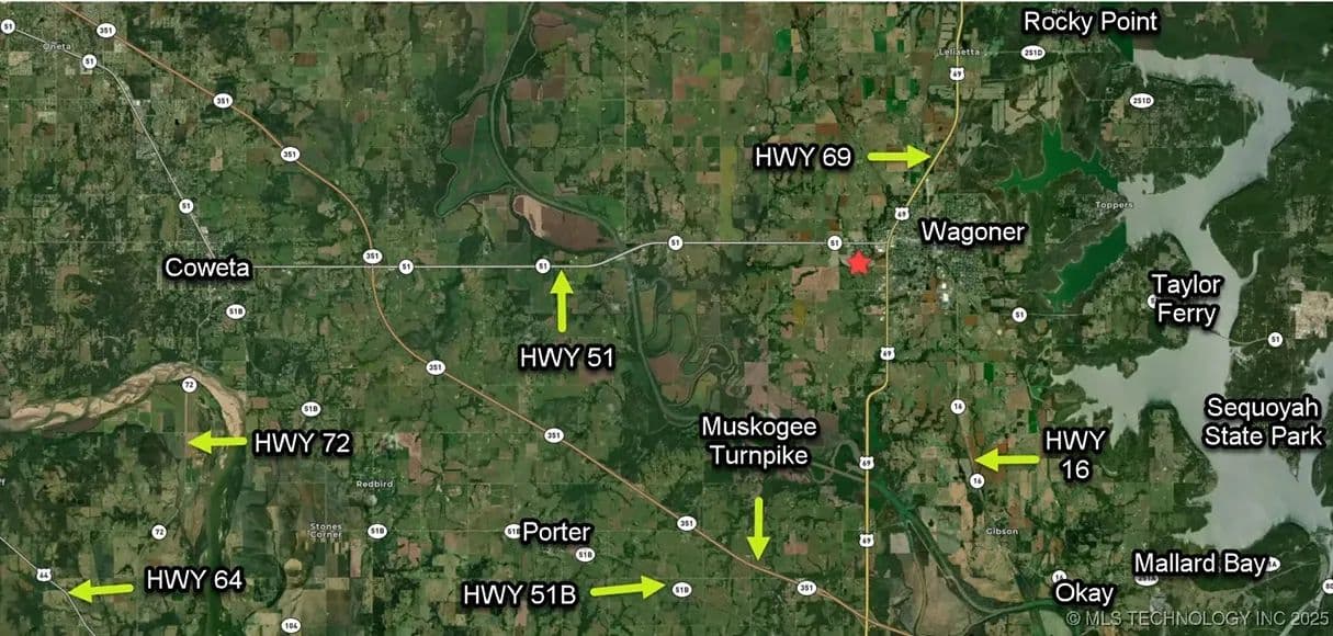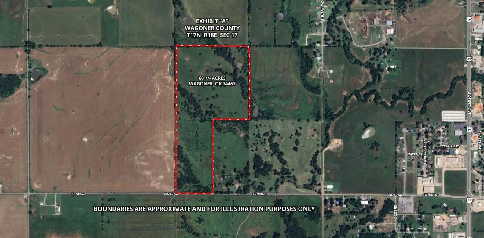 60 +/- ACRES WITH PRIME DEVELOPMENT POTENTIAL LESS THAN 2 MILES FROM DOWNTOWN WAGONER! Located on a well-maintained county road just within city limits, this large tract offers a rare opportunity for developers, investors, or families looking to build a private estate. With huge swaths of cleared, flat land and scattered tree lines for privacy and shade, the property is set up well for a wide range of uses—from a single estate home or family compound to a multi-lot subdivision or hobby farm. Just 1 mile off HWY 51, 1.5 miles from HWY 69, and under 2 miles to downtown Wagoner and Wal-Mart, the site offers fast access to shopping, schools, and services while still providing the space and freedom of country living. It’s also only 13 miles to Coweta, 14 miles to Muskogee, 21 miles to Broken Arrow, and just 35 miles to Tulsa. For commuters or buyers looking to stay close to major job markets, this spot checks the boxes. Fort Gibson Lake is only 5 miles away, with the Verdigris River and Arkansas River also within a short drive. Whether you're into boating, fishing, hunting, or simply enjoying open space, this location puts you close to it all. The land’s partial tree coverage provides habitat for wildlife, while the flat, open ground makes it ideal for grazing livestock or starting a ranch. If you're thinking about subdividing, this property is in a high-demand area surrounded by quality estate homes, and Wagoner County now allows single-entry subdivisions with the proper zoning. Investors and developers should explore the potential, especially given the limited availability of large tracts this close to town. With its strategic location, usable terrain, and flexible potential, this is a solid buy for anyone looking to develop, invest, or build a legacy property. Call today to schedule a showing and see what makes this 60 +/- acre property a standout opportunity in Wagoner. Buyer’s agents welcome.
