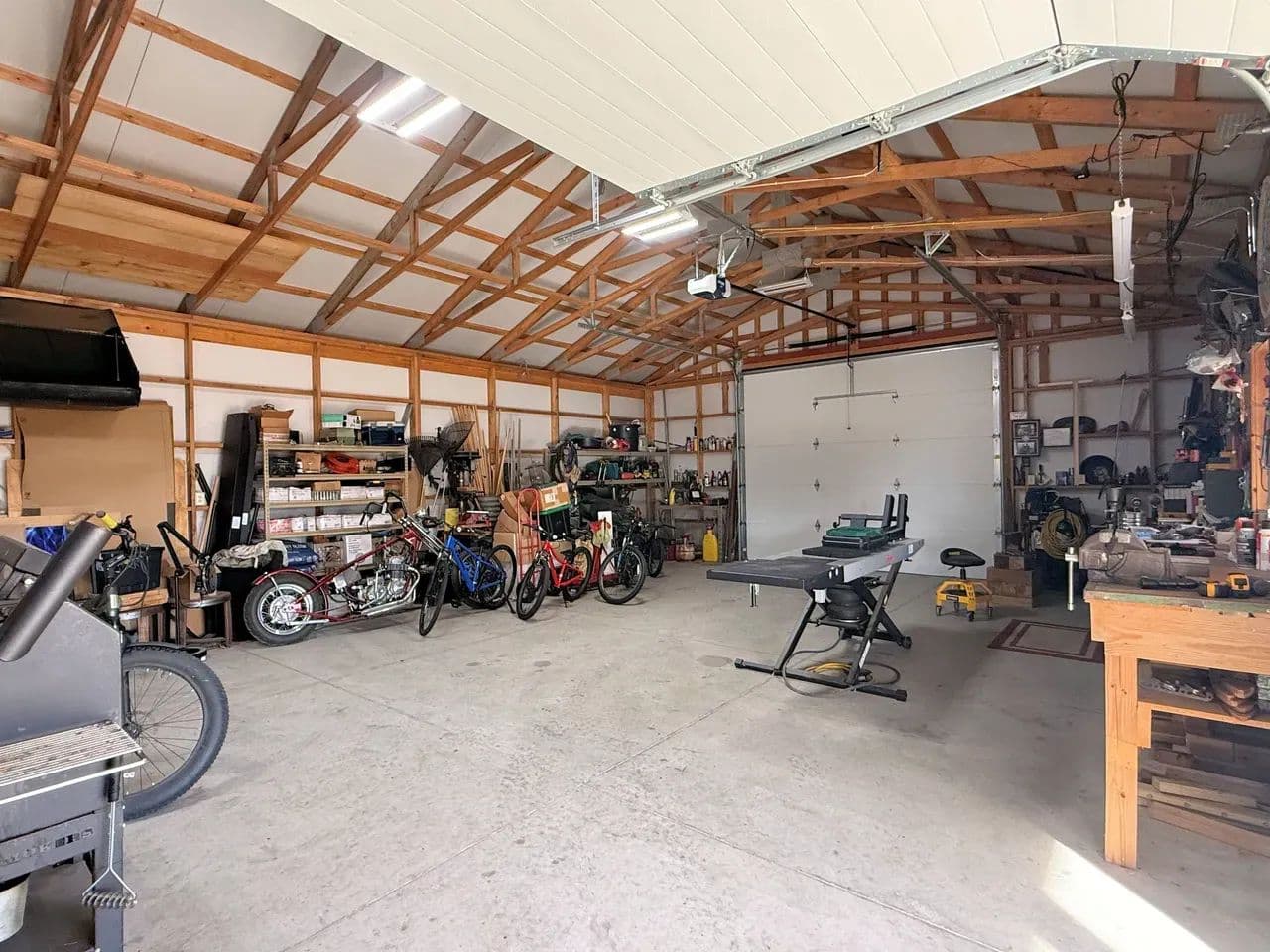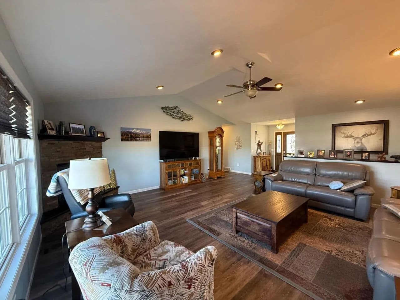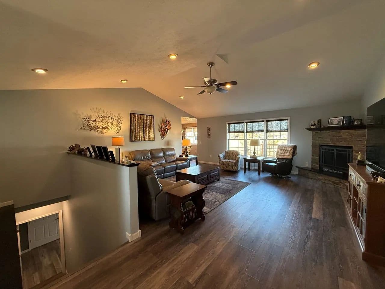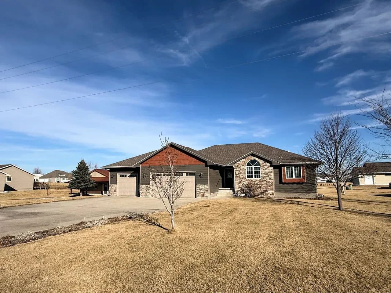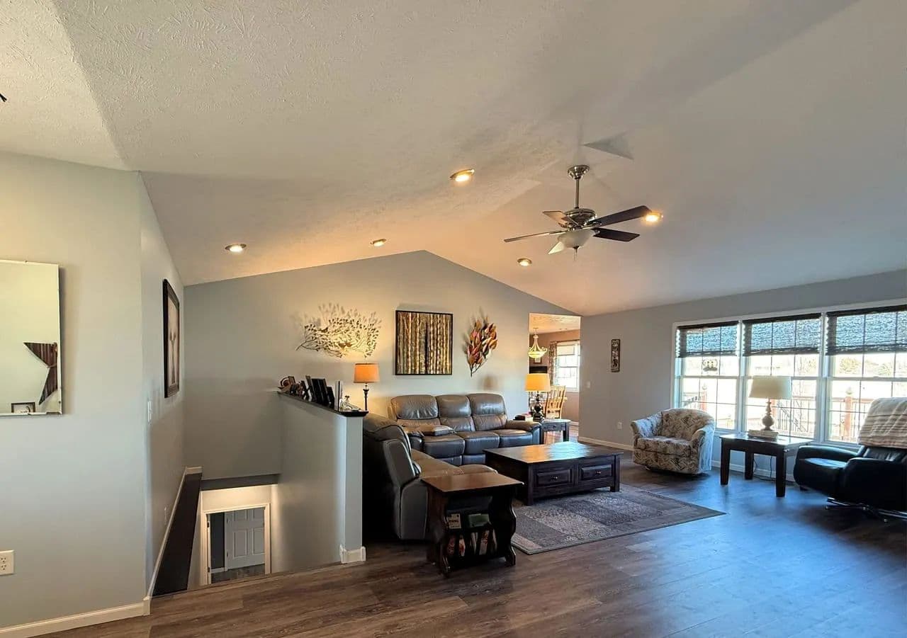 Here is a modern, move-in-ready home. The main level offers three large bedrooms and 2 1/2 baths. The master suite has a whirlpool tub, a shower, and a large walk-in closet. The spacious living room boasts vaulted ceilings and a gas fireplace. The kitchen offers stainless steel appliances, hardwood oak cabinets, a pantry, and a dining area ideally situated to watch the morning sunrise. Just off the kitchen you will find the main floor laundry room and a 1/2 bath. Exiting the kitchen you enter the oversized attached three-car garage, which is completely finished and includes a workshop area.The lower level of the home consists of a fully finished basement with a huge family room, two bedrooms with egress windows, a 3/4 bathroom, an expansive storage room, a storm shelter, and a wood stove that adds character and warmth. The home has an electric heat pump with central A/C, newly installed in 2024.