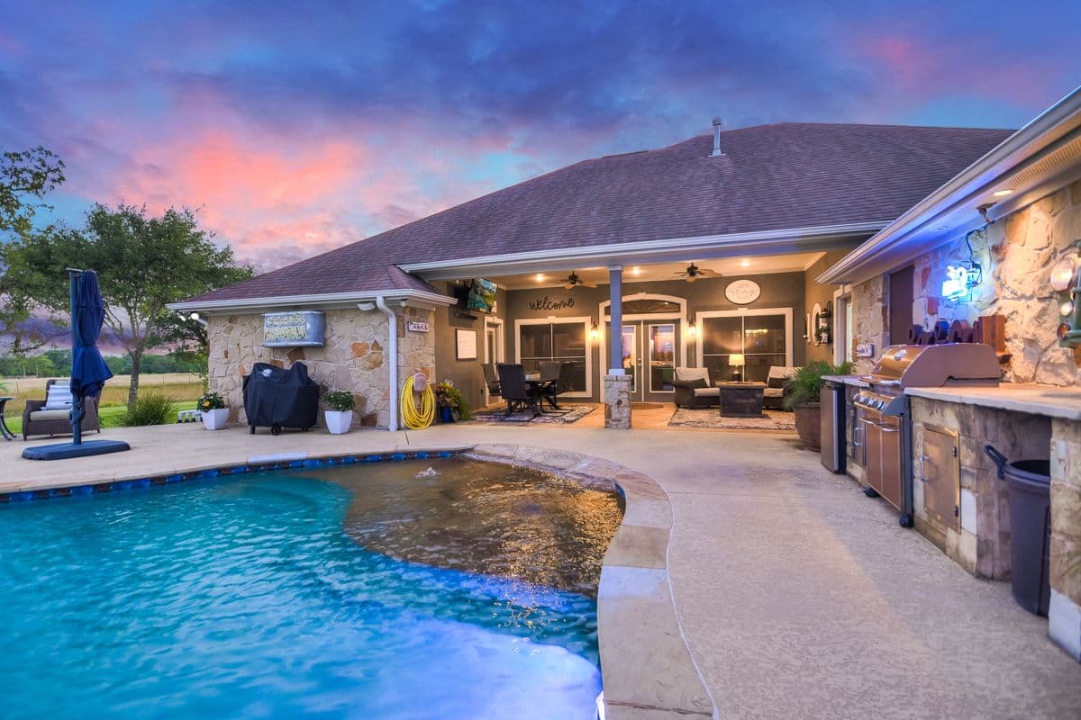 Pristine Country Estate! ~ Pride of ownership is evident on this immaculate property. Gated entrance with manicured 10 acres located on a quiet country road between the historic towns of La Grange and Smithville. This lovely custom home features Cantera columns at the entrance and foyer to welcome you, an office/study with built-ins, a formal dining room, a charming kitchen with antique finished cabinets and Silestone counters, stained concrete floors, and an open floor plan. The primary suite has access to the covered patio and pool. The outdoor oasis is ideal for entertaining family and friends with a gorgeous sparkling, heated salt pool with a terraced rock waterfall, an outdoor kitchen, a covered patio with room for additional seating, and al fresco dining areas. Custom solar screens, a gas log fireplace with heatilator, and extra insulation make a huge difference in utility bills and energy efficiency! The 40x60 barn is decorated with a variety of collectible vintage signs and includes an office with a full bath, a workshop area, 2 - 18 foot overhead doors, an RV carport with full hook-ups, 110, 220, and 50 amp electrical, insulated and is perfect for the automobile enthusiast, equipment storage or collector, and could also be converted to guest quarters. 3 acres of professional irrigation system for lawn and lush landscaping supplied from water well. The home is supplied by Fayette Water. $100/year road maintenance fee. Conveniently located within an hour of Austin Bergstrom International Airport (ABIA), Tesla's Gigafactory, and within 2 hours of Houston.
