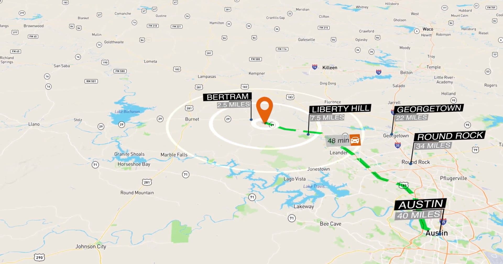 Location: 2.5 miles east of Bertram, 7.5 miles west of Liberty Hill and 40 miles north and west of downtown Austin, TX