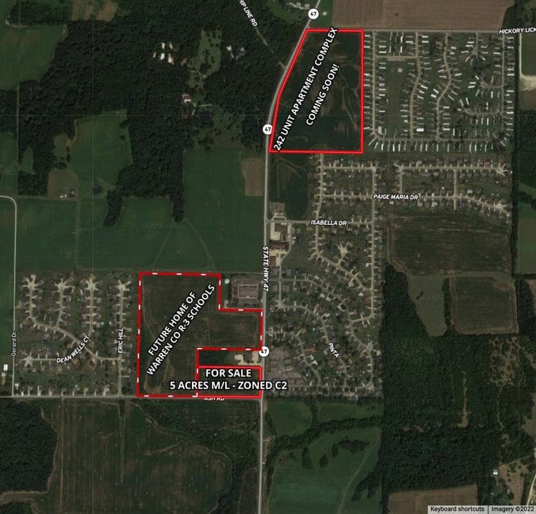 5± acre commercial lot for sale zoned C-2 commercial with a perfect location near new 242 unit apartment complex that has recently been approved and adjacent to Warren County Schools property. The lot has over 1,000 feet of road frontage and a perfect location on North Highway 47 and Ash. The surrounding properties are a mix of established and new build multi-family, and single family homes as well as farmland primed for further development. Great location for retail or self-storage or RV/Boat lot storage. Do not miss this great opportunity to purchase prime commercial acreage. Brand new sidewalks installed 2021-2022. City utilities borders property on 47 and Ash.