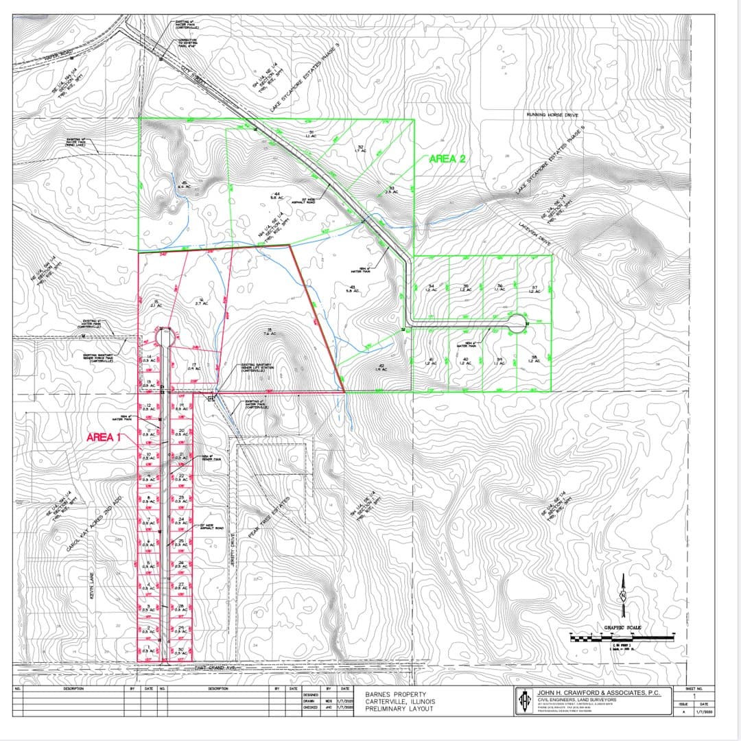58 acres with access from the north off of Lakeview rd and Hafer rd access from the south on E Grand Carterville . This property has 8 acres of tillable currently being farmed , the rest of the property is timber and under brush . This property is in Carterville school district and is ready to be developed into a subdivision . The owners have had Crawford Engineering develop a plan for 45 lots . The lots rang from .3 acre tracks to 2.5 acre tracts as well as 4 lots ranging from 5-8 acres . Don't miss out on this great investment property for a new subdivision in a high desired area and school district in Carterville IL . There is utilities that run along the road side on Grand .