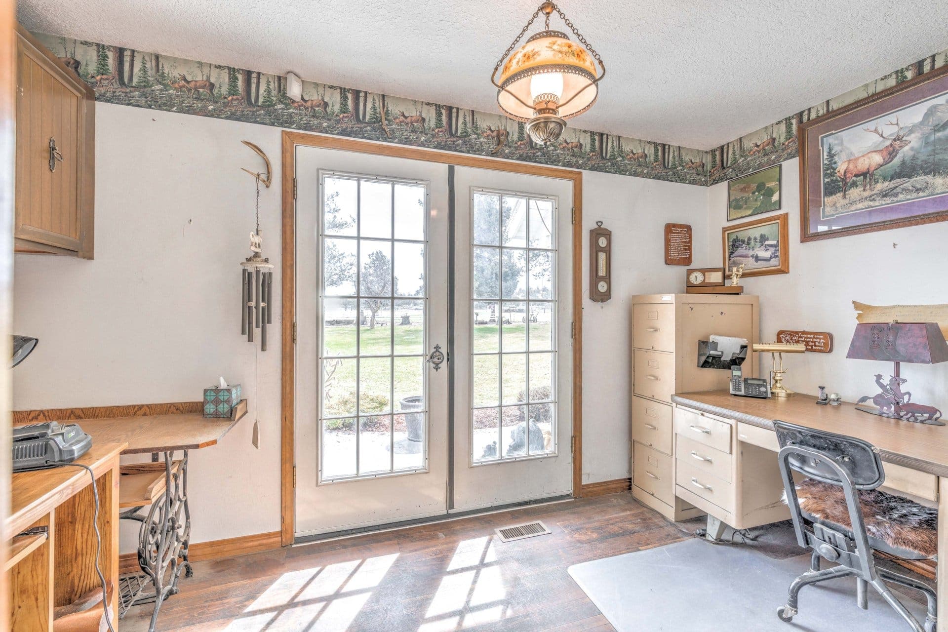 The custom two-story farmhouse was constructed in 1980 and features three bedrooms, two offices (which could serve as additional bedrooms), and three bathrooms. Additional housing includes a modest bunkhouse, perfect for ranch/farm hand housing.