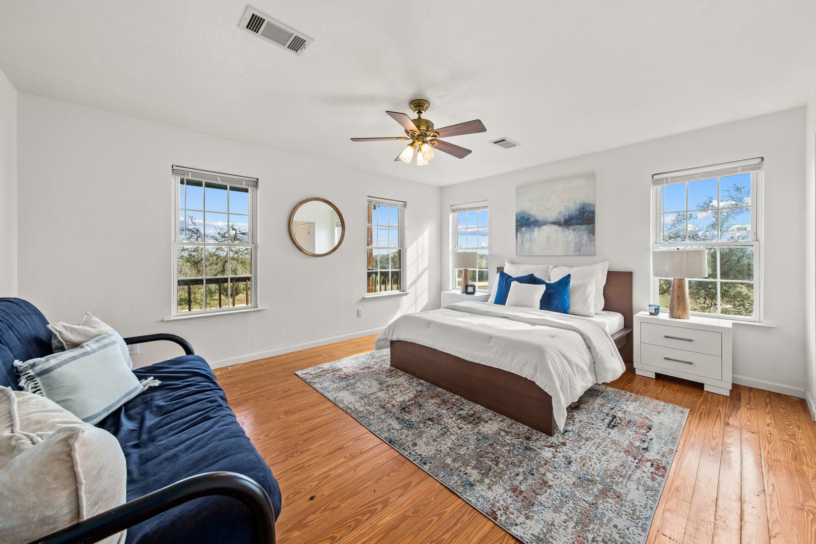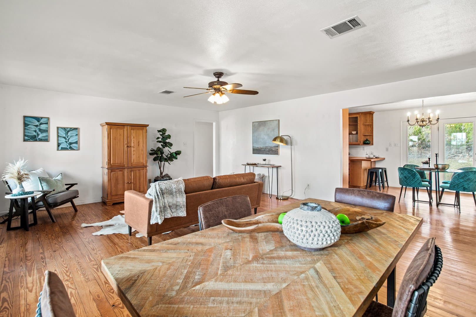 Enjoy breathtaking views from 12.5 acres overlooking Dripping Springs! This hill country property features a 3 bed, 2 bath, 1,641SqFt home, as well as a 1 bed, 1 bath, 946 SqFt living area with full kitchen and laundry in the guest barndominium/RV port. The barn also offers a shop area and covered storage space. Whether you are wanting a good investment property or a spot to build your dream home, this property is filled with unrestricted opportunity. The water source is rainwater systems. The main house has an 18,000-gallon tank, the guest has a 5,000-gallon.