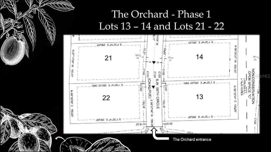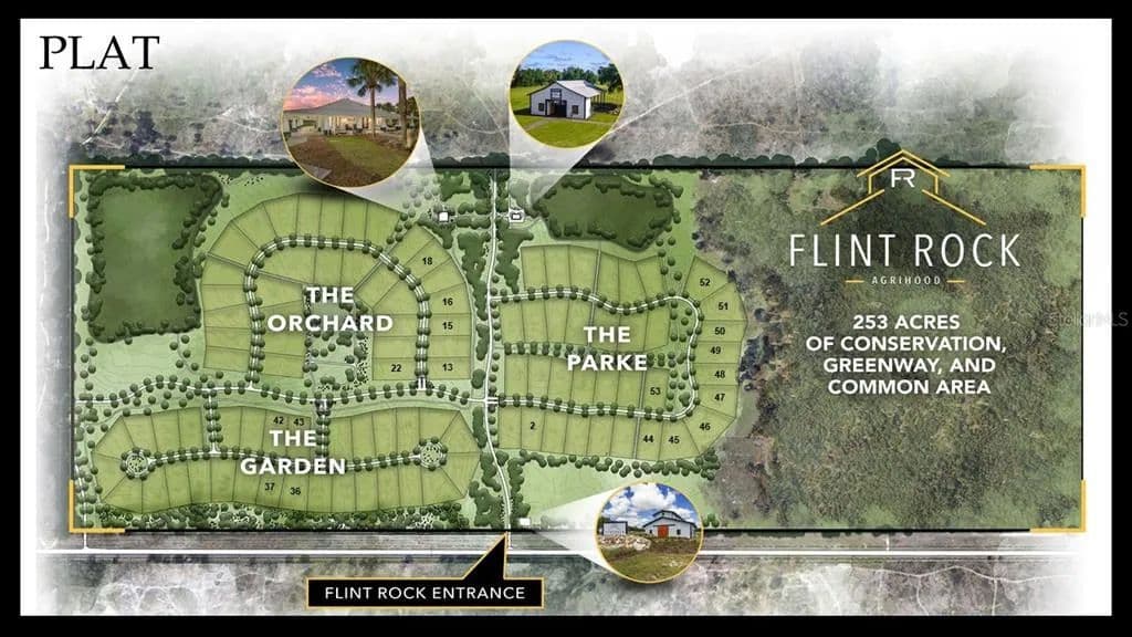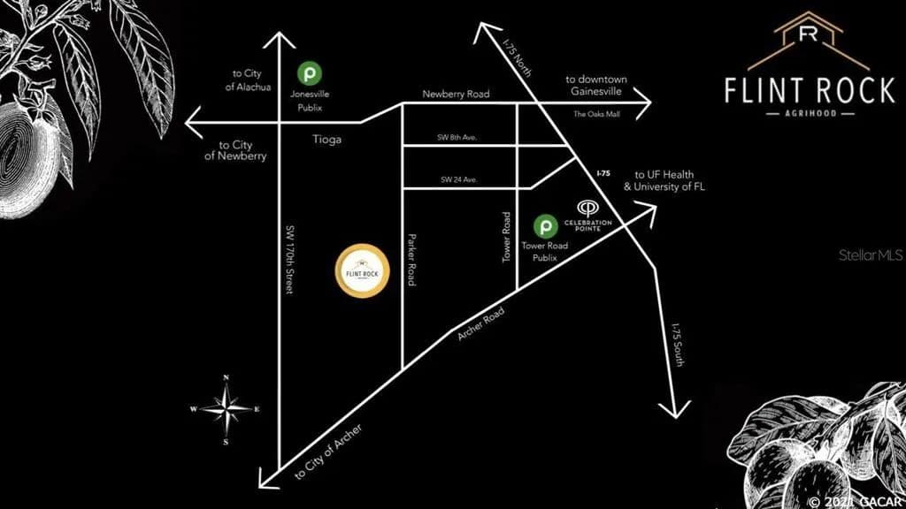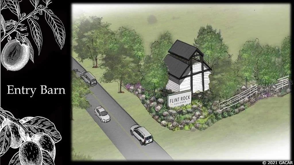 Lot 22 is a one acre corner lot. Its south facing backyard spans 150 ft in the back, abutting the Orchard's unique U-shaped common space. Gainesville's first Agrihood, Flint Rock promotes a lifestyle of healthy living and wellness, carefully crafted to embrace the farm-to-table lifestyle. This luxury residential community is centered around its recreational spaces, nature trails, gardens, orchards and conservation preserve. With 2.5 miles of walking paths and expanses of land, its residents will enjoy more green space than your average Gainesville subdivision. Owners will have access to their Event Barn, a unique venue for hosting outdoor activities. The Residents' Farmhouse offers a catering kitchen with spacious indoor gathering areas, surrounded by a fire pit area for casual outdoor entertaining. Offering expansive green space, The Orchard gated subdivision has a unique U-shaped center that is almost 9 acres in size, featuring a collection of fruit and nut bearing trees along paved community walking paths.