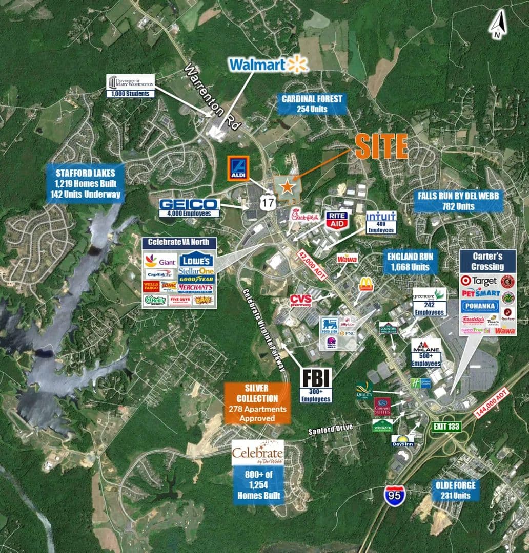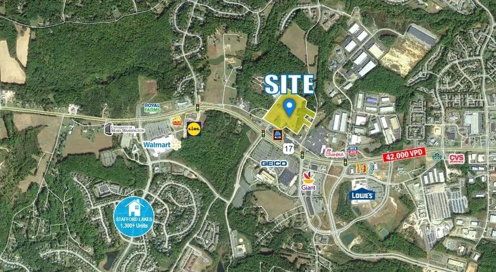 Located just off Route 17/Warrenton Road, a major business corridor with other large employers such as McLane (500+) FBI (300+) Lifecare (400) and Intuit (400). Less than 1 mile from University of Mary Washington Stafford Campus (1000+ Students). Near the entrance to Stafford Lakes community with over 1,200 homes built and an additional 161 planned Zoned agricultural with potential for commercial rezoning.