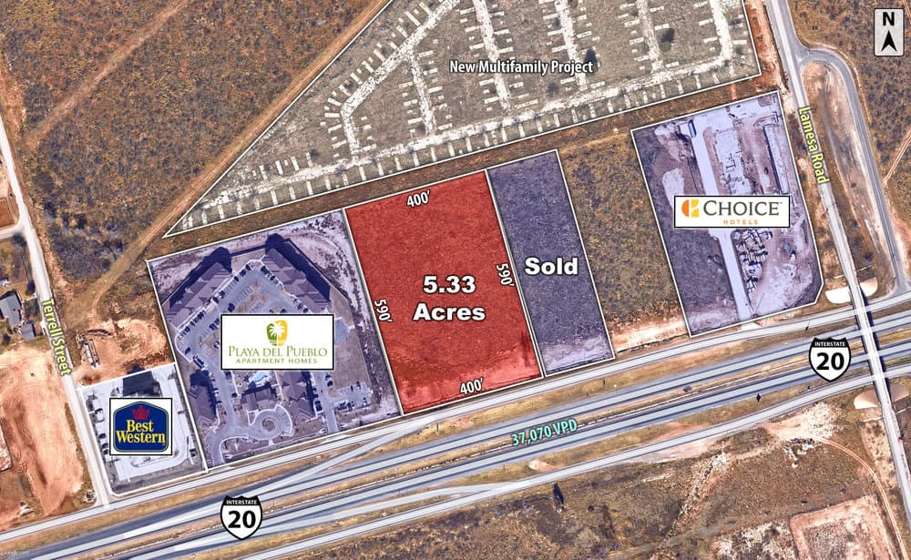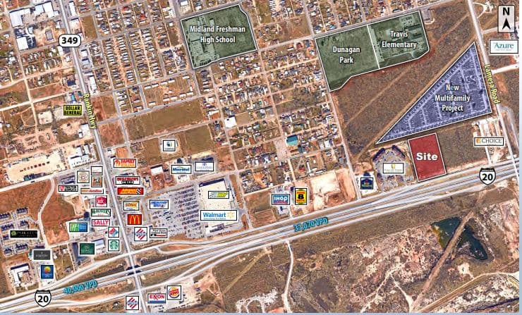 This large tract has 400 feet of frontage on I-20. This property is 2.5 miles from downtown Midland and 5 miles away from Midland College. Local retailers include Walmart, McDonald’s, Subway, Starbuck’s, Holiday Inn Express, Best Western, Country Inn and many more.