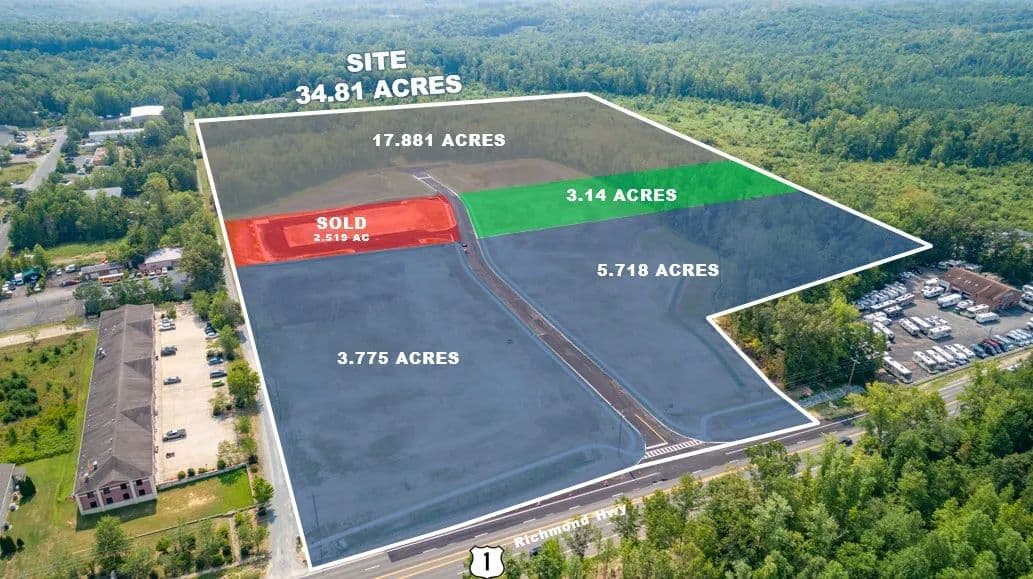 Significant opportunity, offering 34.81 acres of mixed-use land in Stafford County, Virginia. The property can be purchased as-is or available for individual parcel purchase through an overall development plan. Upon completion, the property is slated to include a 24,675 sq. ft. to-be-built warehouse that will offer individual flex/warehouse units for lease. Development has been cleared. Parcel/lots and road currently being graded.