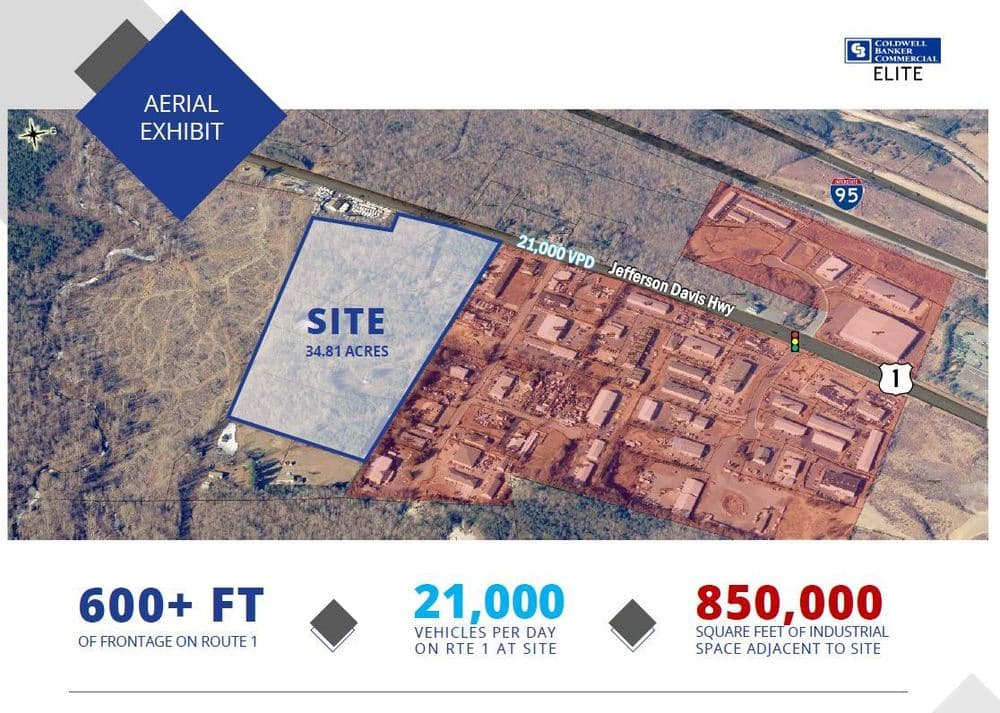 Located in Stafford County Virginia and fronting Jefferson Davis Highway, this property is just down the street from Stafford Airport and 75 industrial businesses. The property is located less than 2 miles from 1-95. This 34.81 acre property consists of two parcels zoned B-2 at approximately 10.64 acres and two parcels zoned M-1 at approximately 24.17 acres. This project is located within a premier location in Stafford County for industrial users and is adjacent to a cluster of 850,000 SF of industrial space.
