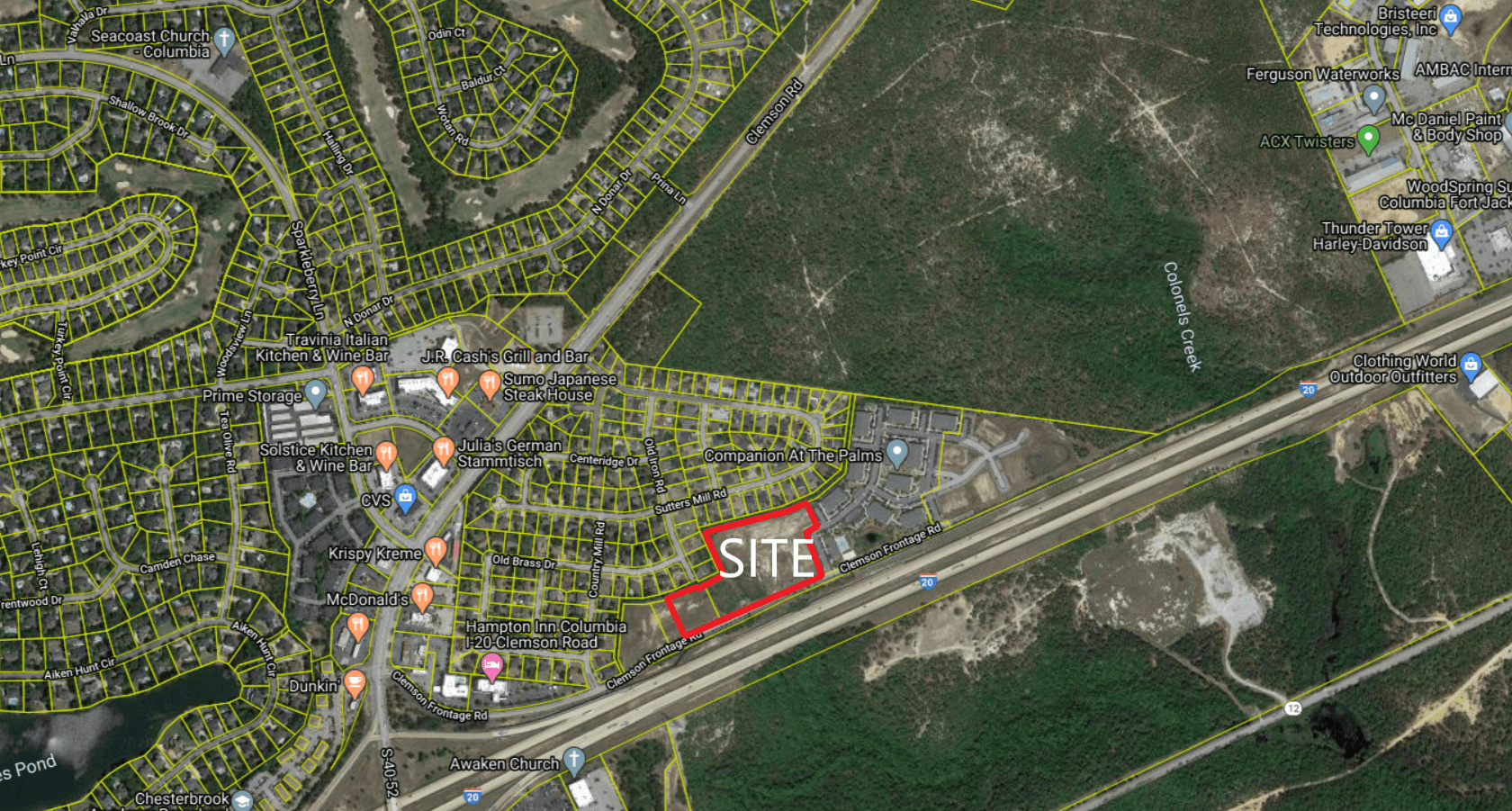 Development property located along Clemson Frontage Road. This + 8 acres has a tremendous amount of road frontage along Clemson Frontage Road. Located between two existing Hotels with a third planned to be built – and a newly developed apartment home community. This parcel can be subdivided at $350,000 per acre.