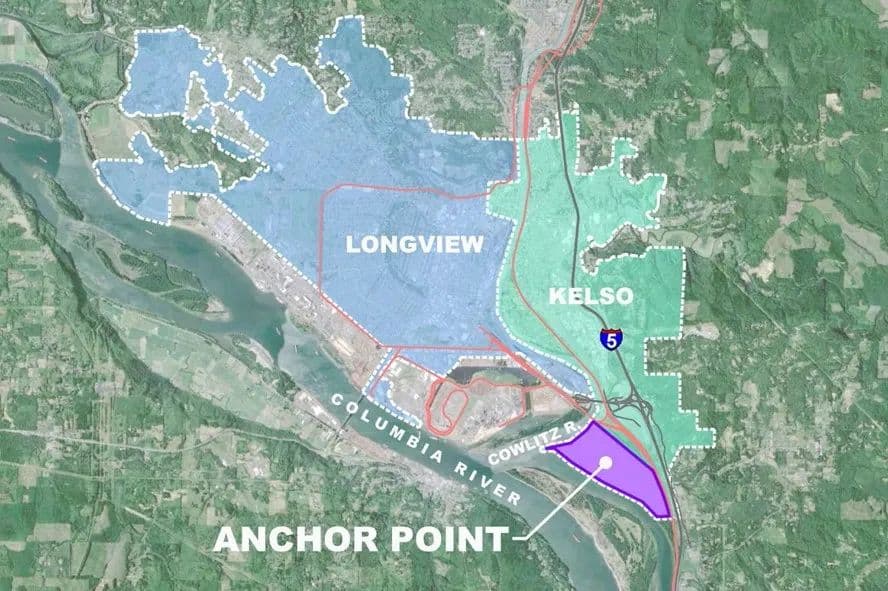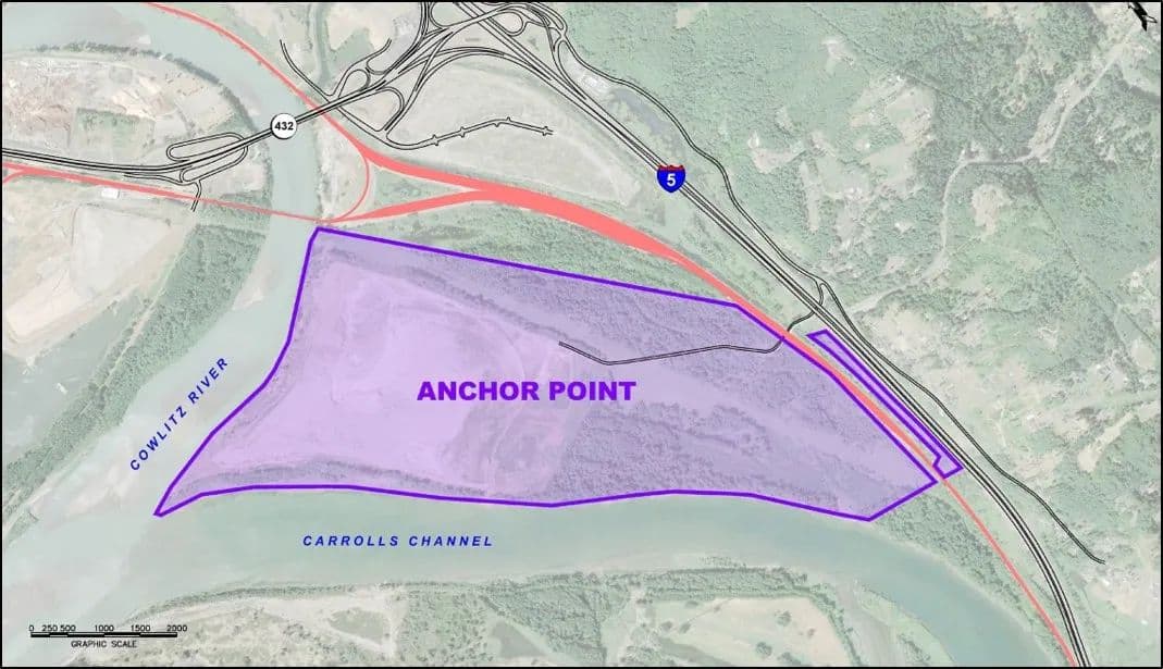 The Anchor Point site is comprised of approximately 600 acres, with nearly 300 developable upland acres. Located within the City of Kelso, Cowlitz County, Washington, the site has a strategic I-5 corridor location with direct access to I-5 and the Mainline of the BNSF, and is in close proximity to the deep-water navigation channel of the Columbia River.
