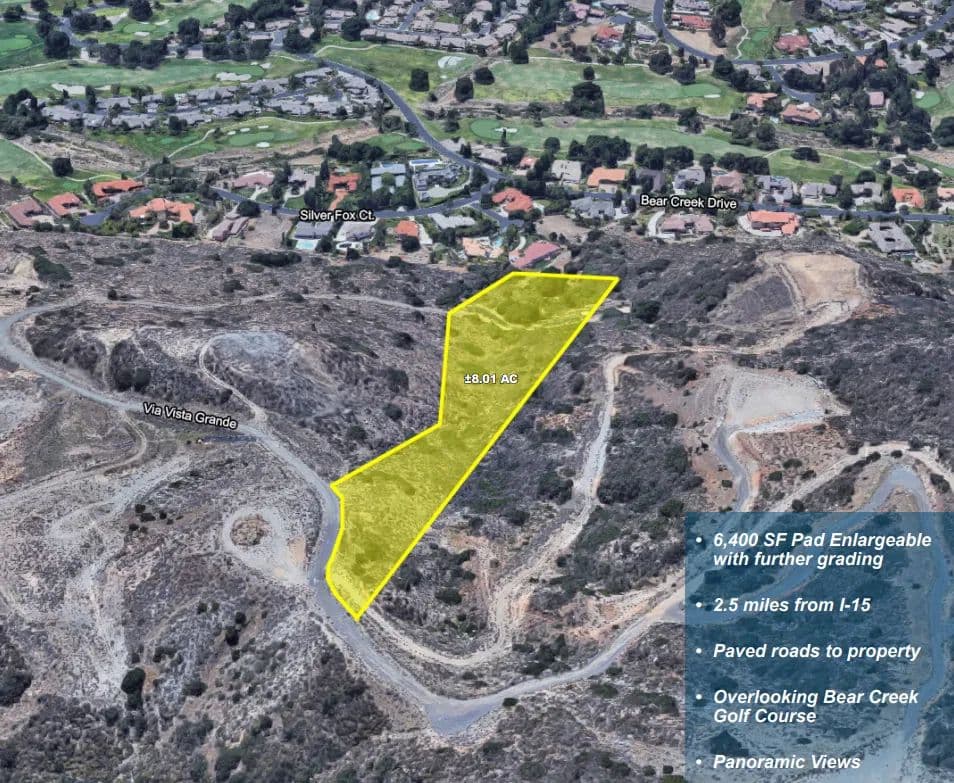 Parcel APN: 928-220-027 Jurisdiction Riverside County (Unincorporated) Size ±8.01 AC La Cresta HOA $92.50 / month Zoning R-A-5 General Plan Rural Mountainous Purchase Price $250,000 $0.72 / SF The subject property is located in unincorporated Riverside County just outside the city border of Wildomar and Murrieta. The property is 8.01 acres in size and presents with southward sloping topography. The property is located on Via Vista Grande which is a newly paved road that connects to Claremont St that provides access to Grand Ave. The site is located just 2.5 miles from I-15 via Clinton Keith Rd. The property currently has a 6,400 SF pad that can be enlarged with further grading. The site has panoramic views overlooking the City of Murrieta and Bear Creek Golf Course. Directly across Via Vista Grande are several large homes that were all built in 2018.