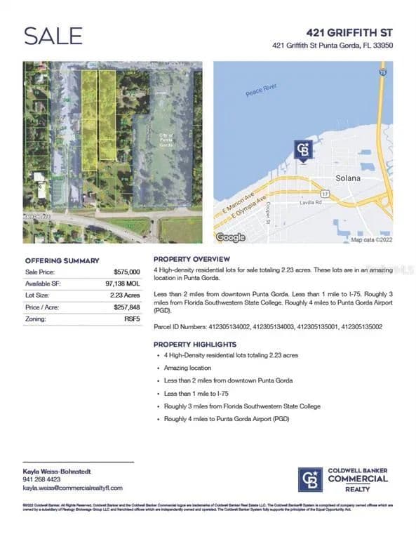 4 High-density residential lots for sale totaling 2.23 acres. Investment or Owner User. These lots are in an amazing location in Punta Gorda. Less than 2 miles from downtown Punta Gorda. Less than 1 mile to I-75. Roughly 3 miles from Florida Southwestern State College. Roughly 4 miles to Punta Gorda Airport (PGD). Parcel ID Numbers: 412305134002, 412305134003, 412305135001, 412305135002
