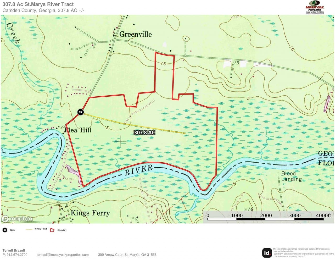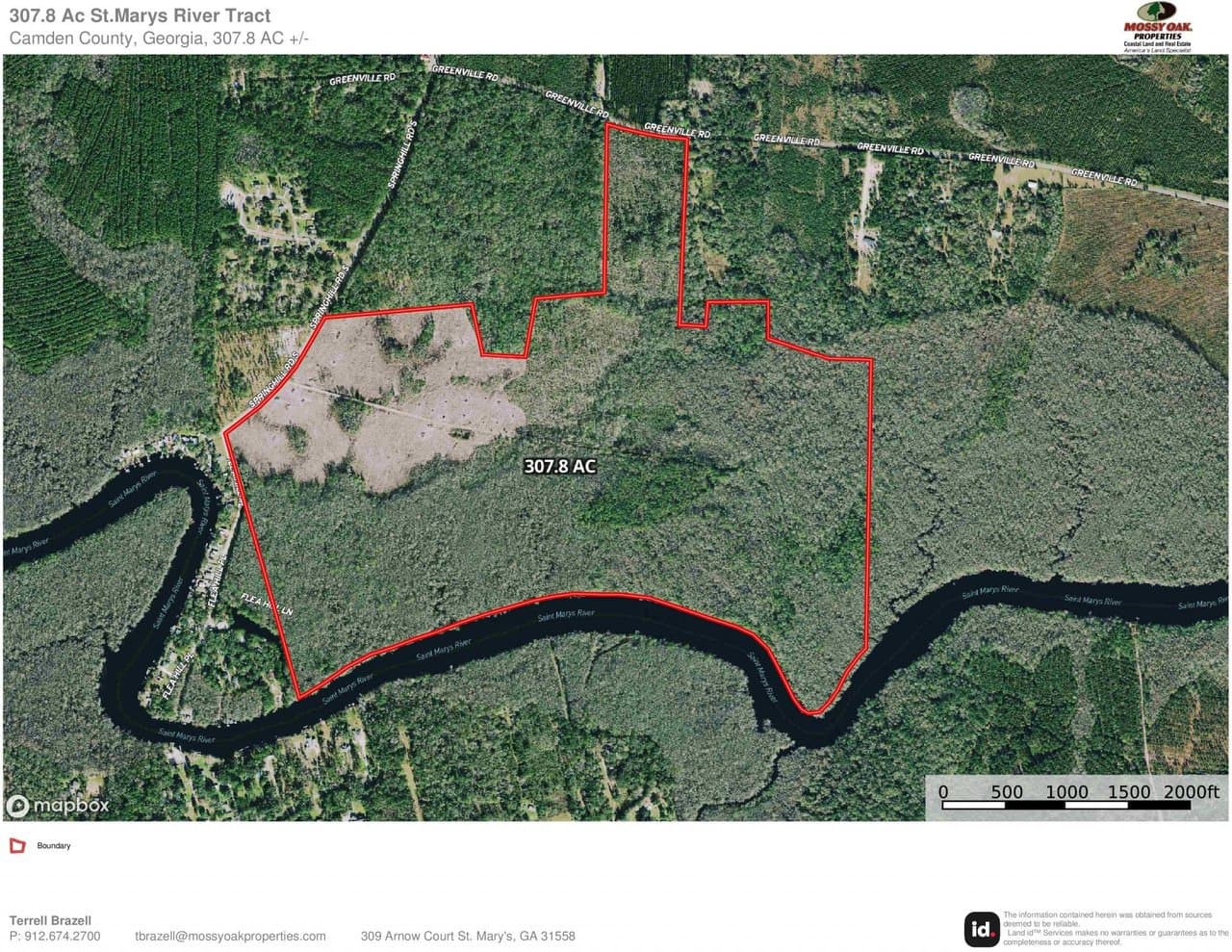 Rare opportunity to own 307 Acres with more than a mile of frontage on the St.Marys River in Kingsland, GA. The property is just west of the City of Kingsland on the river directly across from Kings Ferry and The White Oak Conservation Center on the Florida Side. The property would make a great Private Retreat for hunting and outdoor recreation or potential for future higher and better investment tract. Approximately 56+/- Acres of recently re-planted pine and the balance of the property has a mix of Hardwood, Oaks and Mature Pine Islands. There is a main road that runs through the middle of property and with a few smaller trails around. The property is not currently enrolled in any CUVA or Conservation Easements of any kind and presents a lot of opportunity for conservation projects. Excellent Deer, Turkey and Duck hunting opportunities. Great Weekend Getaway, Cabin Site or Private Country Estate. This property is only 35 minutes to the Jacksonville Fl International Airport, 40 Minutes to FLETC / Brunswick, GA and St.Simons Island, GA. 20 Minutes to Kings Bay Naval Submarine Base / St.Marys, GA. 10 Minutes to Kingsland, GA with Schools, Shopping, Dinning and I-95 Access. Riverfront Property for Sale. Georgia River Front Land for Sale. Land for Sale. For more information contact Terrell Brazell with Mossy Oak Properties for more information at 912-674-2700 or