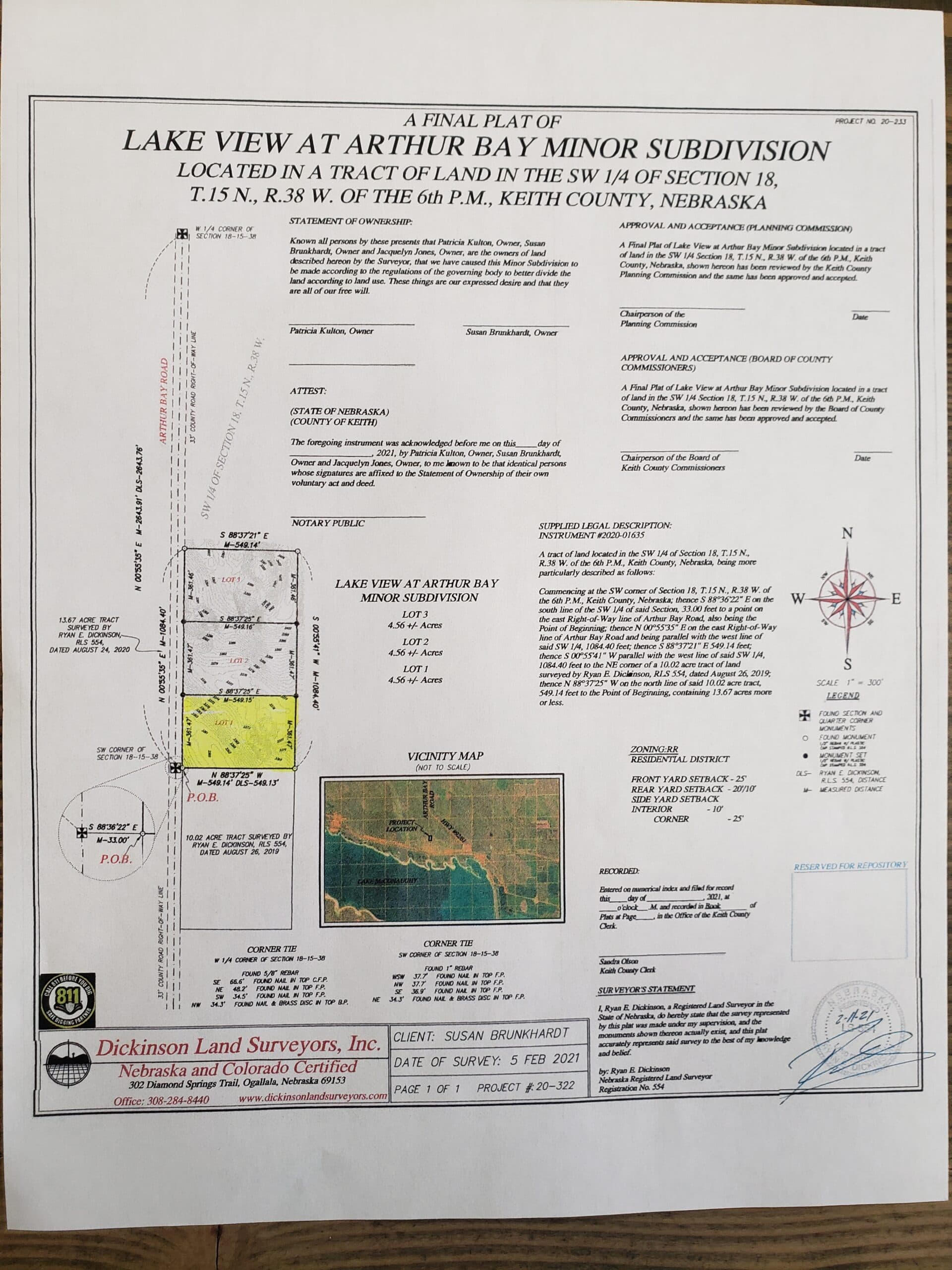 Location Lake View at Arthur Bay Lot 1 is 15 minutes from Ogallala and Interstate I-80, 3 .5 hours northeast of Denver, CO and 4.5 hours west of Omaha, NE