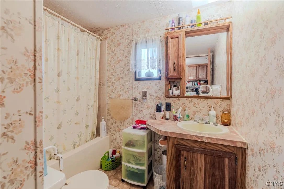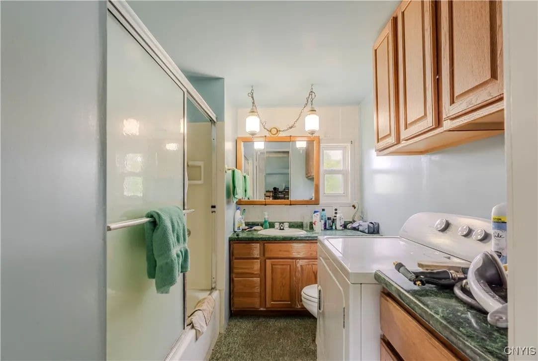 The main home features a spacious kitchen offers warm oak-style cabinets and a welcoming layout, with laundry