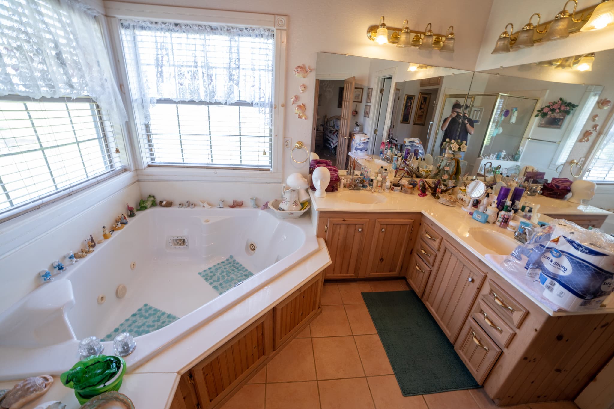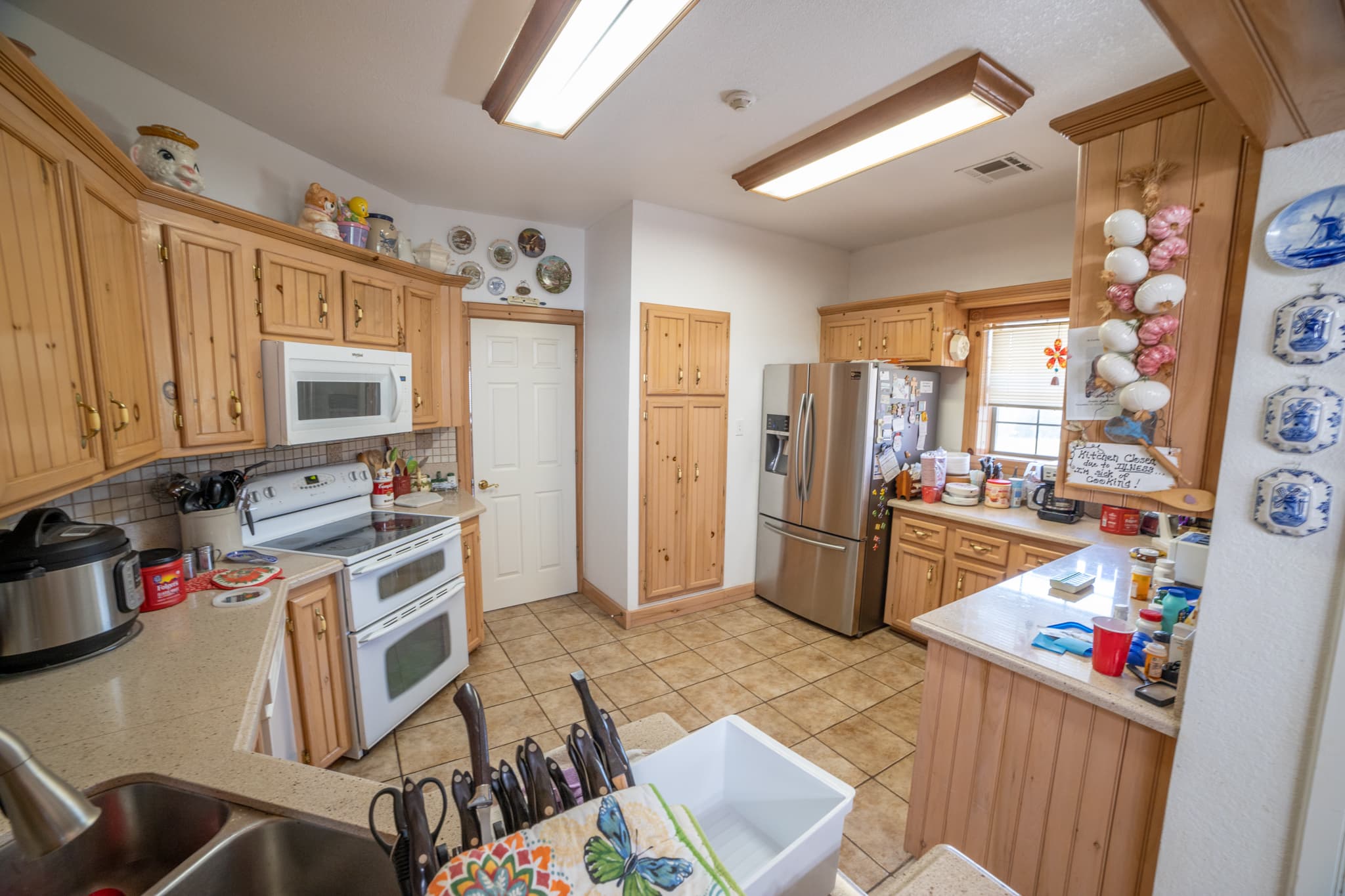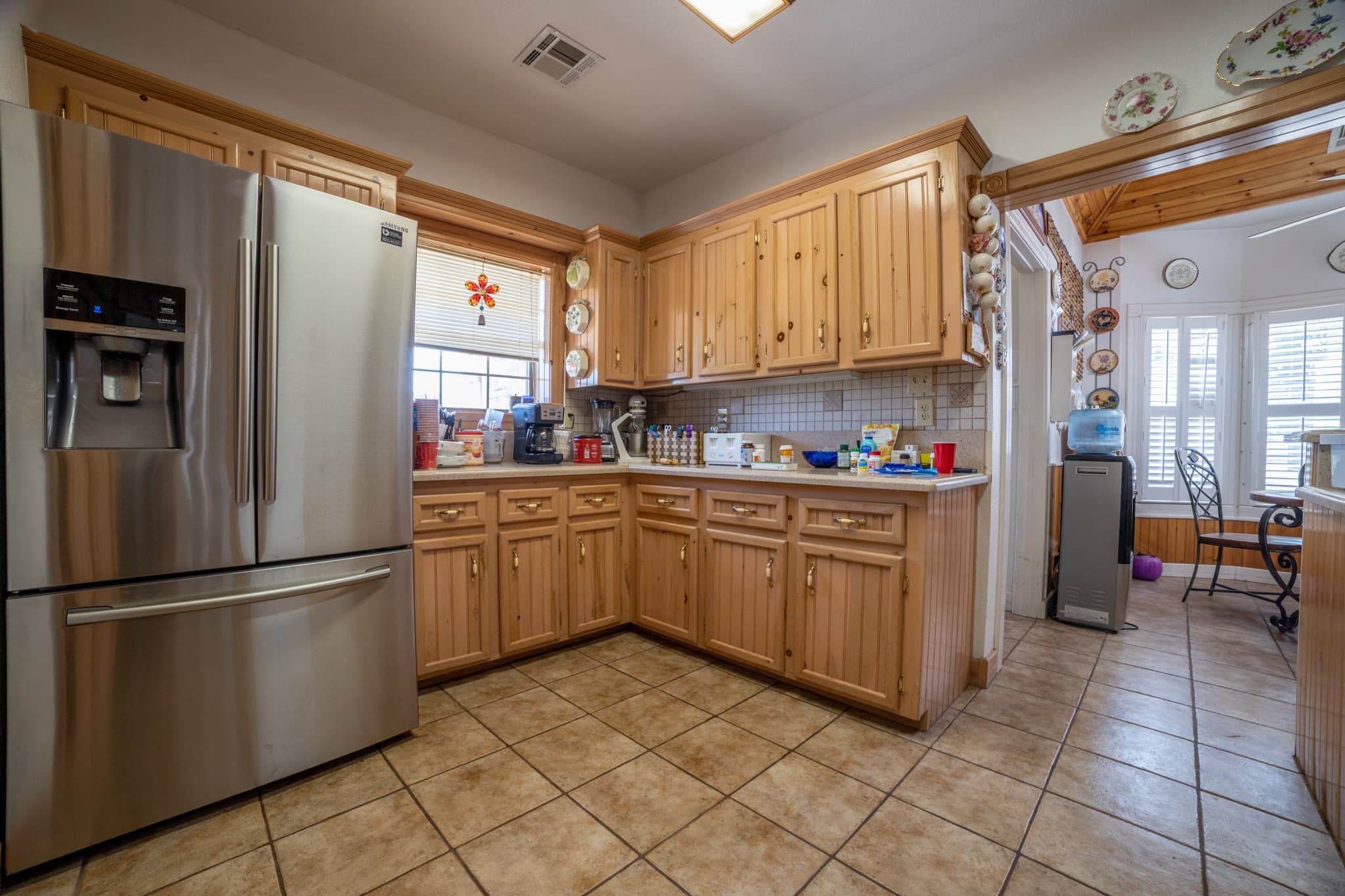 The home has 3 bedrooms and 2 baths. The master suite has a walk-in closet and a Jacuzzi tub. The kitchen has custom cabinets with pull out shelving and Corion counter tops and a special place for dining. The domed ceiling with tongue and groove pine is surrounded by windows....such a special place.