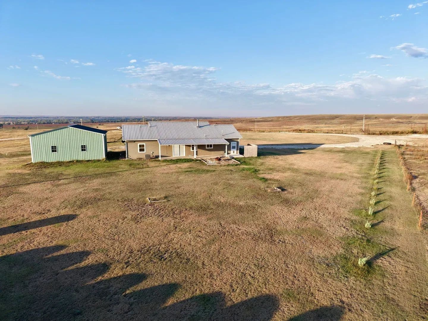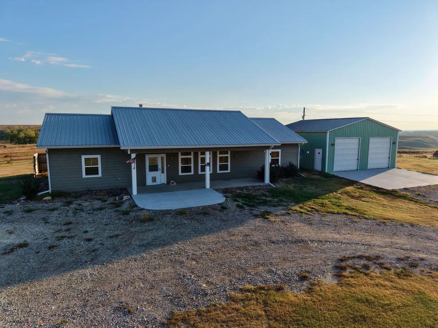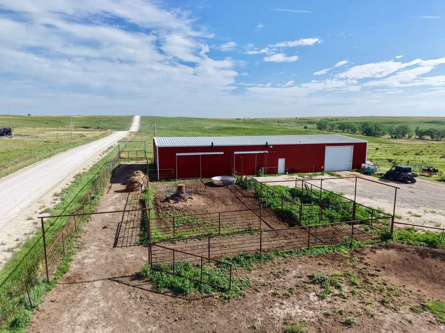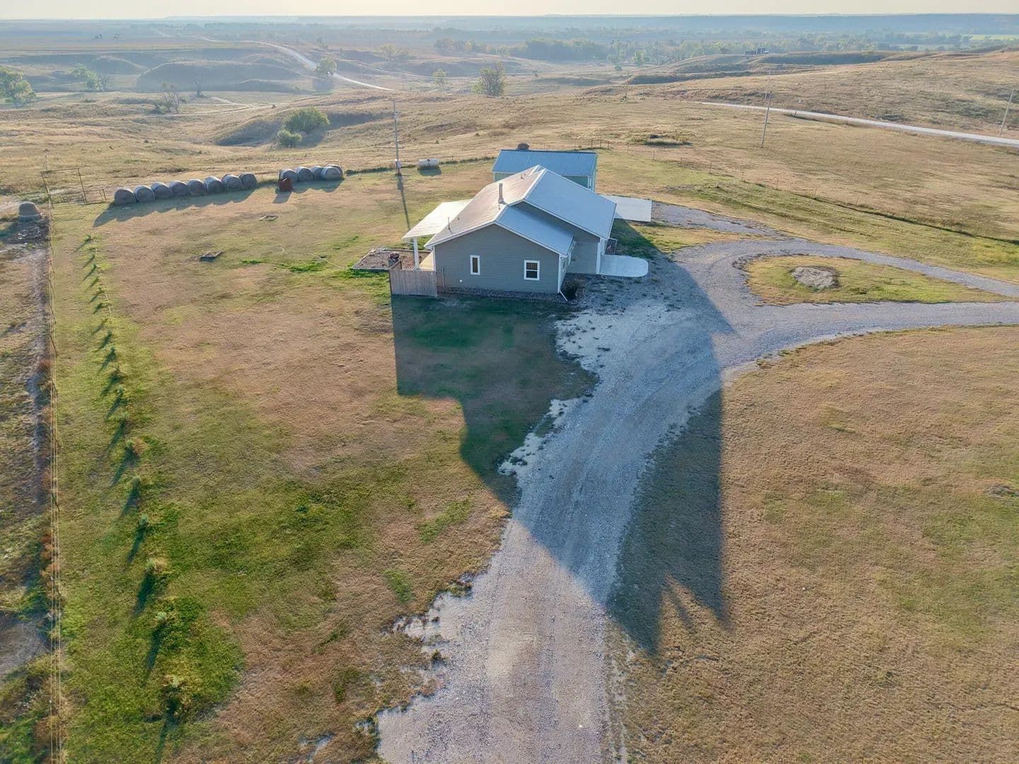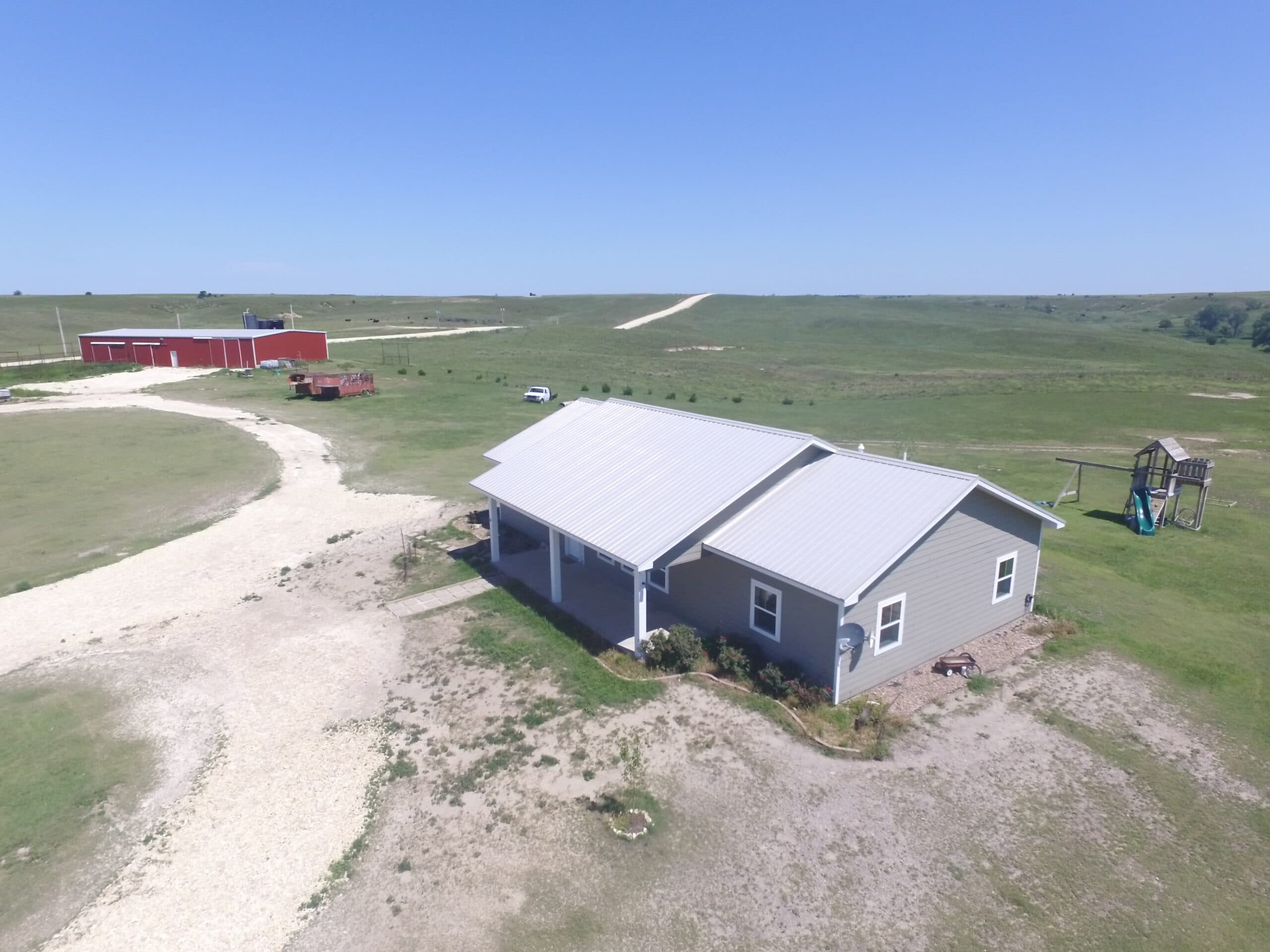 This country property features a beautiful, move-in ready home, detached garage and a large shop located northwest of Hays, Kansas. Improvements Built in 2011, this Ranch style home has around 1800 square feet of finished living space. The home has a steel frame with a metal roof and concrete siding. It is highlighted by an open concept main room that has 18 foot vaulted ceilings and large windows that allow plenty of natural light. The home has 3 bedrooms and 2 bathrooms including the master suite. The master closet also serves as a concrete storm shelter. The home is on a water well, septic system and propane. There is also a reverse osmosis system. Enjoy the peace and quiet this property has to offer on either one of the two covered porches on the house.