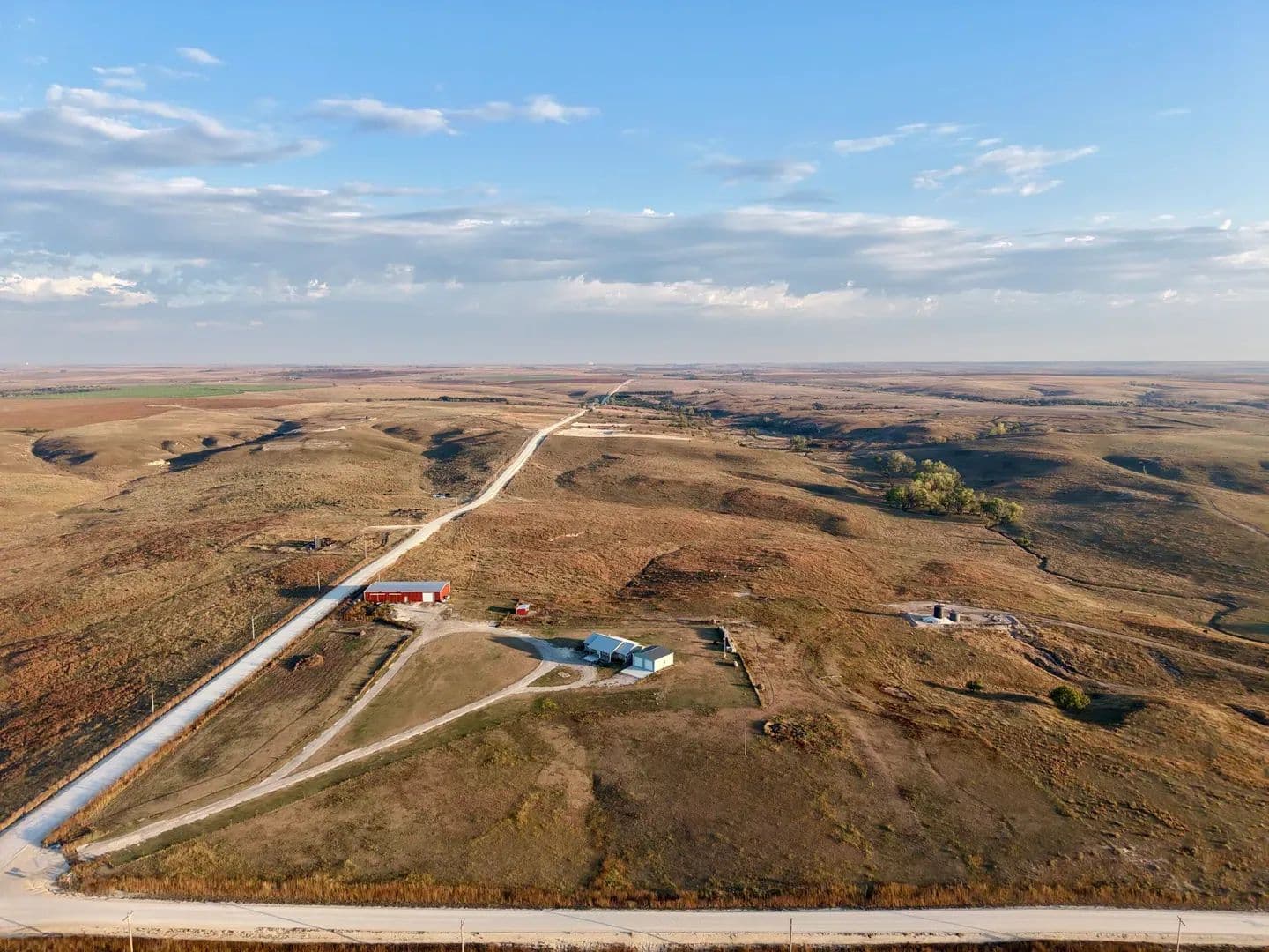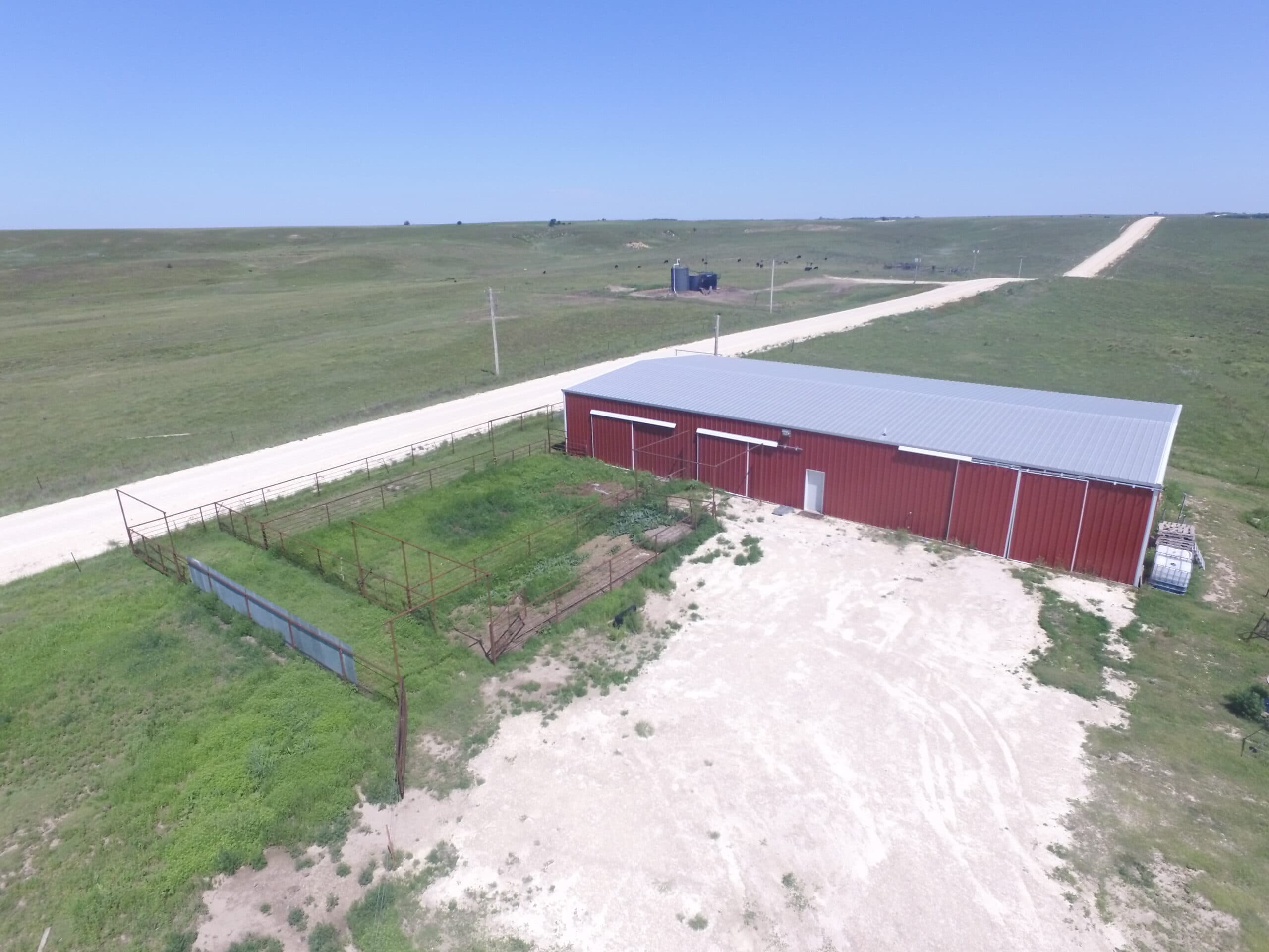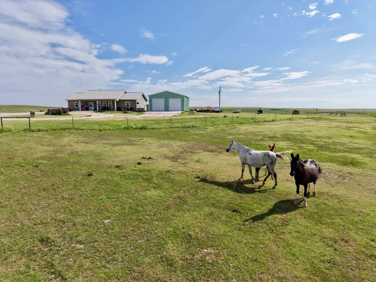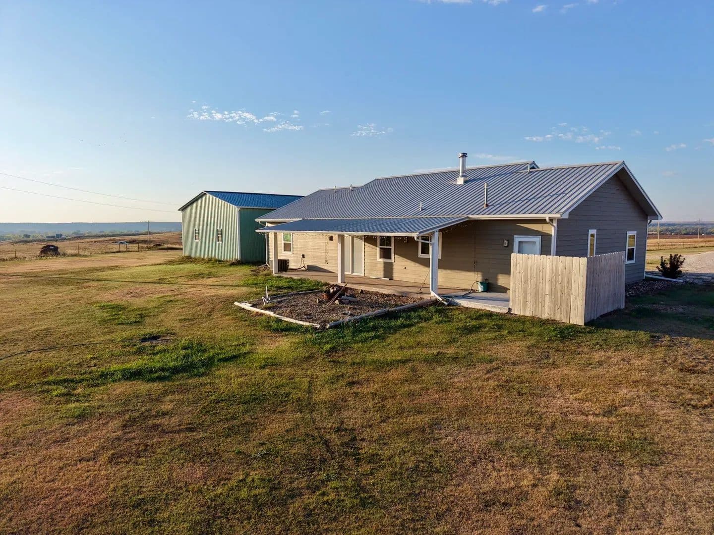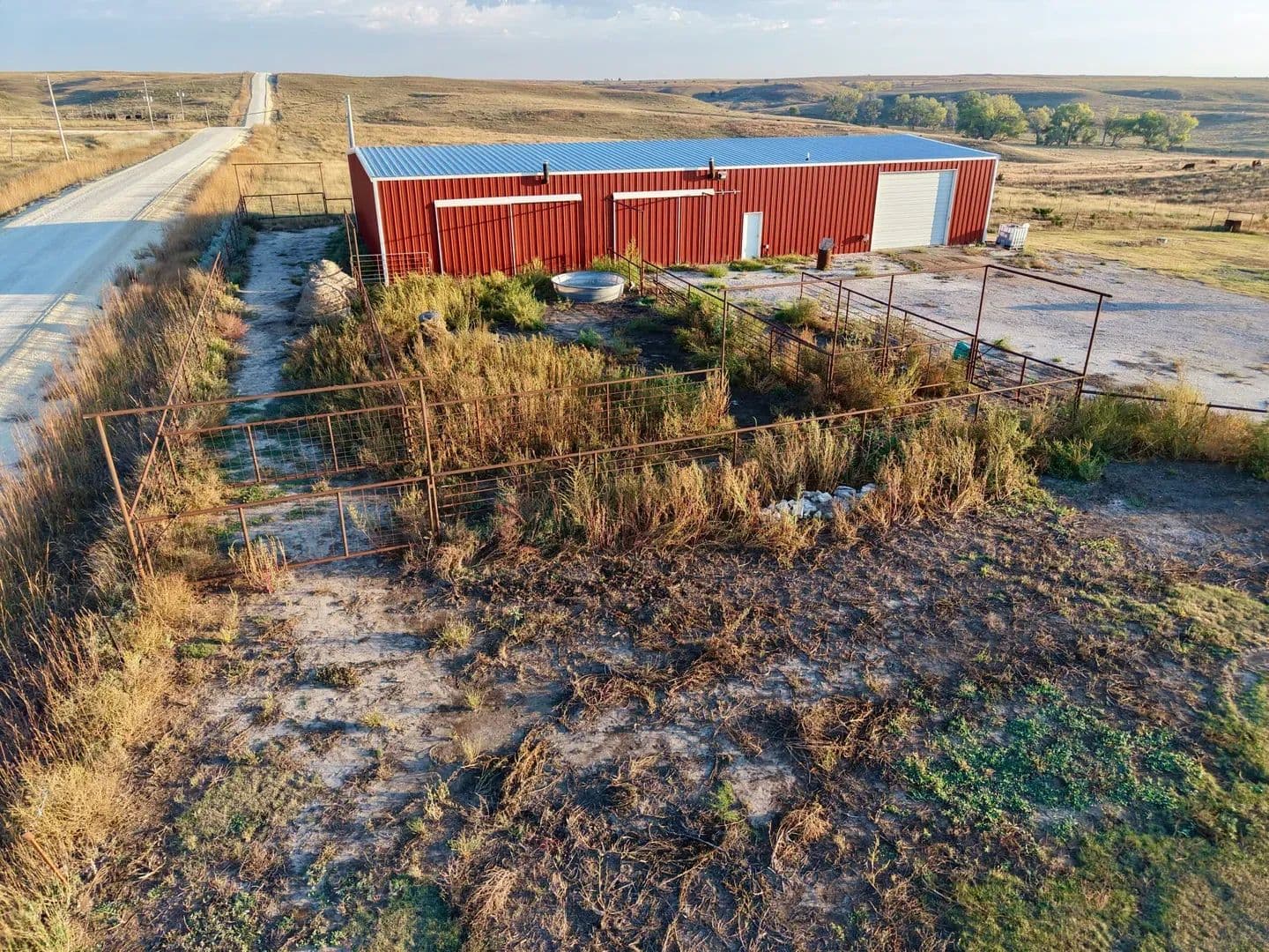 This country property features a beautiful, move-in ready home, detached garage and a large shop located northwest of Hays, Kansas. Improvements Built in 2011, this Ranch style home has around 1800 square feet of finished living space. The home has a steel frame with a metal roof and concrete siding. It is highlighted by an open concept main room that has 18 foot vaulted ceilings and large windows that allow plenty of natural light. The home has 3 bedrooms and 2 bathrooms including the master suite. The master closet also serves as a concrete storm shelter. The home is on a water well, septic system and propane. There is also a reverse osmosis system. Enjoy the peace and quiet this property has to offer on either one of the two covered porches on the house.