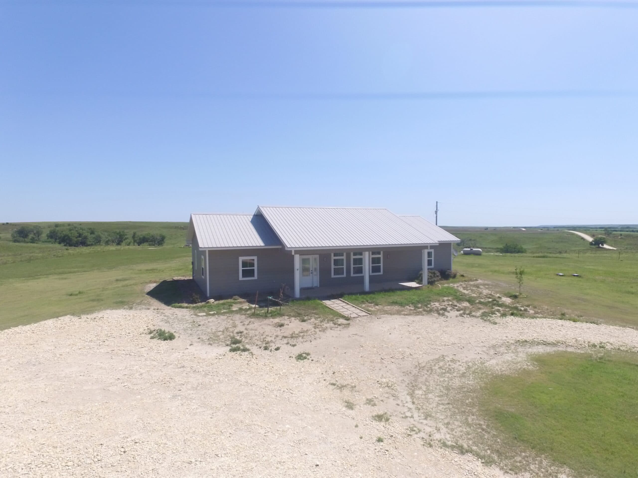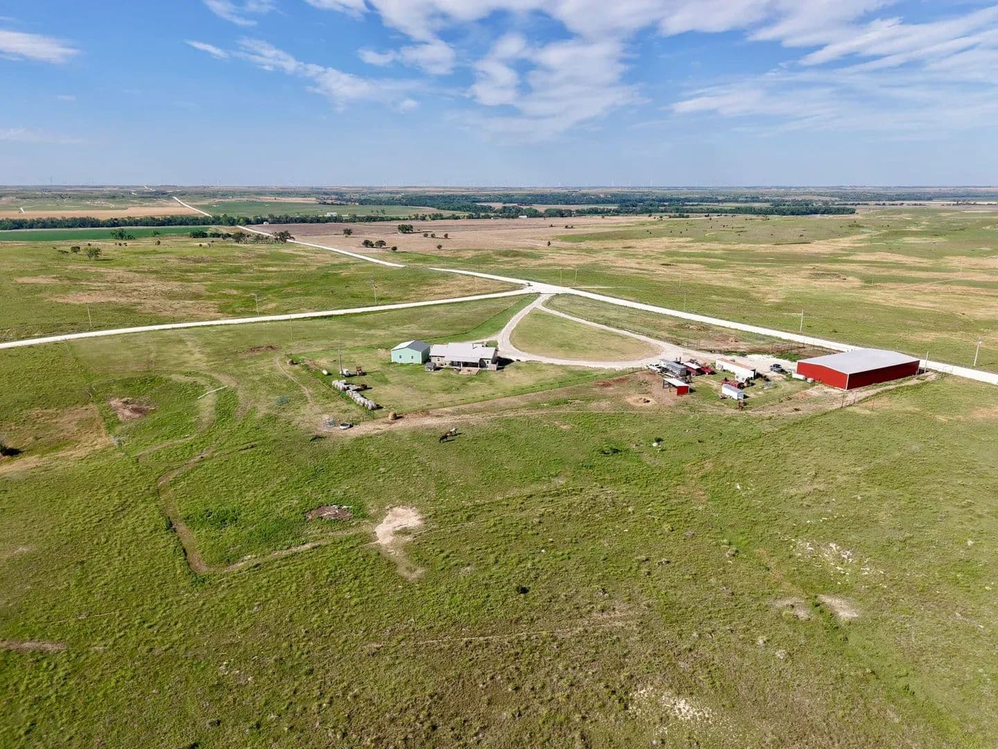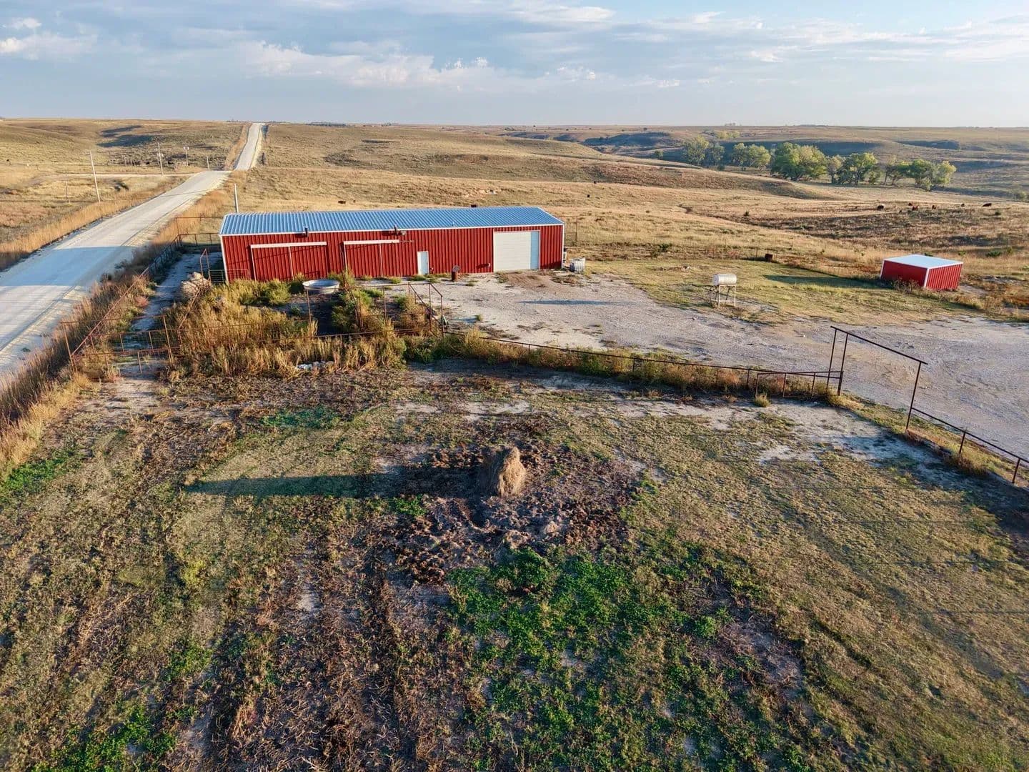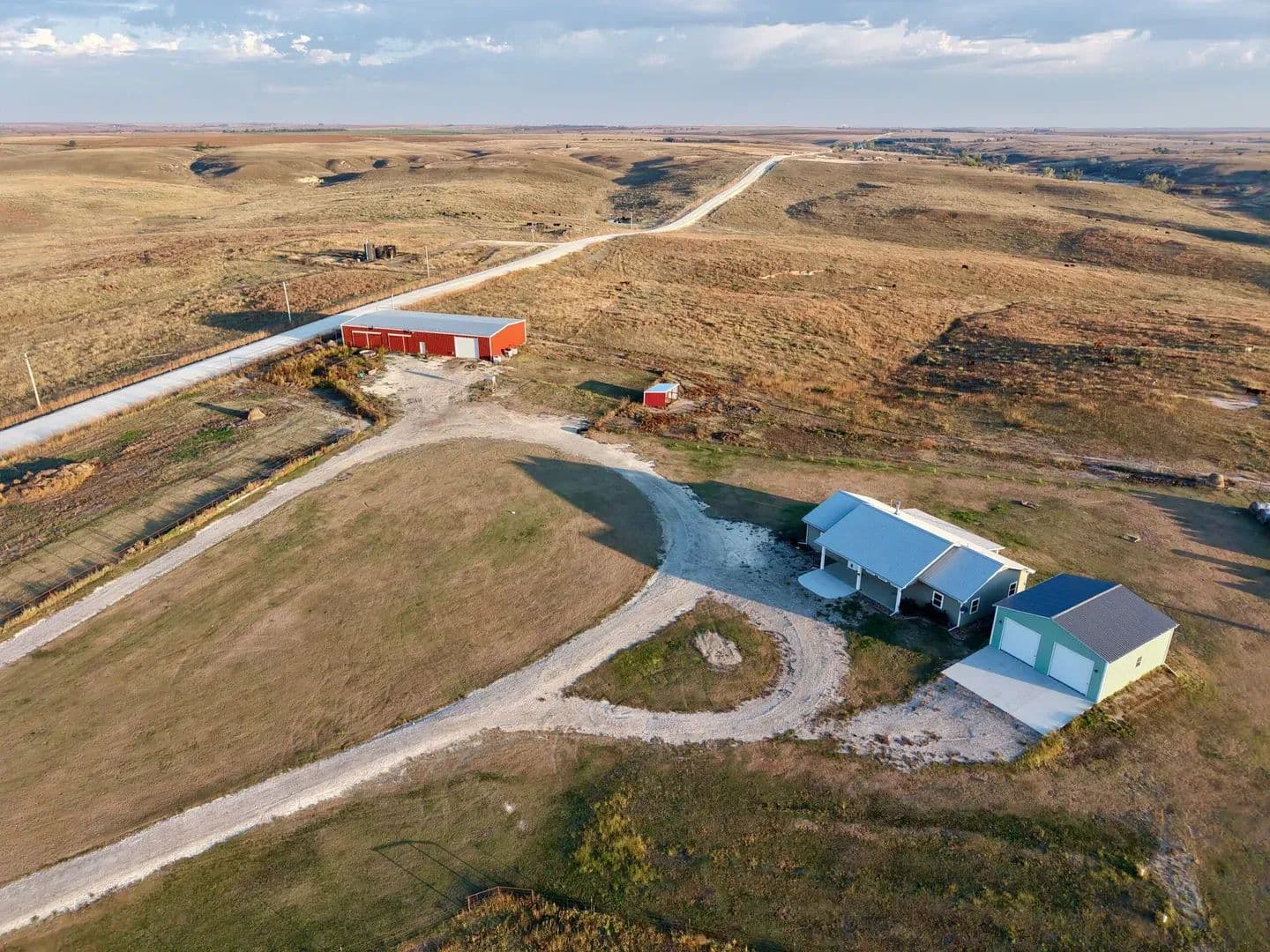 This country property features a beautiful, move-in ready home, detached garage and a large shop located northwest of Hays, Kansas. Improvements Built in 2011, this Ranch style home has around 1800 square feet of finished living space. The home has a steel frame with a metal roof and concrete siding. It is highlighted by an open concept main room that has 18 foot vaulted ceilings and large windows that allow plenty of natural light. The home has 3 bedrooms and 2 bathrooms including the master suite. The master closet also serves as a concrete storm shelter. The home is on a water well, septic system and propane. There is also a reverse osmosis system. Enjoy the peace and quiet this property has to offer on either one of the two covered porches on the house.