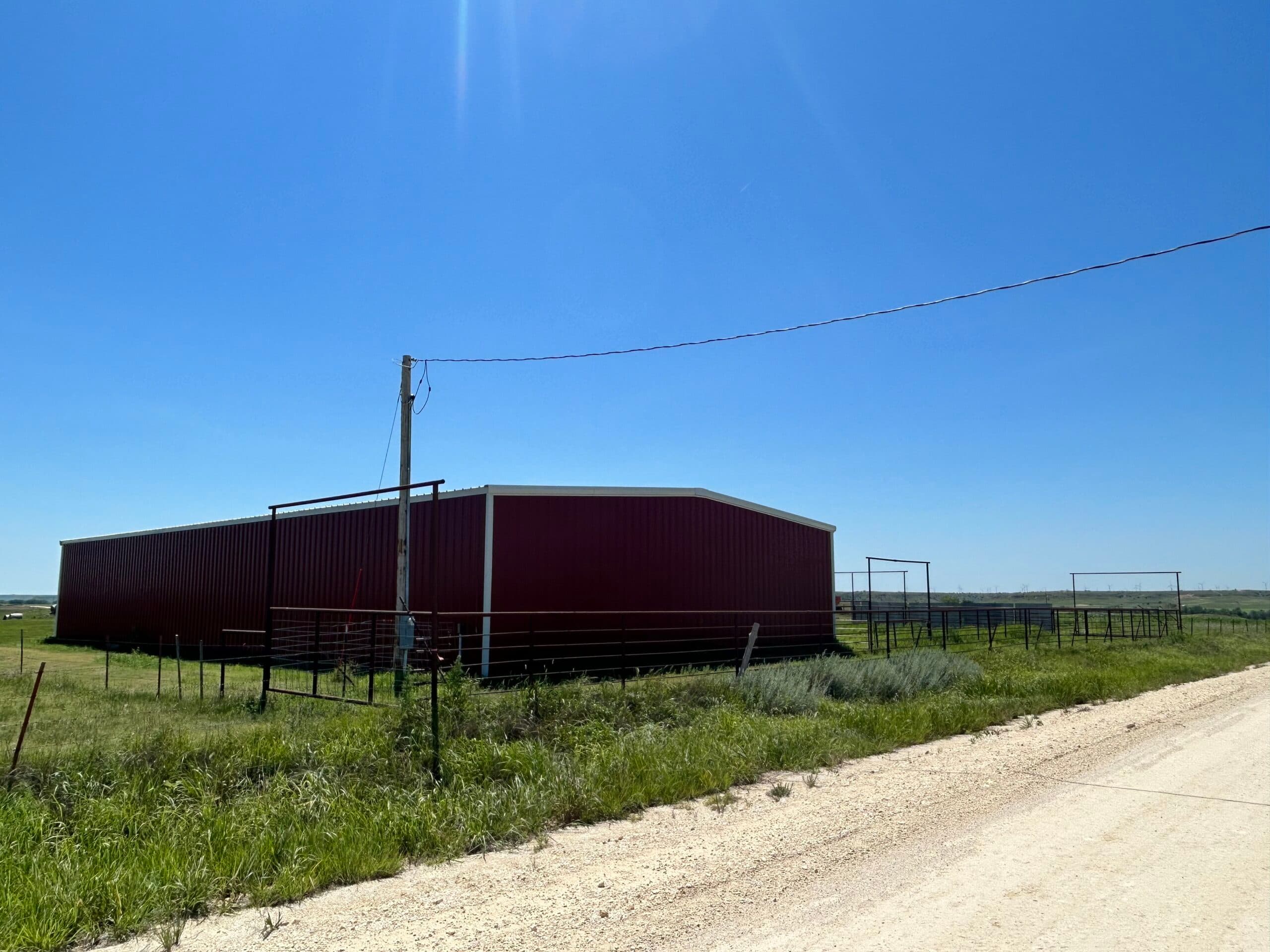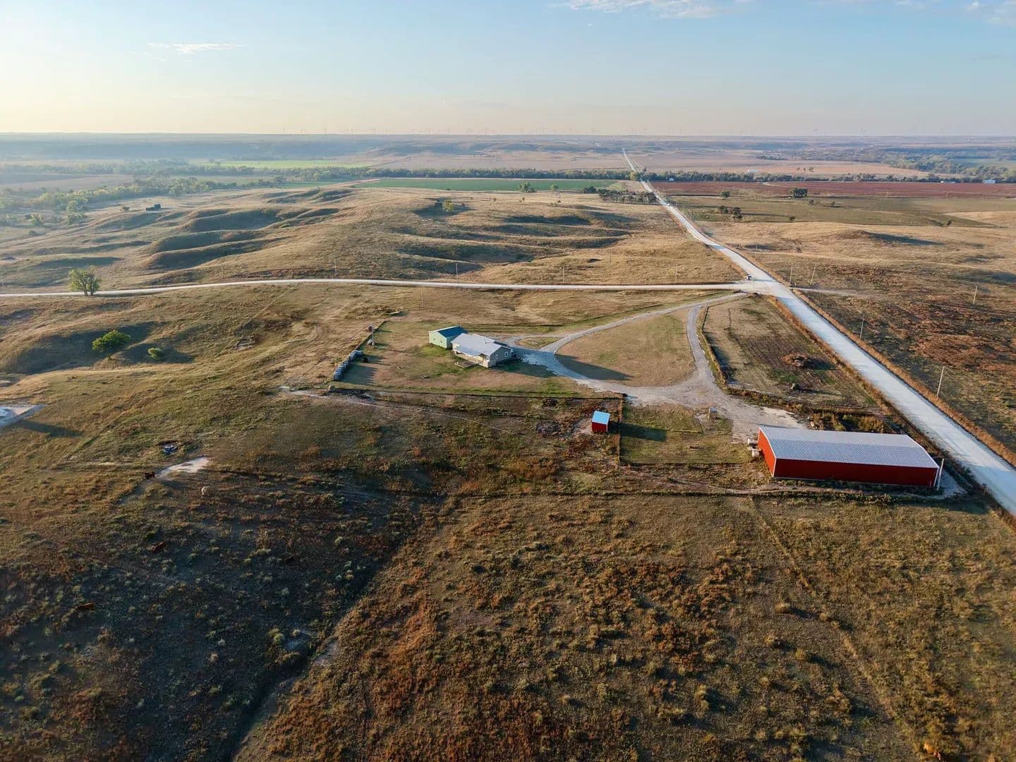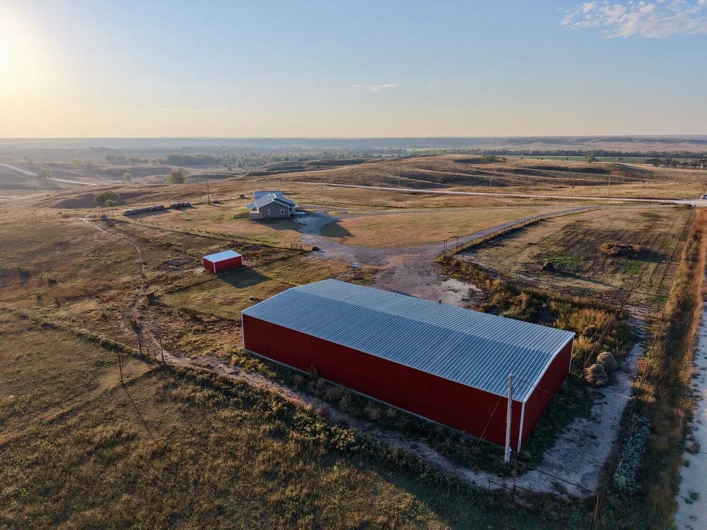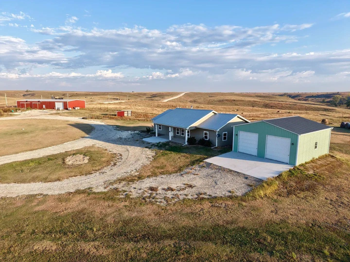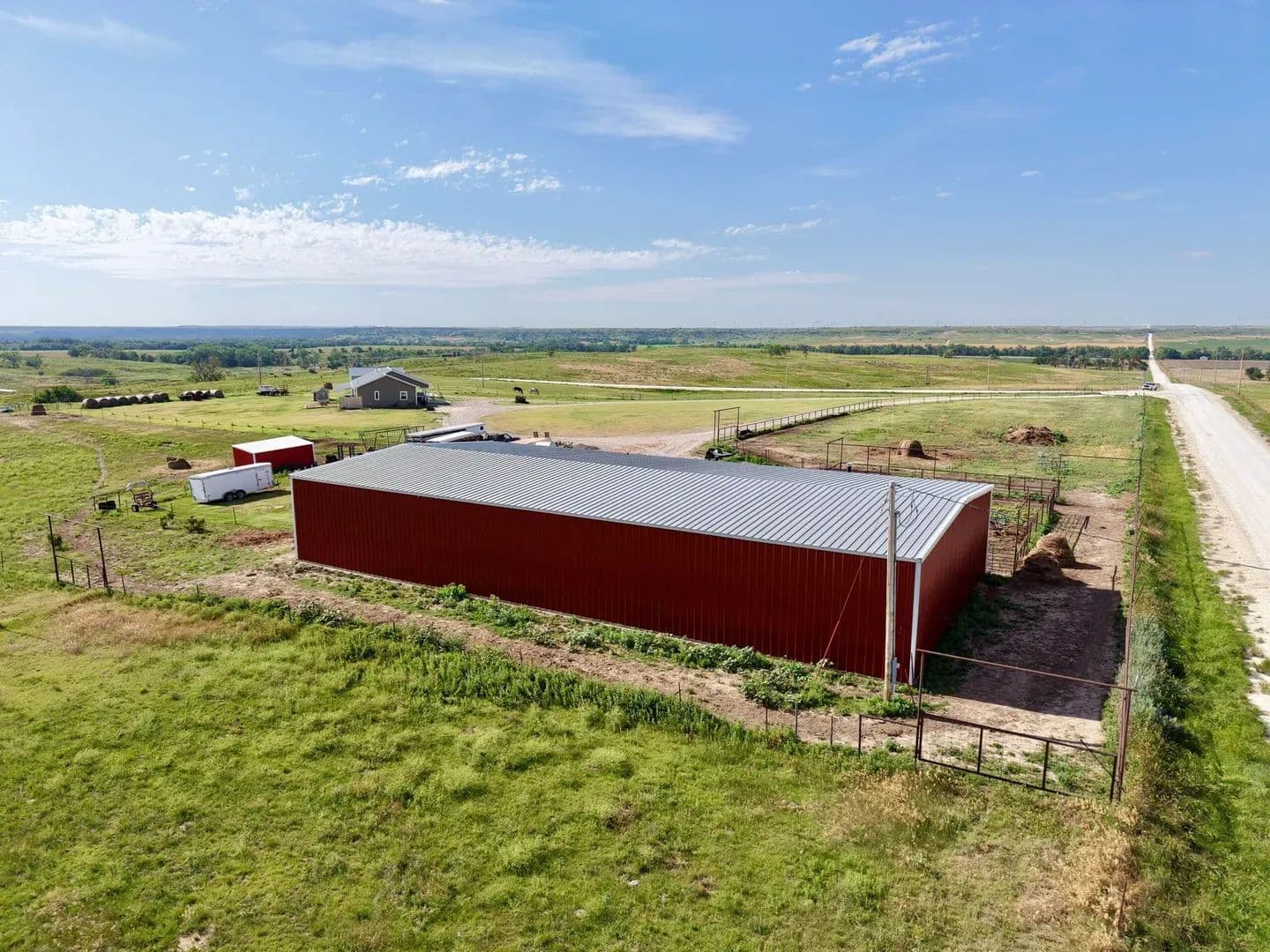 This country property features a beautiful, move-in ready home, detached garage and a large shop located northwest of Hays, Kansas. Improvements Built in 2011, this Ranch style home has around 1800 square feet of finished living space. The home has a steel frame with a metal roof and concrete siding. It is highlighted by an open concept main room that has 18 foot vaulted ceilings and large windows that allow plenty of natural light. The home has 3 bedrooms and 2 bathrooms including the master suite. The master closet also serves as a concrete storm shelter. The home is on a water well, septic system and propane. There is also a reverse osmosis system. Enjoy the peace and quiet this property has to offer on either one of the two covered porches on the house.