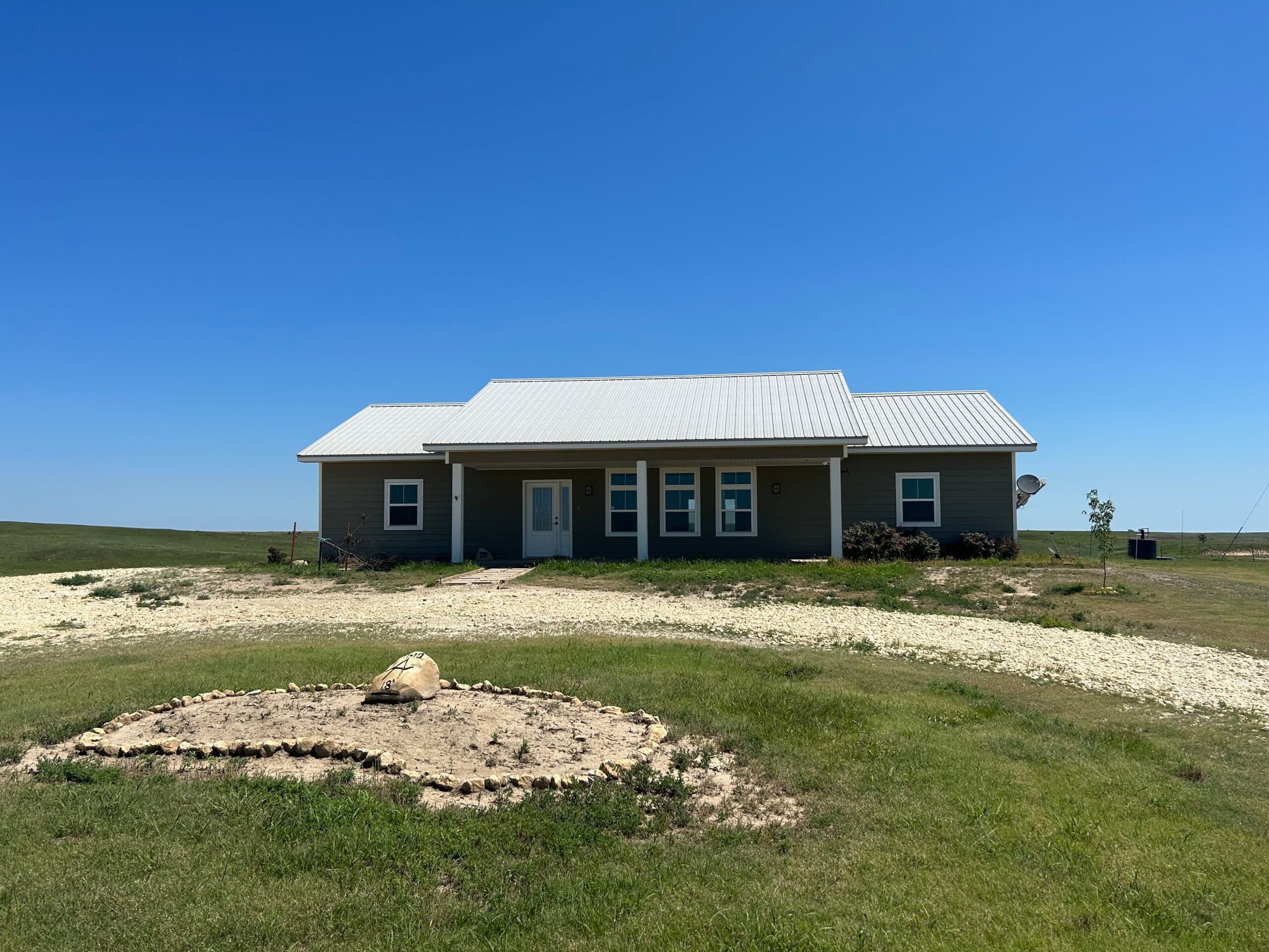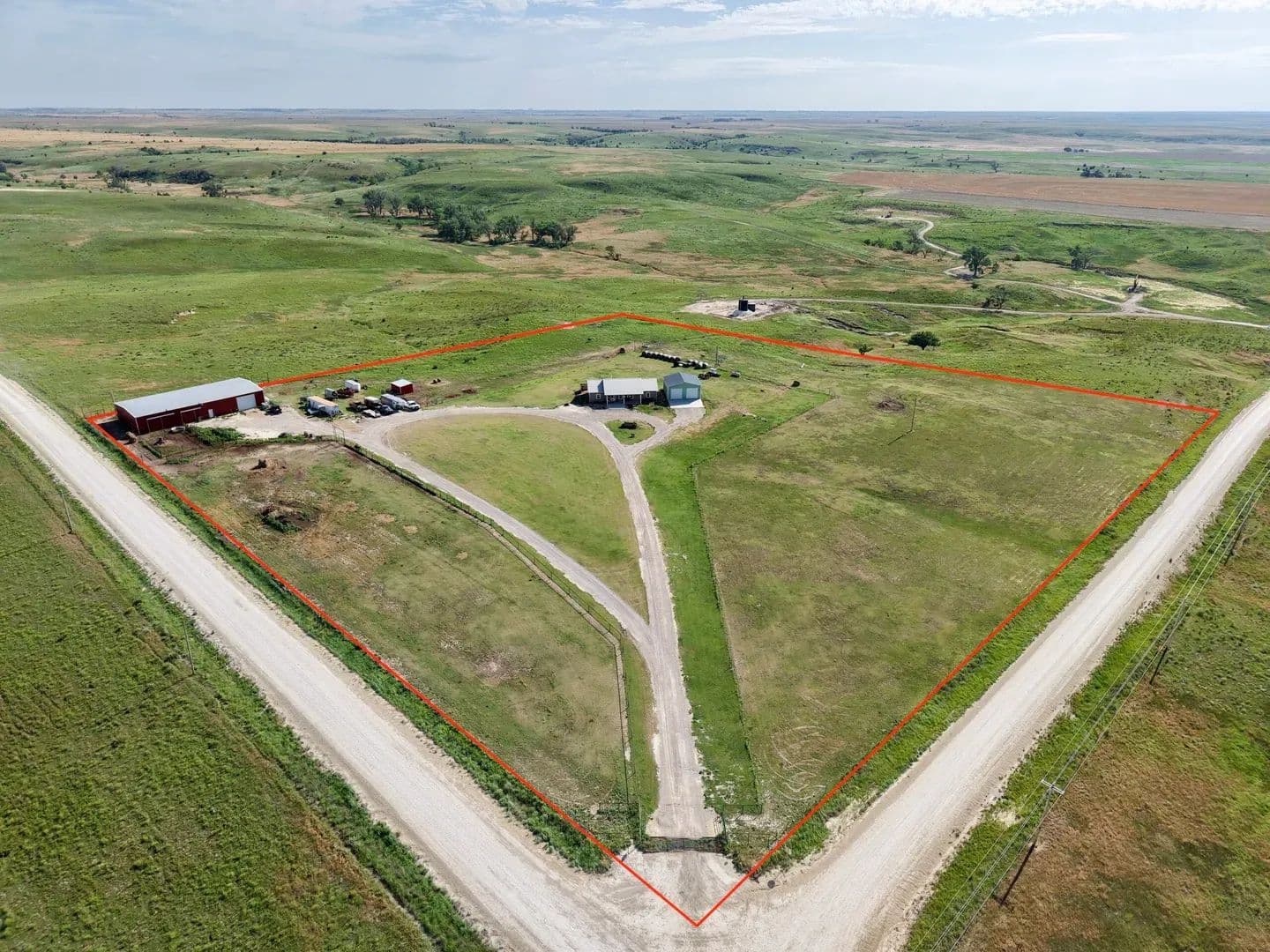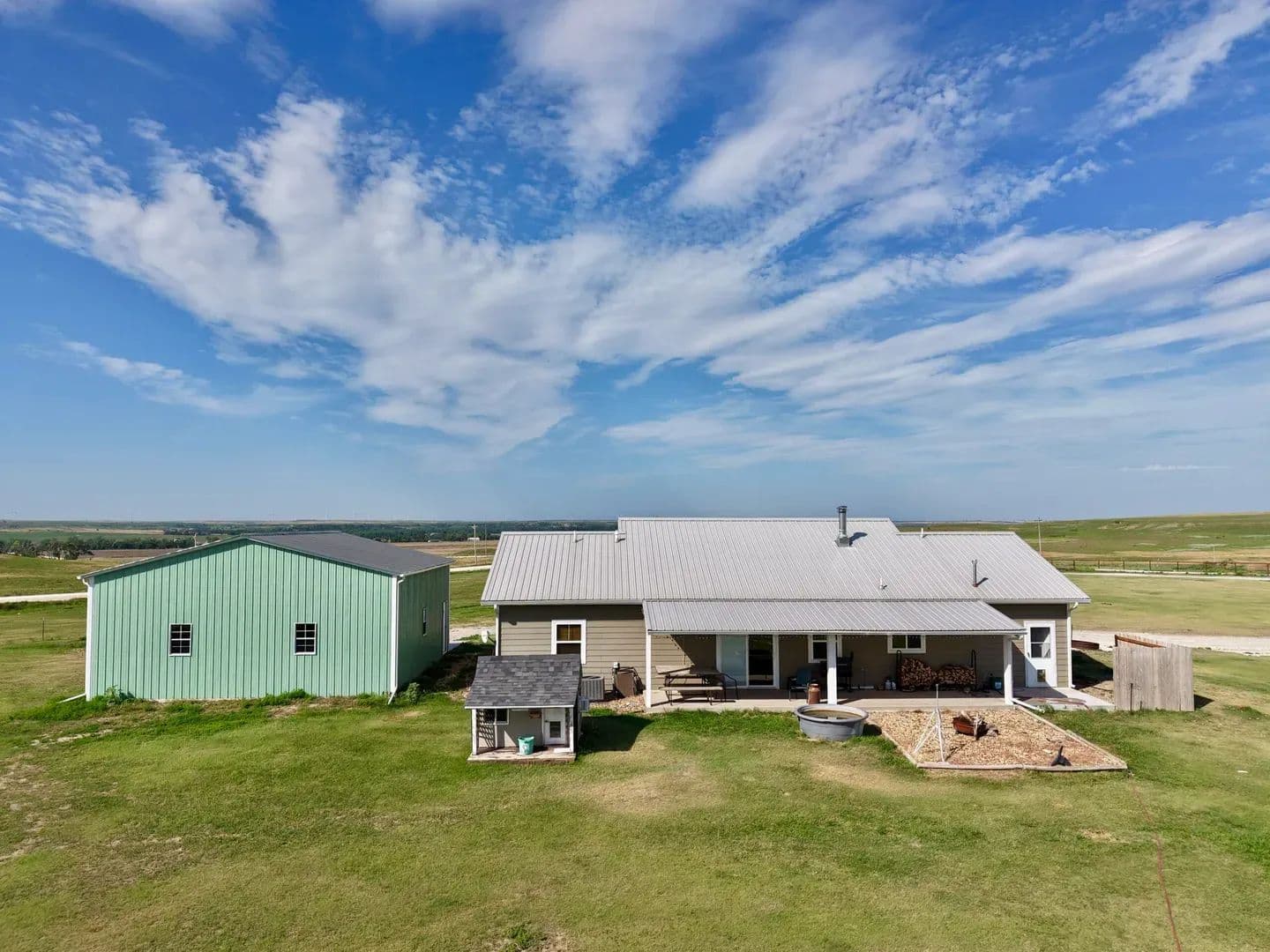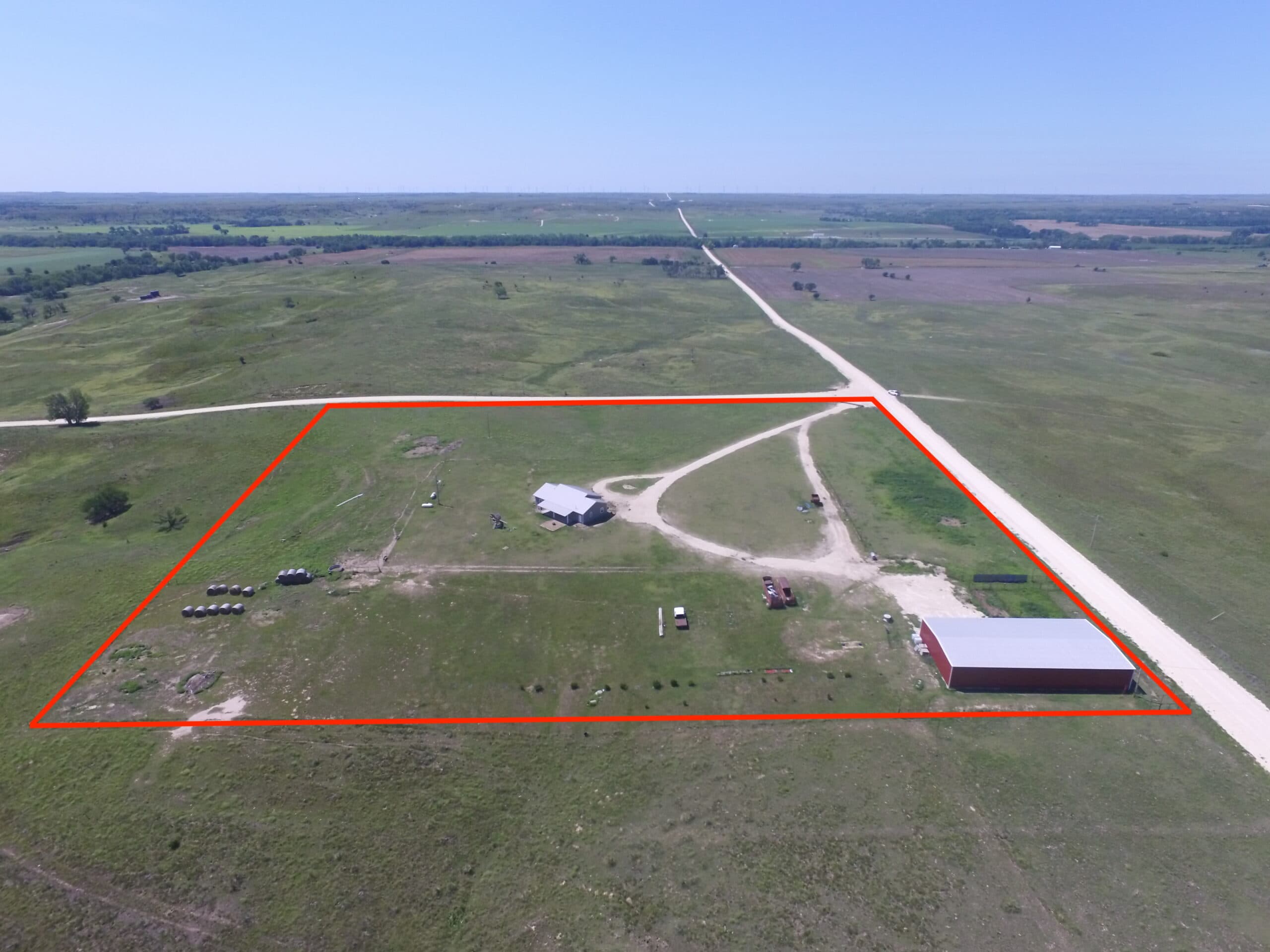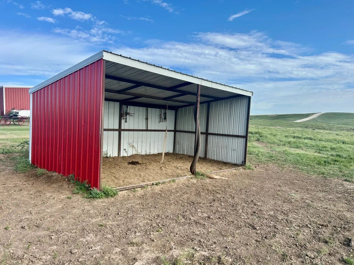This country property features a beautiful, move-in ready home, detached garage and a large shop located northwest of Hays, Kansas. Improvements Built in 2011, this Ranch style home has around 1800 square feet of finished living space. The home has a steel frame with a metal roof and concrete siding. It is highlighted by an open concept main room that has 18 foot vaulted ceilings and large windows that allow plenty of natural light. The home has 3 bedrooms and 2 bathrooms including the master suite. The master closet also serves as a concrete storm shelter. The home is on a water well, septic system and propane. There is also a reverse osmosis system. Enjoy the peace and quiet this property has to offer on either one of the two covered porches on the house.
