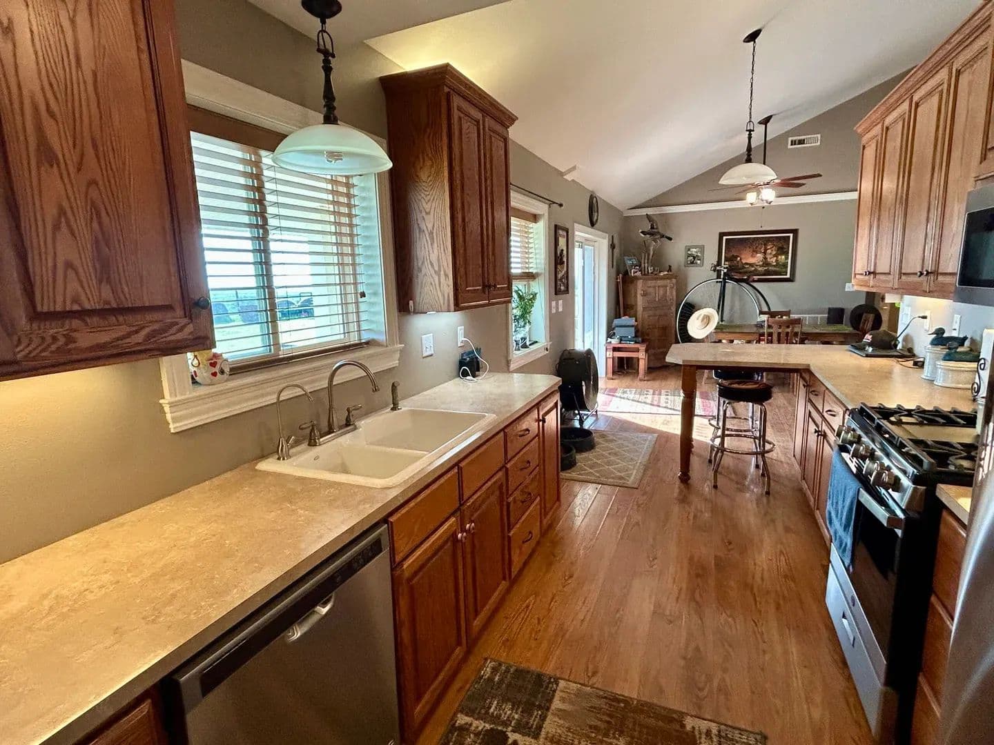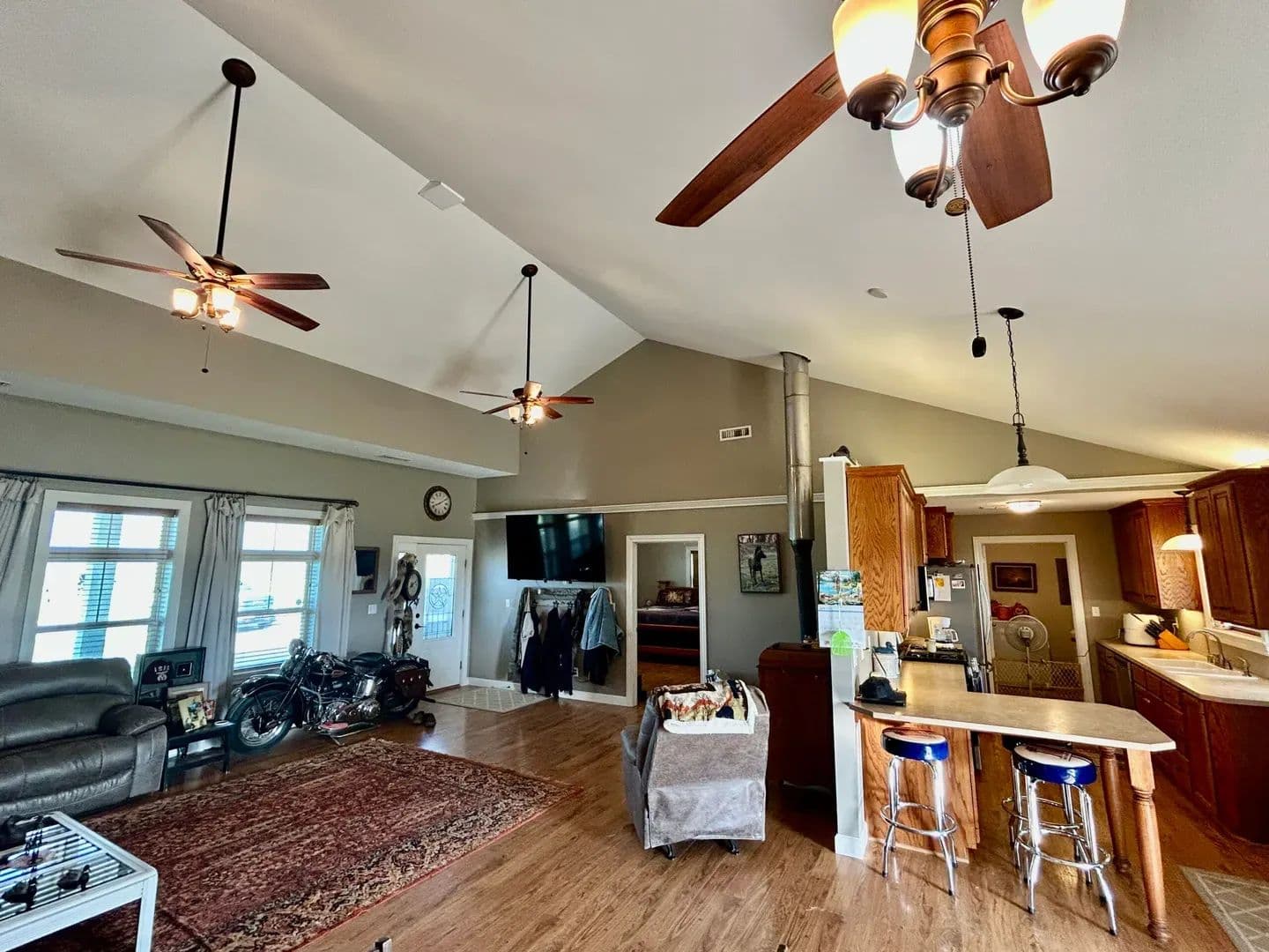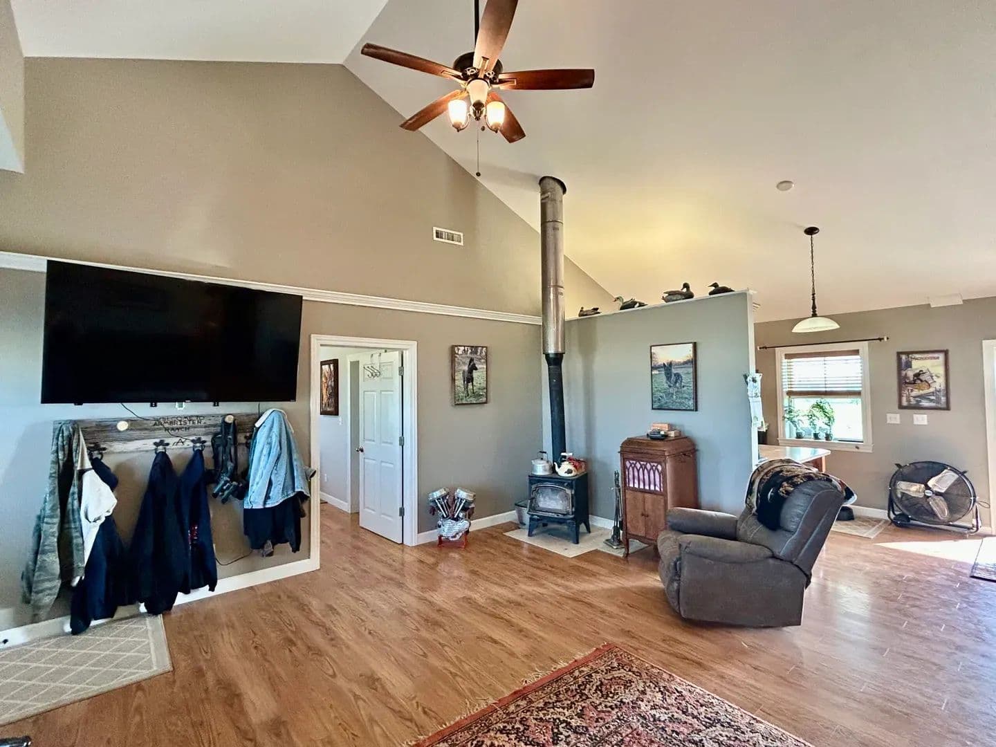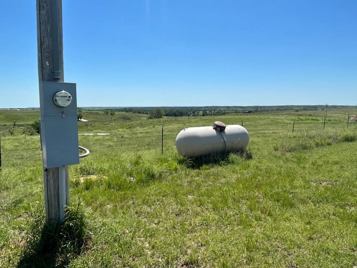 This country property features a beautiful, move-in ready home, detached garage and a large shop located northwest of Hays, Kansas. Improvements Built in 2011, this Ranch style home has around 1800 square feet of finished living space. The home has a steel frame with a metal roof and concrete siding. It is highlighted by an open concept main room that has 18 foot vaulted ceilings and large windows that allow plenty of natural light. The home has 3 bedrooms and 2 bathrooms including the master suite. The master closet also serves as a concrete storm shelter. The home is on a water well, septic system and propane. There is also a reverse osmosis system. Enjoy the peace and quiet this property has to offer on either one of the two covered porches on the house.