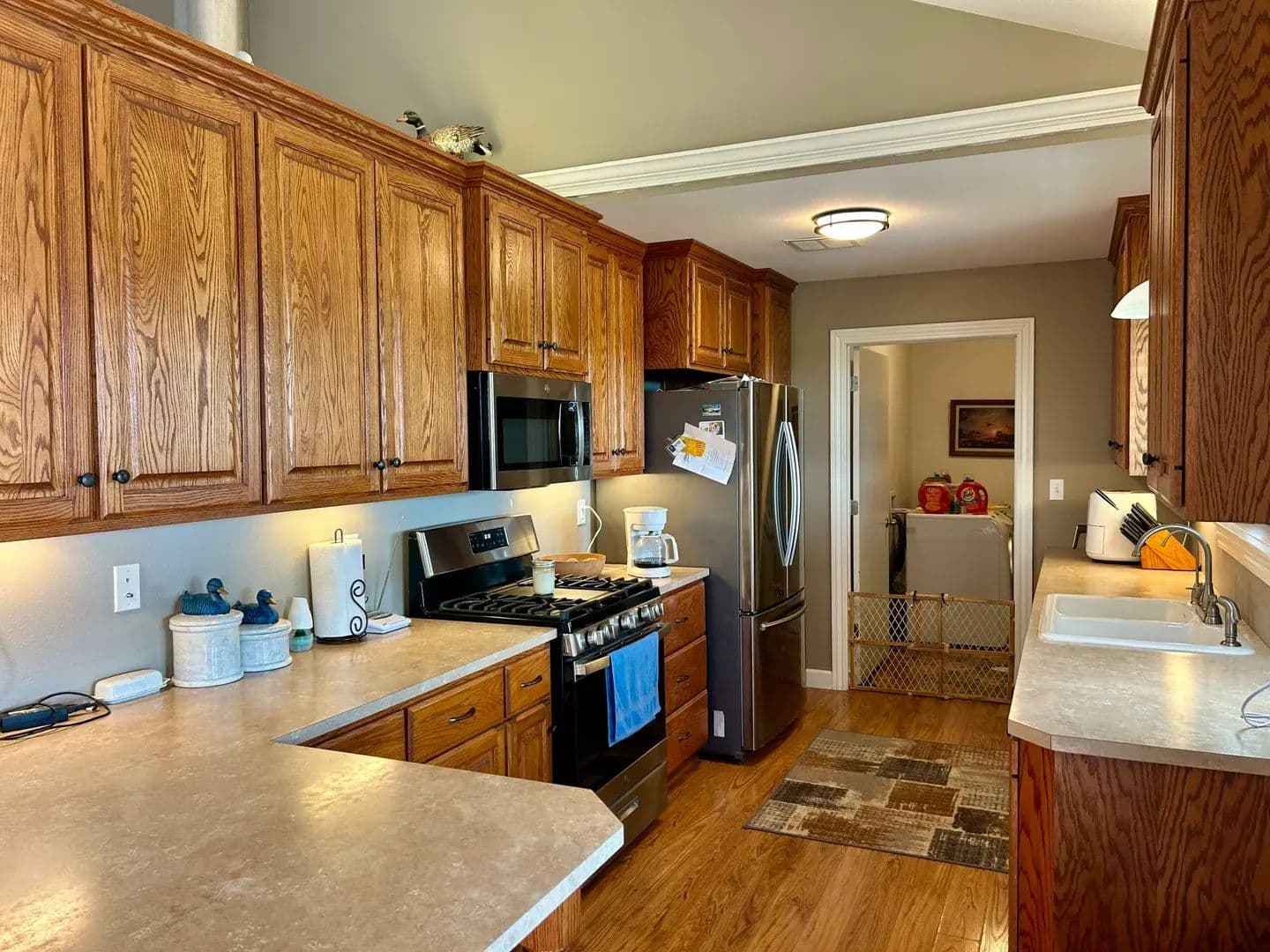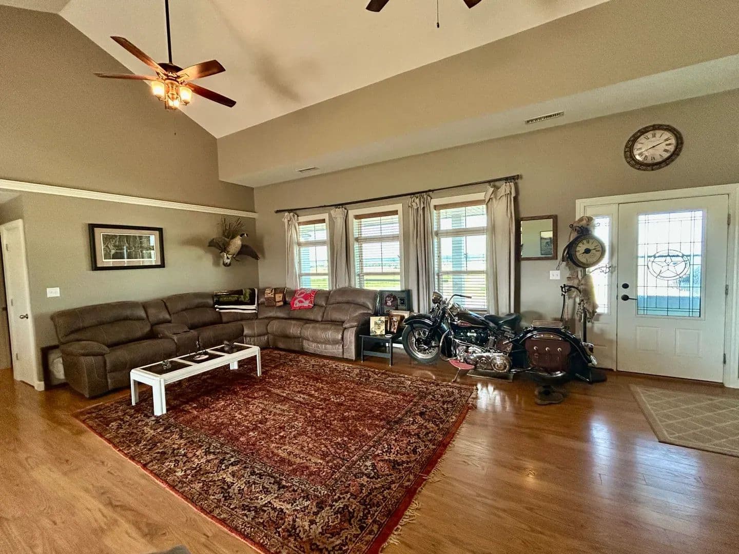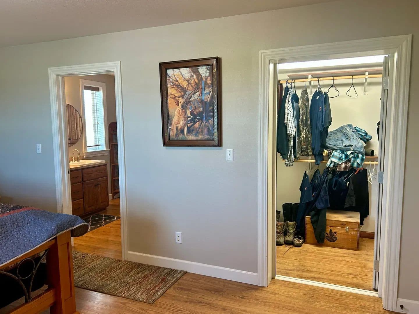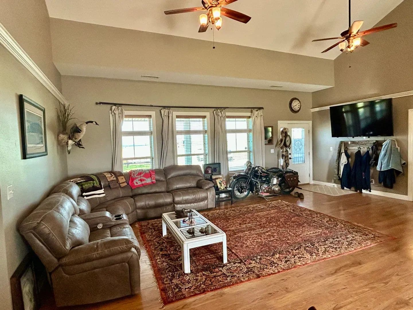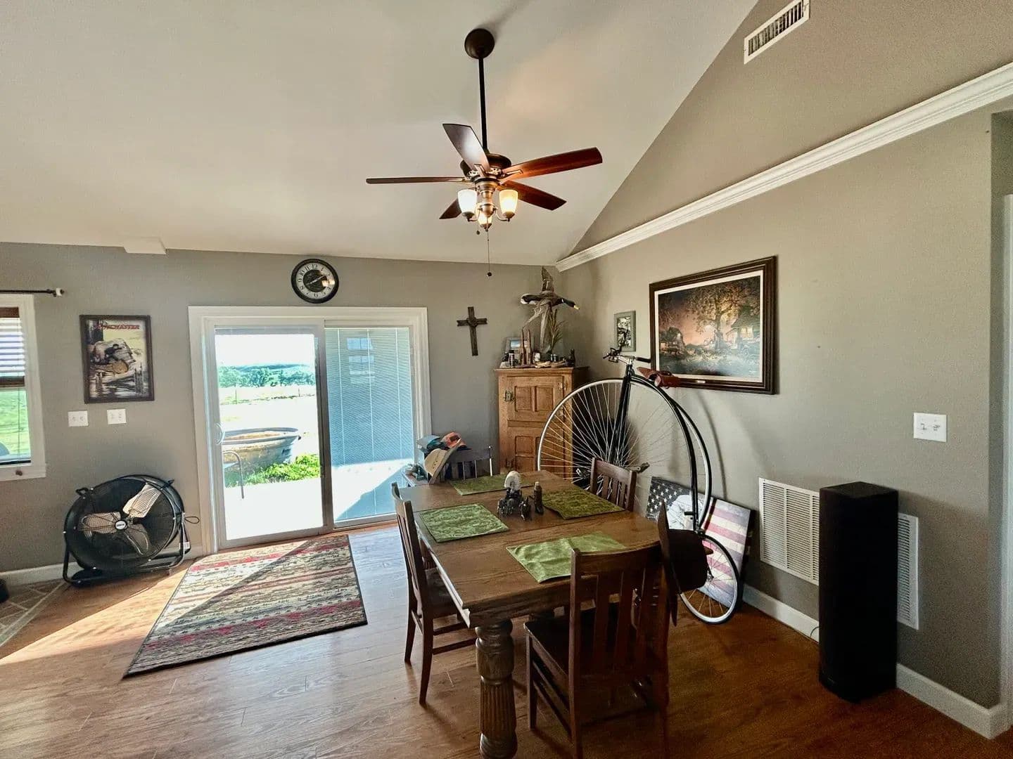 This country property features a beautiful, move-in ready home, detached garage and a large shop located northwest of Hays, Kansas. Improvements Built in 2011, this Ranch style home has around 1800 square feet of finished living space. The home has a steel frame with a metal roof and concrete siding. It is highlighted by an open concept main room that has 18 foot vaulted ceilings and large windows that allow plenty of natural light. The home has 3 bedrooms and 2 bathrooms including the master suite. The master closet also serves as a concrete storm shelter. The home is on a water well, septic system and propane. There is also a reverse osmosis system. Enjoy the peace and quiet this property has to offer on either one of the two covered porches on the house.