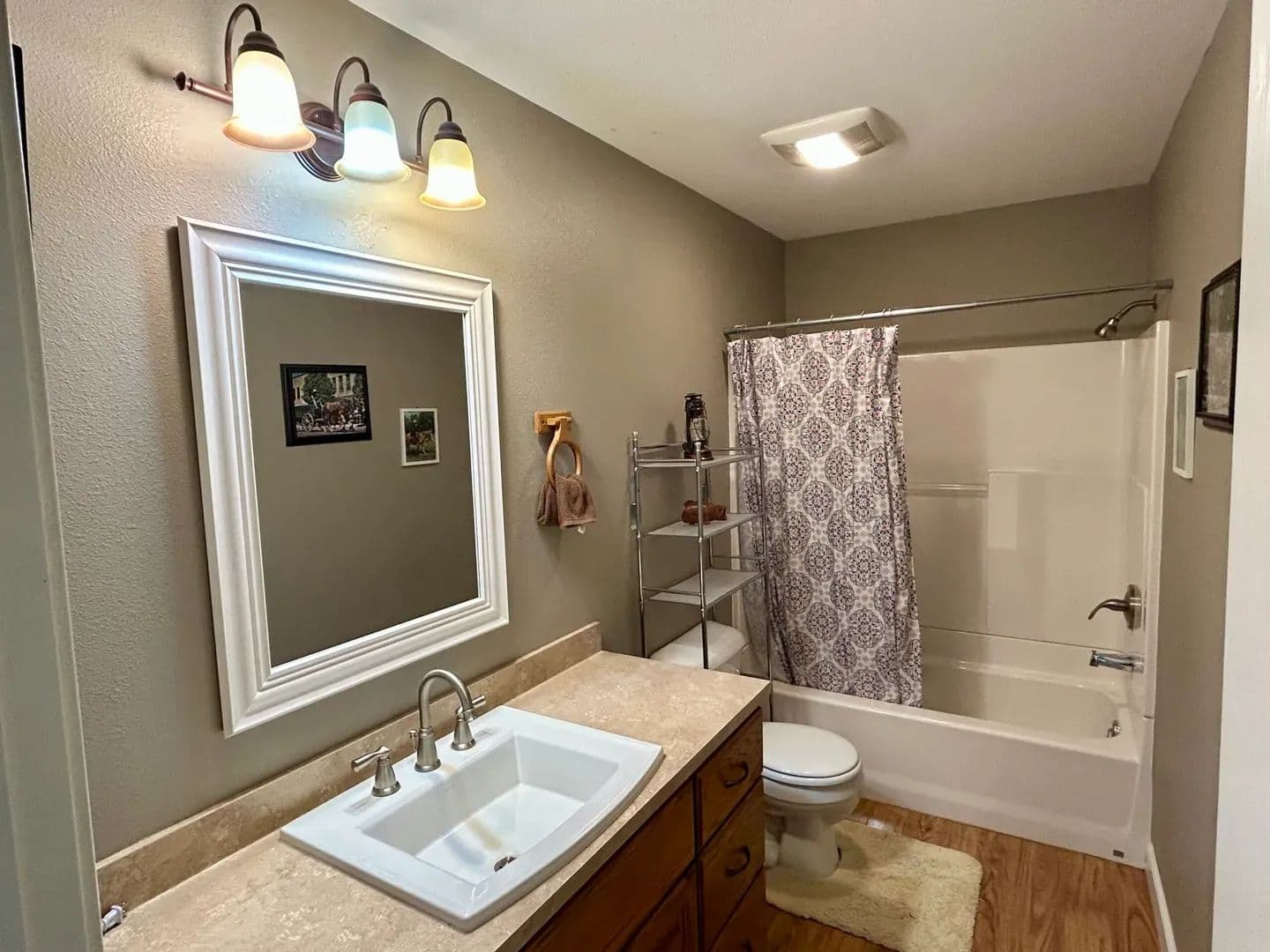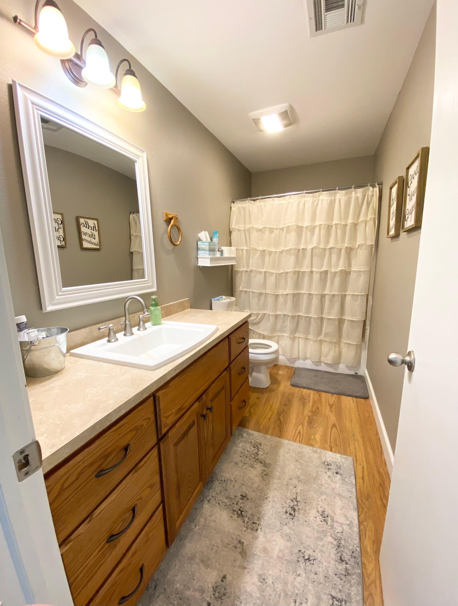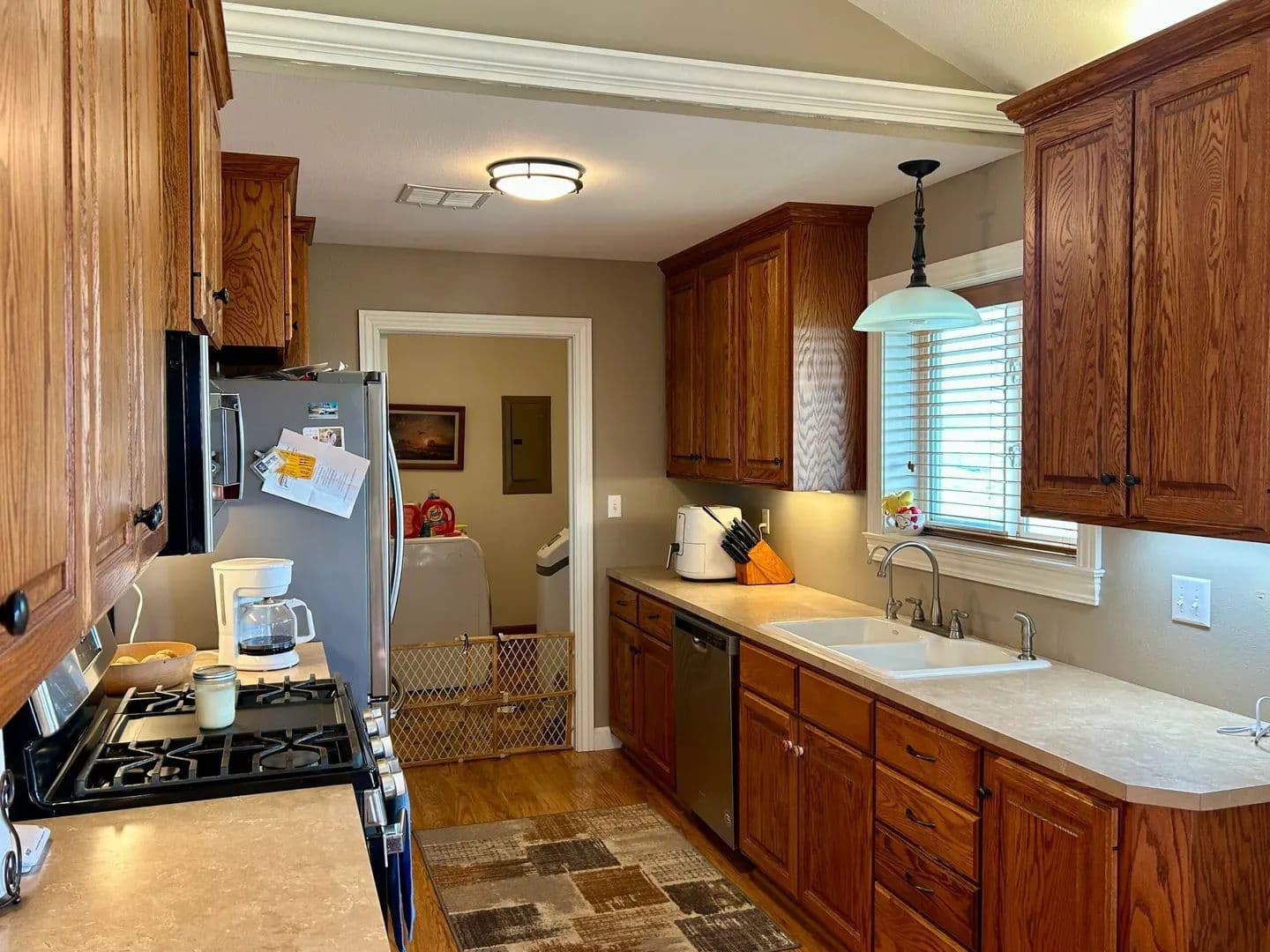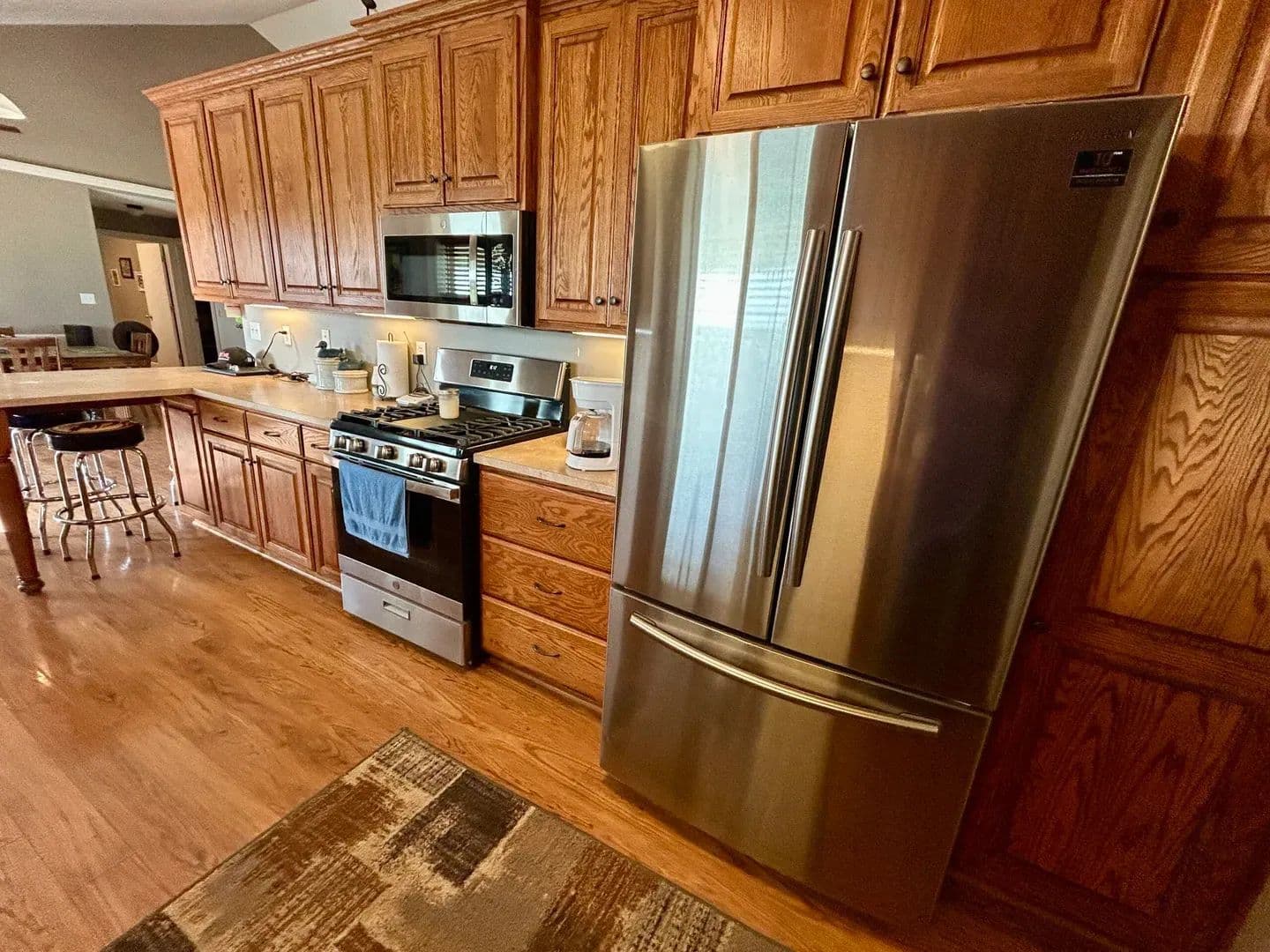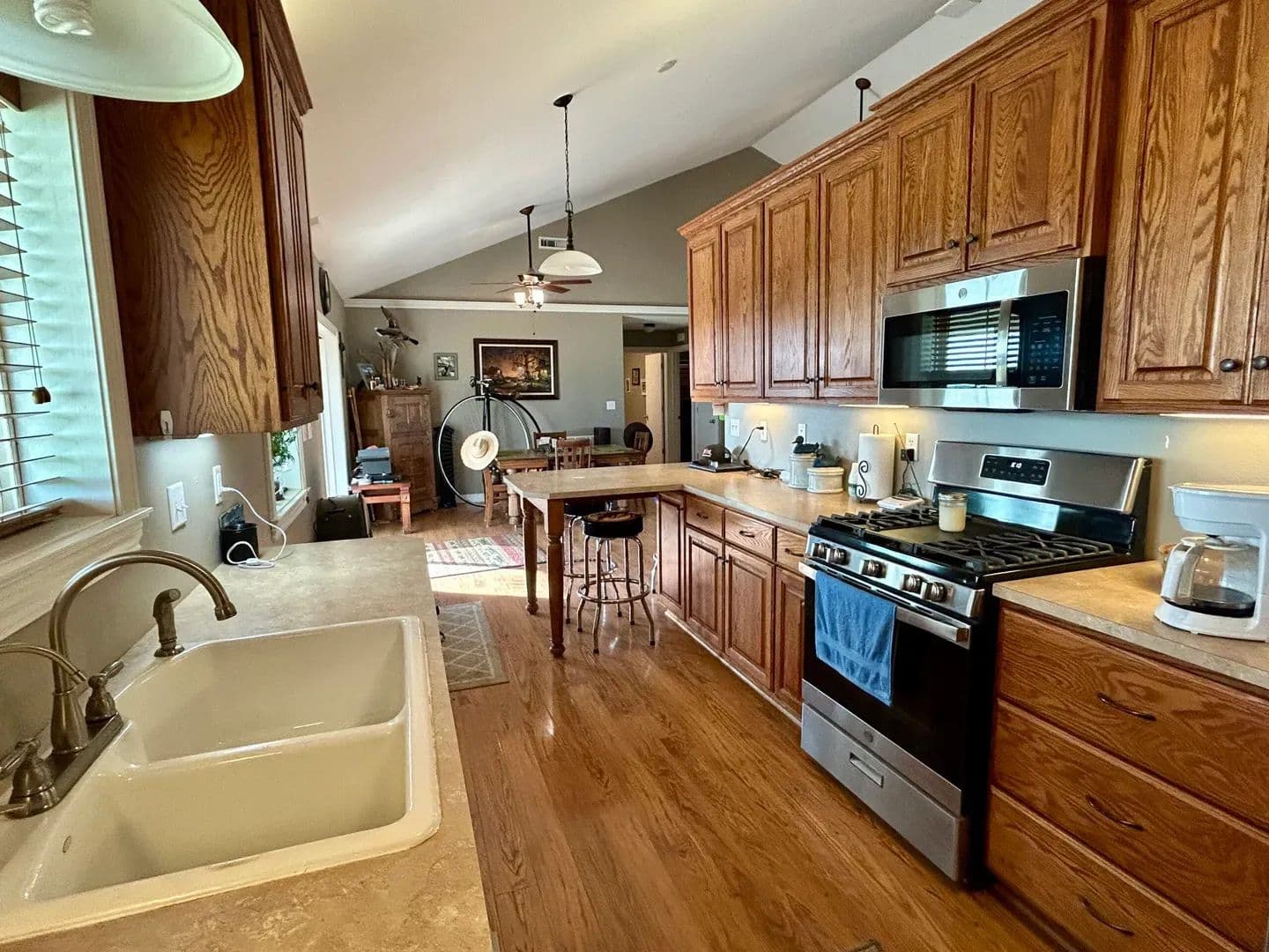 This country property features a beautiful, move-in ready home, detached garage and a large shop located northwest of Hays, Kansas. Improvements Built in 2011, this Ranch style home has around 1800 square feet of finished living space. The home has a steel frame with a metal roof and concrete siding. It is highlighted by an open concept main room that has 18 foot vaulted ceilings and large windows that allow plenty of natural light. The home has 3 bedrooms and 2 bathrooms including the master suite. The master closet also serves as a concrete storm shelter. The home is on a water well, septic system and propane. There is also a reverse osmosis system. Enjoy the peace and quiet this property has to offer on either one of the two covered porches on the house.