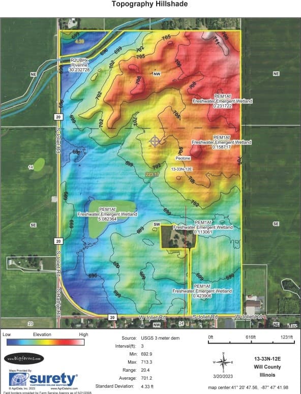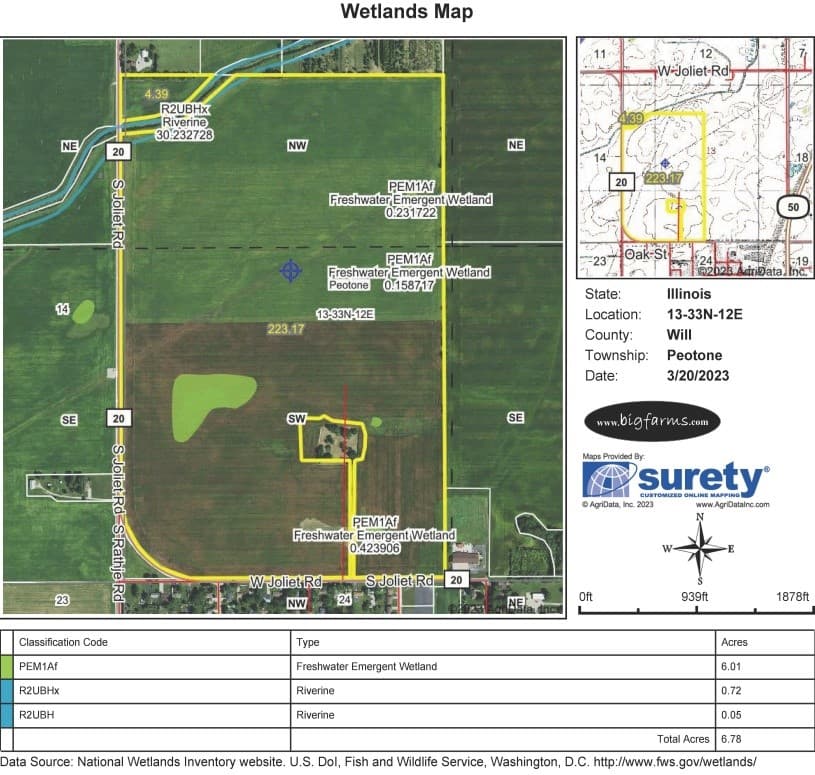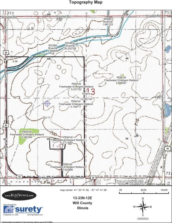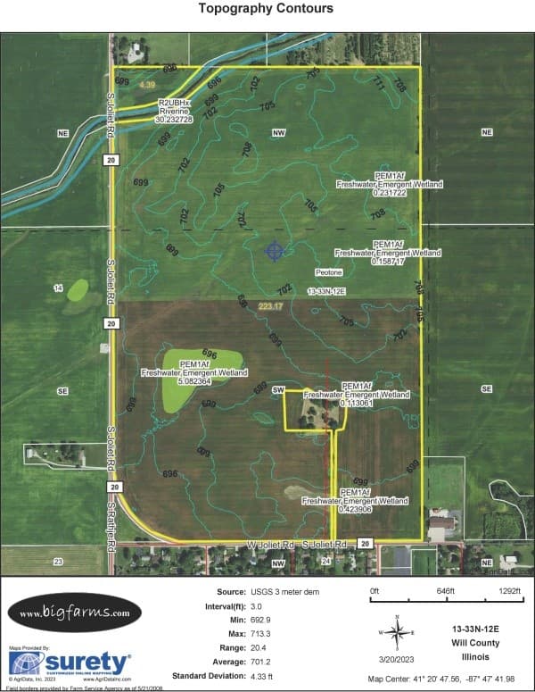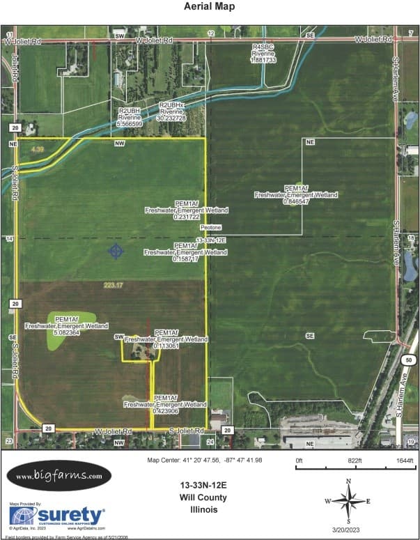 240 acres of vacant farmland for sale in Will County, IL. This property is a combination of three connecting parcels located just outside the city limits north of Peotone, IL. With an average Soil PI of 125.5, approximately 227.56 tillable acres, a large amount of road frontage/access, and close proximity to both a state highway and interstate, it is a prime location for continued agricultural use or possible redevelopment.