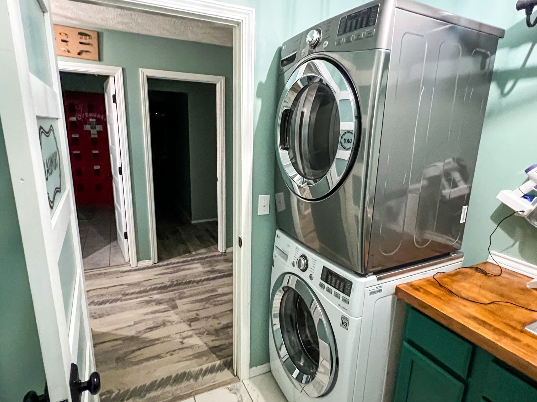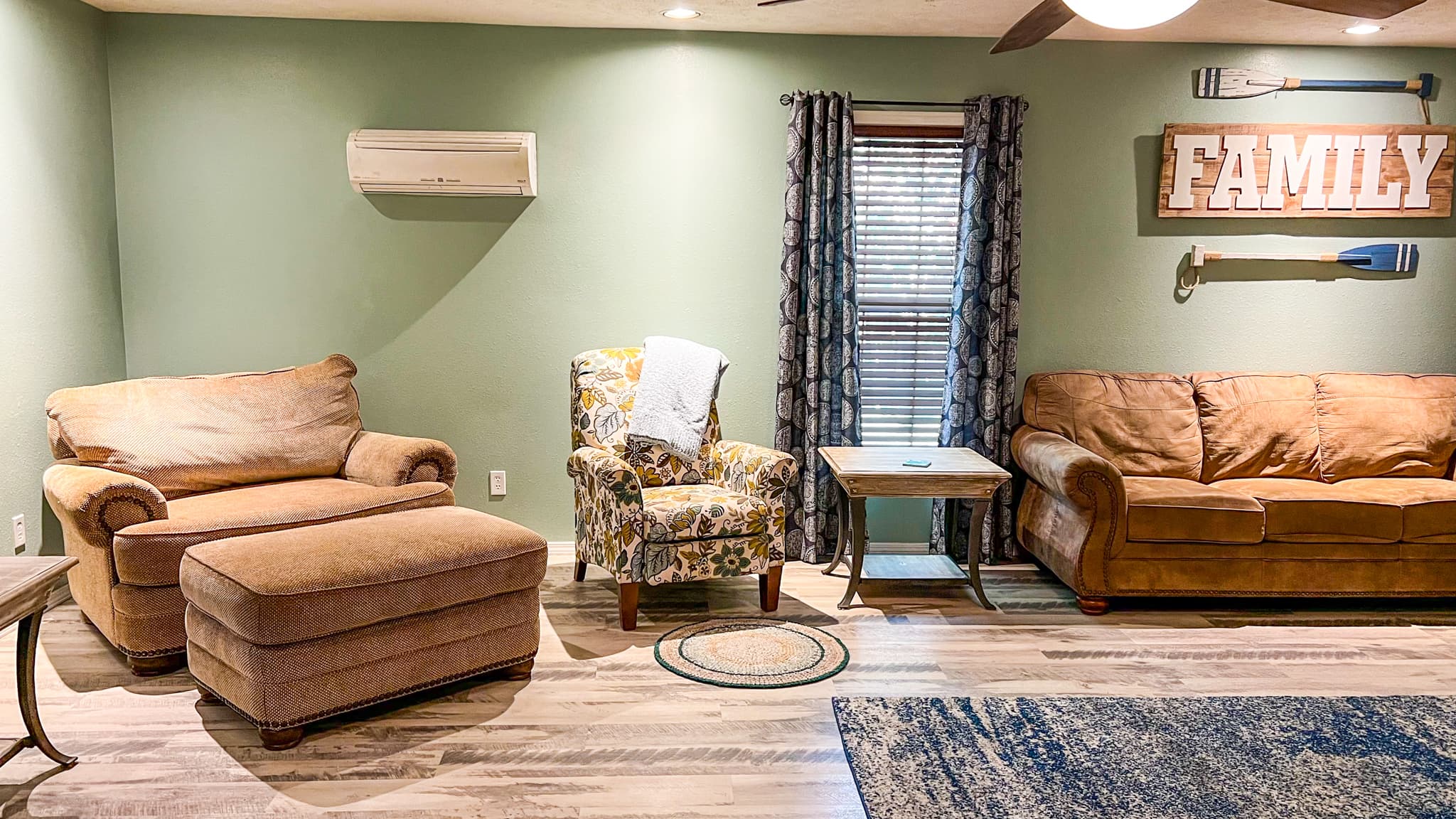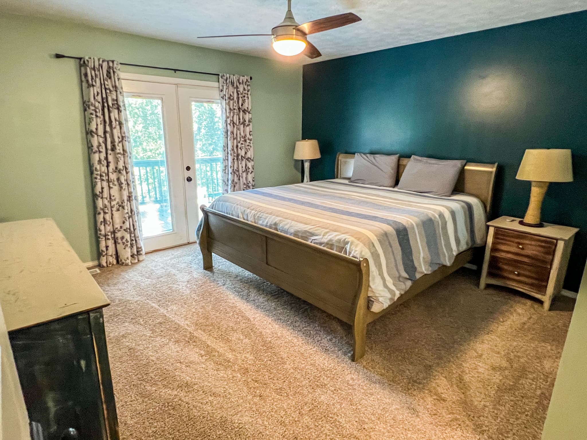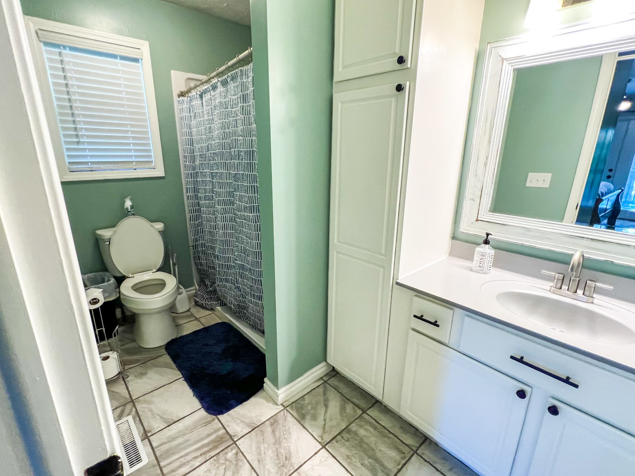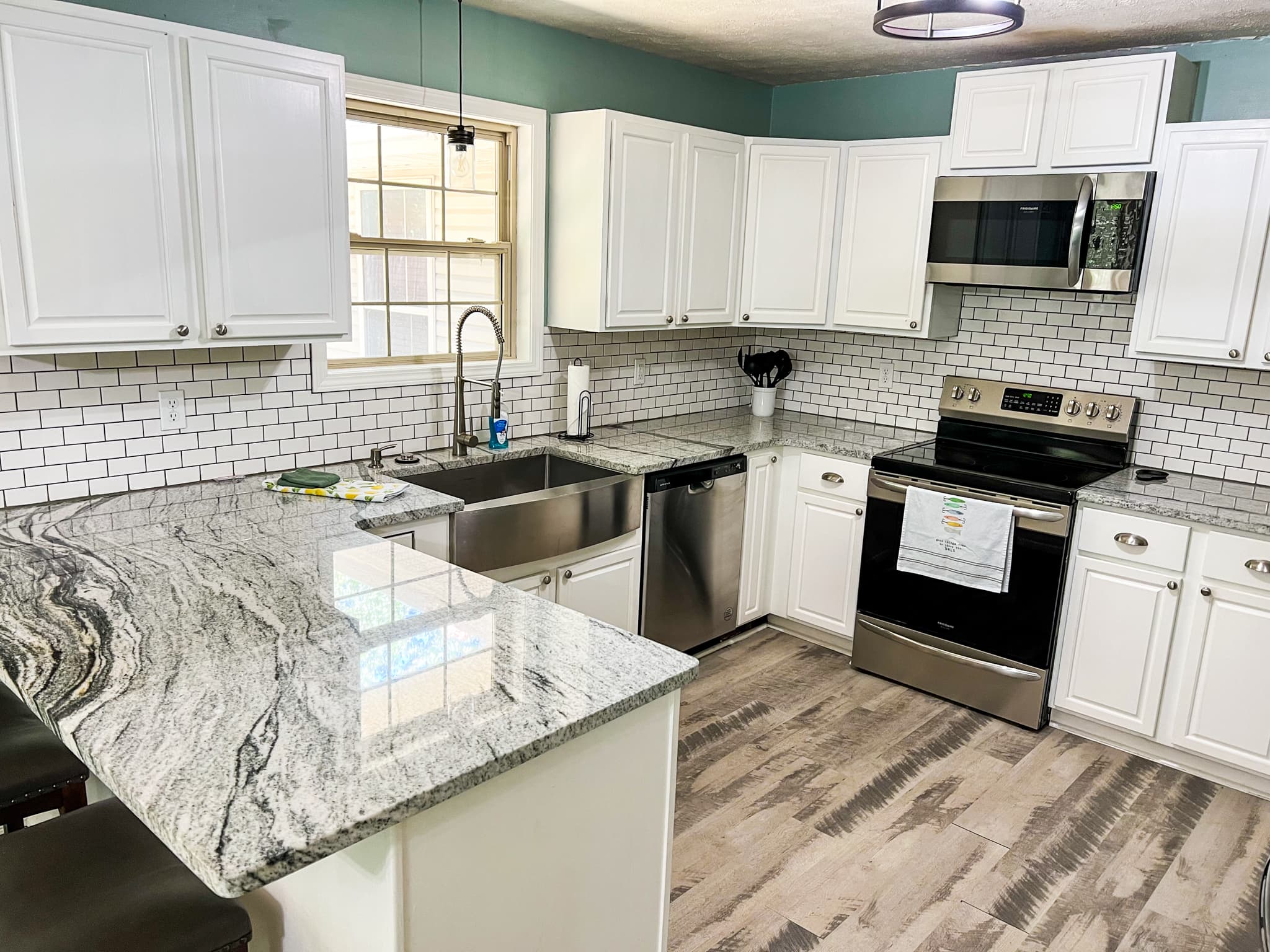 Inside is a gorgeous kitchen that has quartz countertops, tons of cabinet space, and a large stainless farm sink. The huge primary bed and bath features a large walk in closet, french doors that provide access to the deck, and the bathroom is tile with ample counter and storage space.  Additionally, there is a large 23×17 family room, laundry room, three additional bedrooms, and another bathroom.