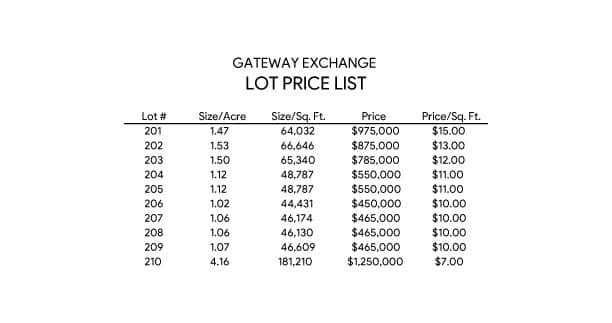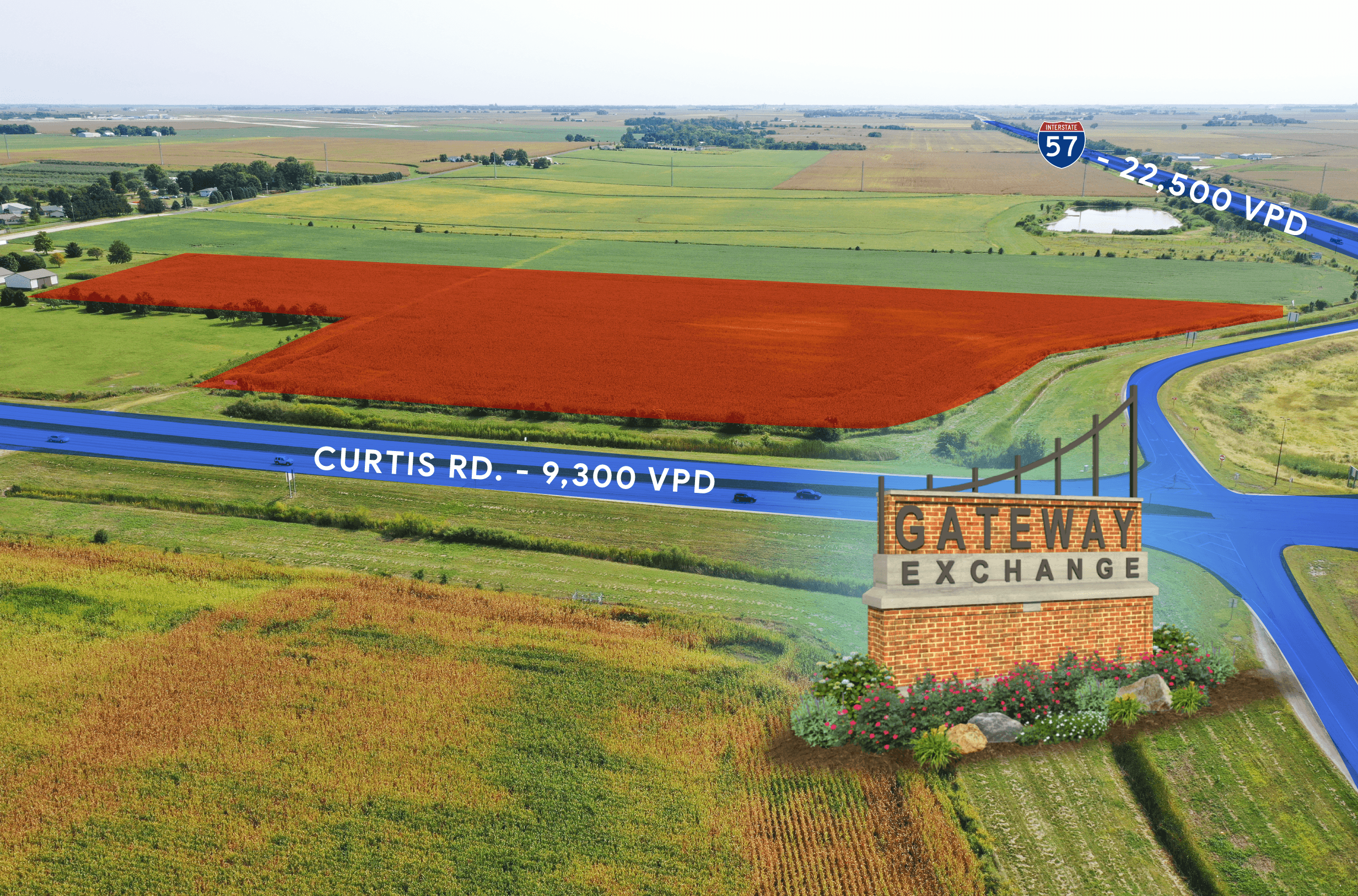 Gateway Exchange is a new development with interstate commercial lots for sale ranging in size from 0.84 to 4.16 acres. The development is located in the SE Quadrant of Interstate 57 and Curtis Rd. Access to Gateway Exchange will be from a signalized intersection at Curtis Rd. and the main entrance street.