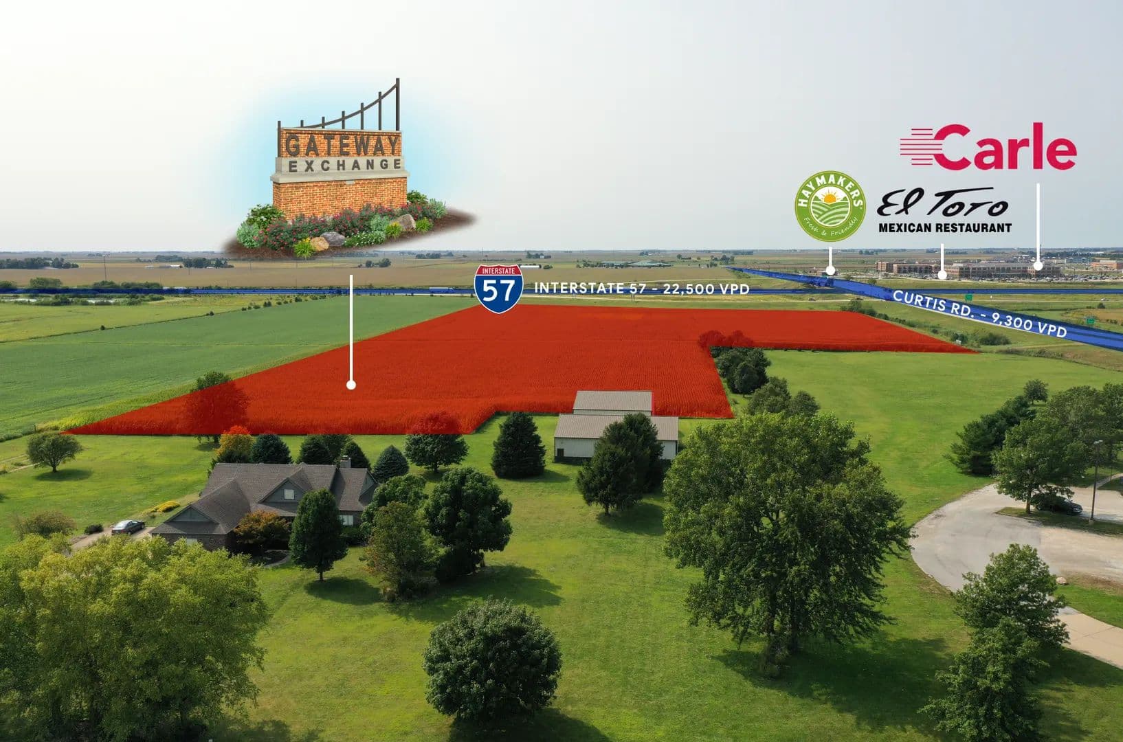 Gateway Exchange is a new development with interstate commercial lots for sale ranging in size from 0.84 to 4.16 acres. The development is located in the SE Quadrant of Interstate 57 and Curtis Rd. Access to Gateway Exchange will be from a signalized intersection at Curtis Rd. and the main entrance street.