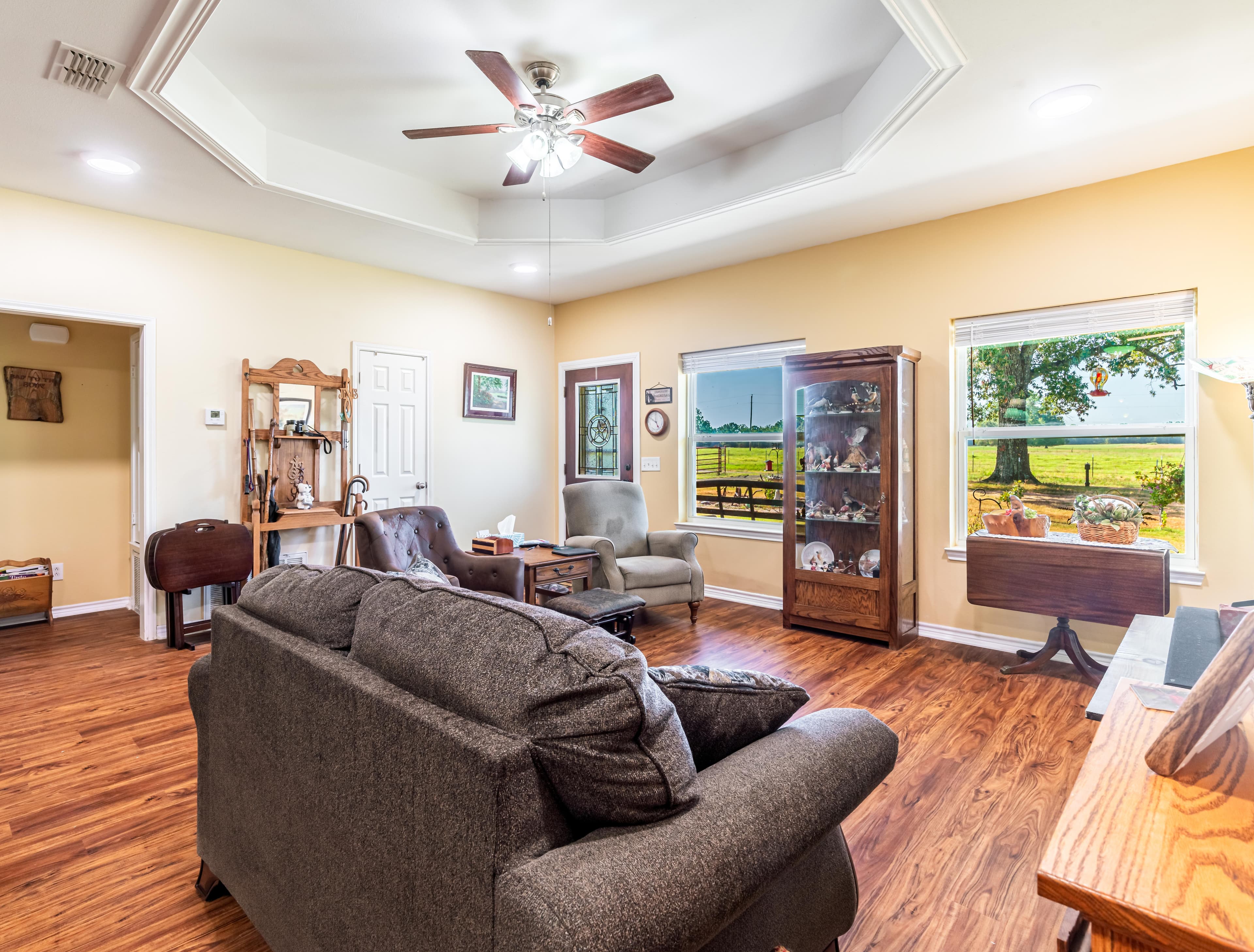 Situated on 25 + beautiful acres you will find this exquisite metal custom built home. Capable of being used for a hobby farm, this property has it all! Main improvement is a custom-built country home with gorgeous wood floors throughout. Very clean open Livingroom/kitchen combo. Kitchen is outfitted with stainless steel appliances, granite countertops and cherry cabinets. Primary bedroom has nice size closets with a walk-in garden tub in bathroom. Utility and sunroom combo works perfect for the farm life with its mudroom sink and food storage.