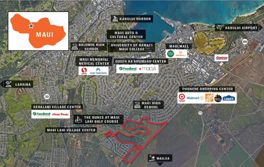 Cushman & Wakefield ChaneyBrooks is excited to offer 192± entitled acres within the Maui Lani master planned community in Kahului, Hawaii that allows for up to 1,900 residential units. The project benefits from a highly desirable location with frontage on The Dunes at Maui Lani Golf Course and existing entitlements, allowing for a mix of residential and commercial uses.