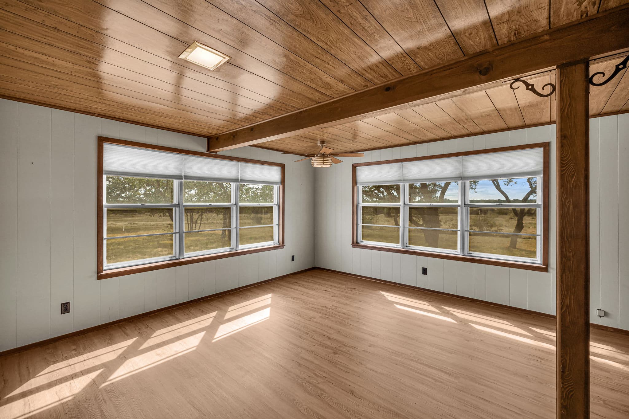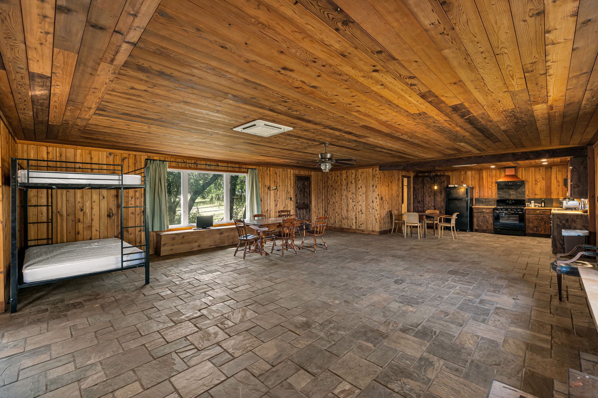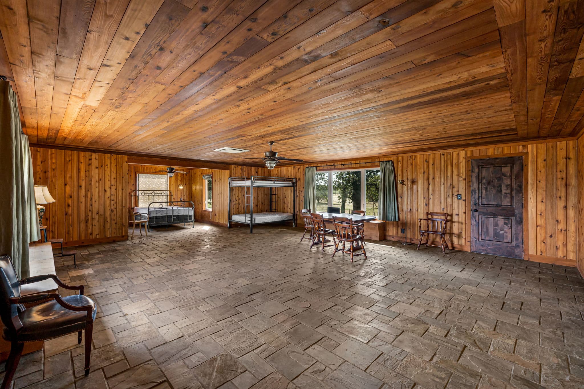 IMPROVEMENTS: A main house and a cabin make up the sleeping quarters on the ranch. The main house is a ranch style home on slab foundation comprised of 3 bedrooms and 2 bathrooms. Approximately 2,600 square feet it has multiple living areas, kitchen dining, full kitchen, separate washer/dryer room, and an office. Recently updated with new "life proof" floors this house will comfortably sleep 10 or more adults and has an indoor fireplace for the colder months. The main house is fully high fenced has it's own dedicated water well, carport, and garage outbuildings. The cabin (~800 square feet) overlooking the pond is one large room with kitchen and bathroom. Currently 4 bunk beds make up the sleeping availability but much more could be added. Slate flooring, wood paneling, updated kitchen and bath highlight the great features of this cabin. This ranch has two metal barns with covered parking areas and garage areas with roll up metal doors. All the improvements have electric running to them and a SW Electric Co-op line runs diagonally through the middle of the ranch. Pipe pens with separate traps and loading pens are located at the center of the ranch for easy pasture rotation and livestock handling.