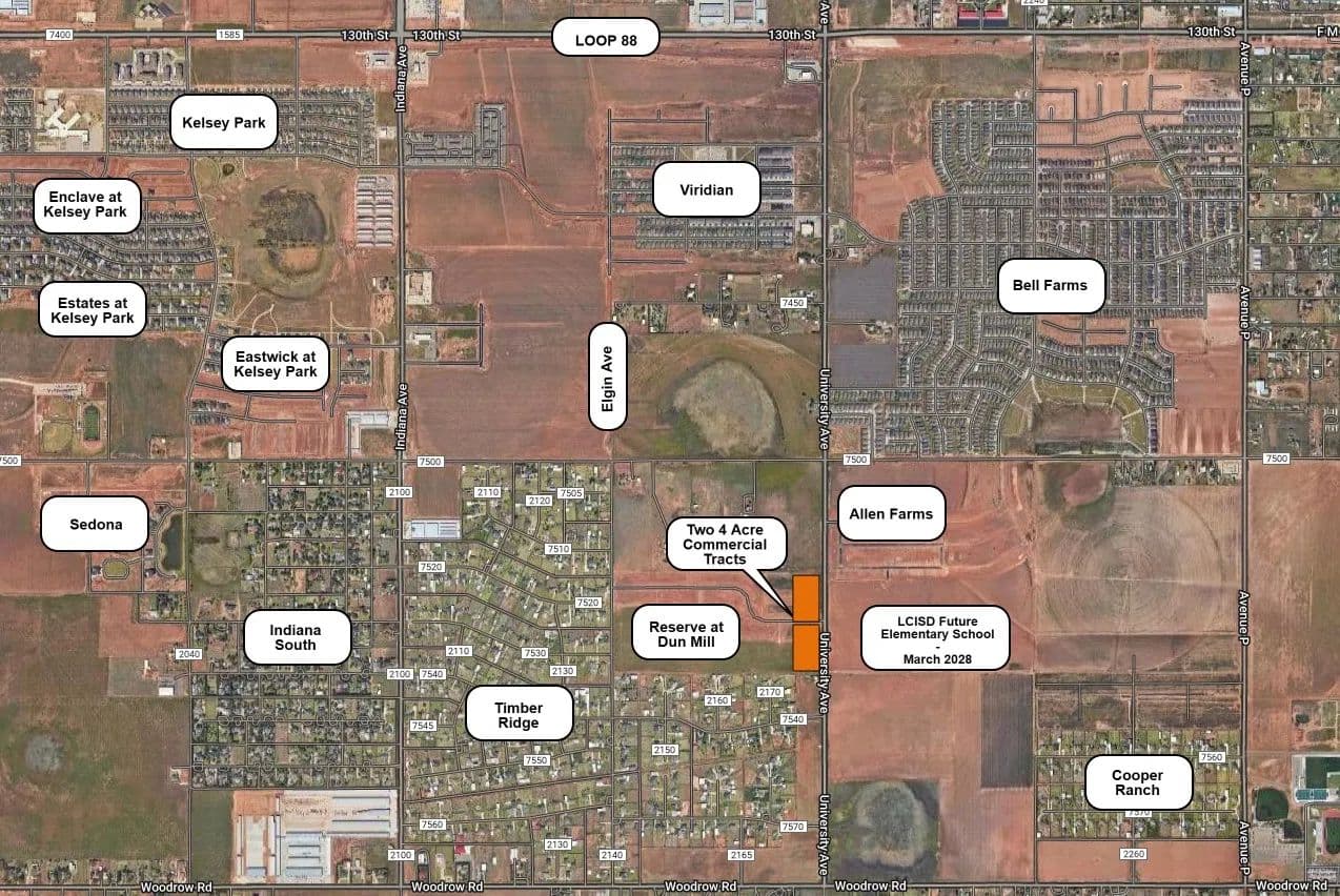 Utility extensions have been made to the site (septic systems will be required) and the development site is located in the Lubbock Cooper Independent School District. A recent bond election resulted in the planned construction of LCISD's sixth elementary school, scheduled for completion in 2028 on 152nd Street, just to the east of University Avenue. Other residential subdivisions in the area around the offering include Allen Farms, Bell Farms, Timber Ridge, Cooper Ranch, Indiana South, Kelsey Park, and Viridian.