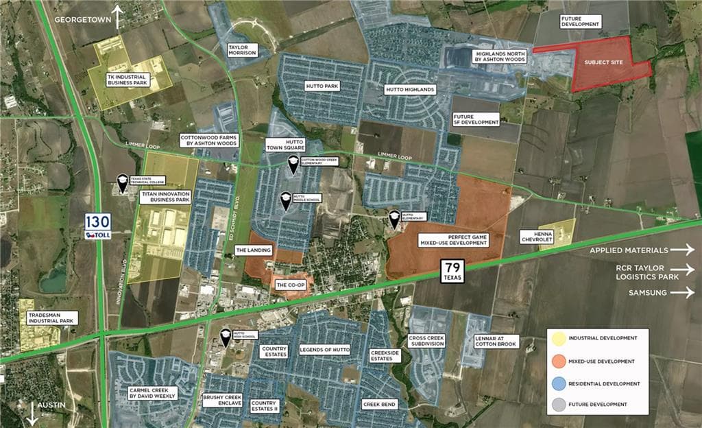 Superb location in booming Hutto off CR 132 surrounded by development. Williamson County Tax ID R020309 contains the 110.95 AC carved out of the Klaus Farms Ltd tract, which is a rare find totalling 247.8 AC. Please see Survey for exact boundary lines of the 110.95 AC being sold. This acreage has access on CR 132. Tax ID R325954, also owned by Klaus Farms Ltd, has 11.437 AC at 2051 CR 136 (AKA Limmer Loop). Additionally, Tax ID R505224, also on CR 136, has 1.763 AC and is under personal ownership by Mr. Klaus. Tax ID R325378 (5519 Limmer Loop), also under personal ownership, has .5 AC where the family home is located. DO NOT DISTURB RESIDENTS - FAMILY OF OWNER LIVES THERE. The Buyer of the 110.95 AC will have first right of refusal on the remaining land (150.55 AC) when Klaus Farms Ltd is ready to sell. The new owner would then have access on both CR 132 and CR 136/Limmer Loop. Alternatively, Klaus Farms Ltd and Mr. Klaus would be willing to sell the entire 261.5 AC if the offer price is compelling. Please contact agent.