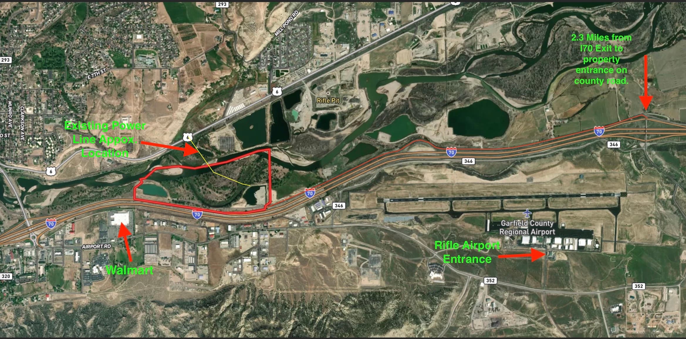 Oxbow Landing includes approximately 3/4 of a mile of Colorado river frontage, 3/4 of a mile of Interstate 70 frontage, 11+ acres across two lakes, and a total of 122 acres of property. Access is easy for large vehicles, with a short 2.3 mile drive on a quiet county road to the nearest I-70 interchange. Oxbow Landing is located in unincorporated Garfield County, zoned ''Rural''. The city of Rifle borders the property on multiple sides. There is an existing power line that comes onto the property from the north. There are several potential uses, ranging from an RV park/campground, residential home, wetlands mitigation bank, and/or recreational water activities. The best use may be to combine several of these: An RV park, cable-powered wakeboarding park, stand up paddle-board (SUP) rentals, fishing rentals, owner’s quarters, and a small wetlands mitigation bank could all be combined to generate a viable business.